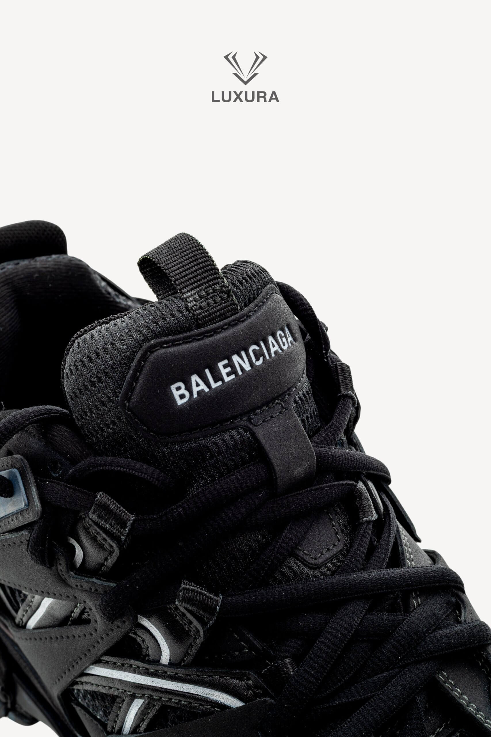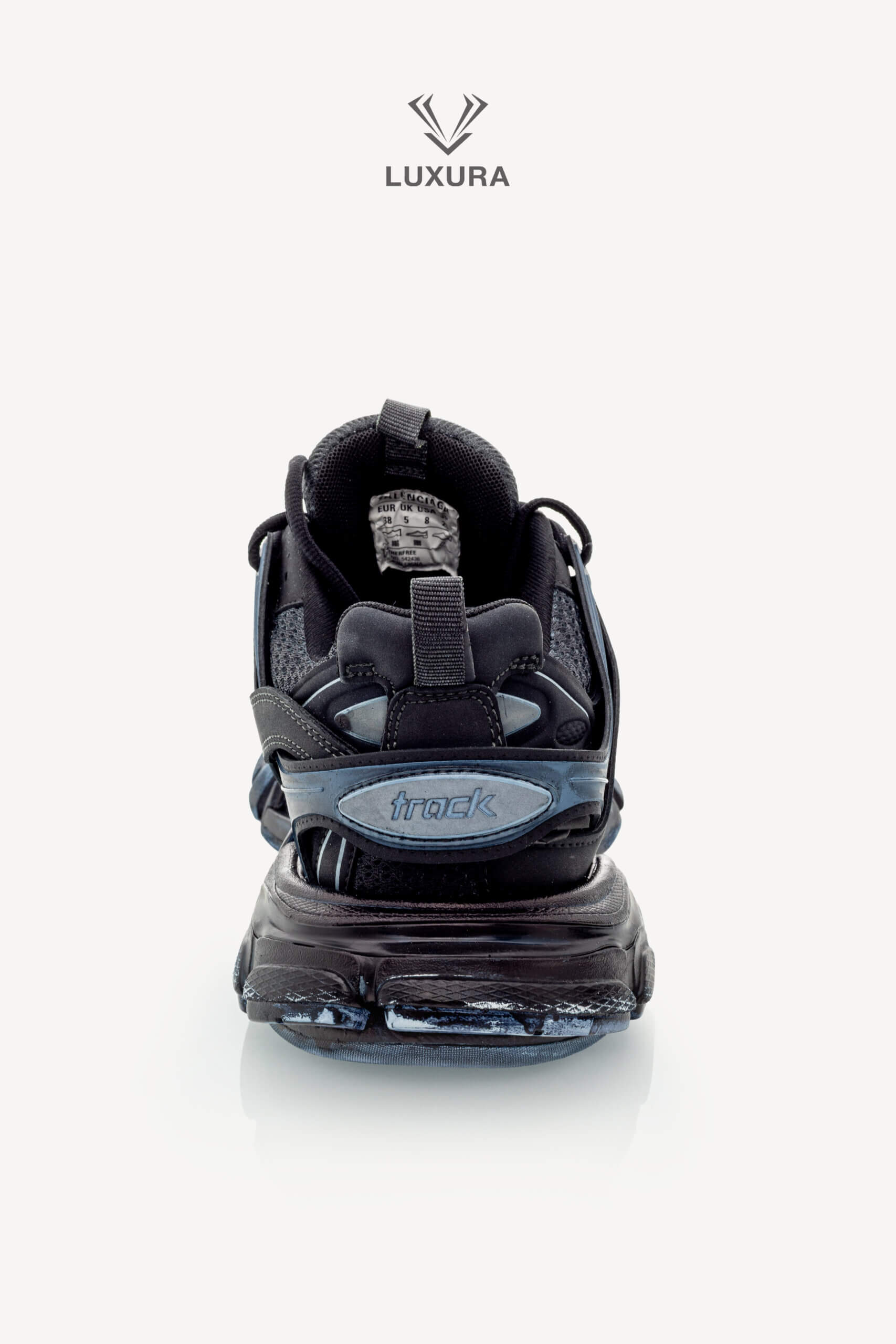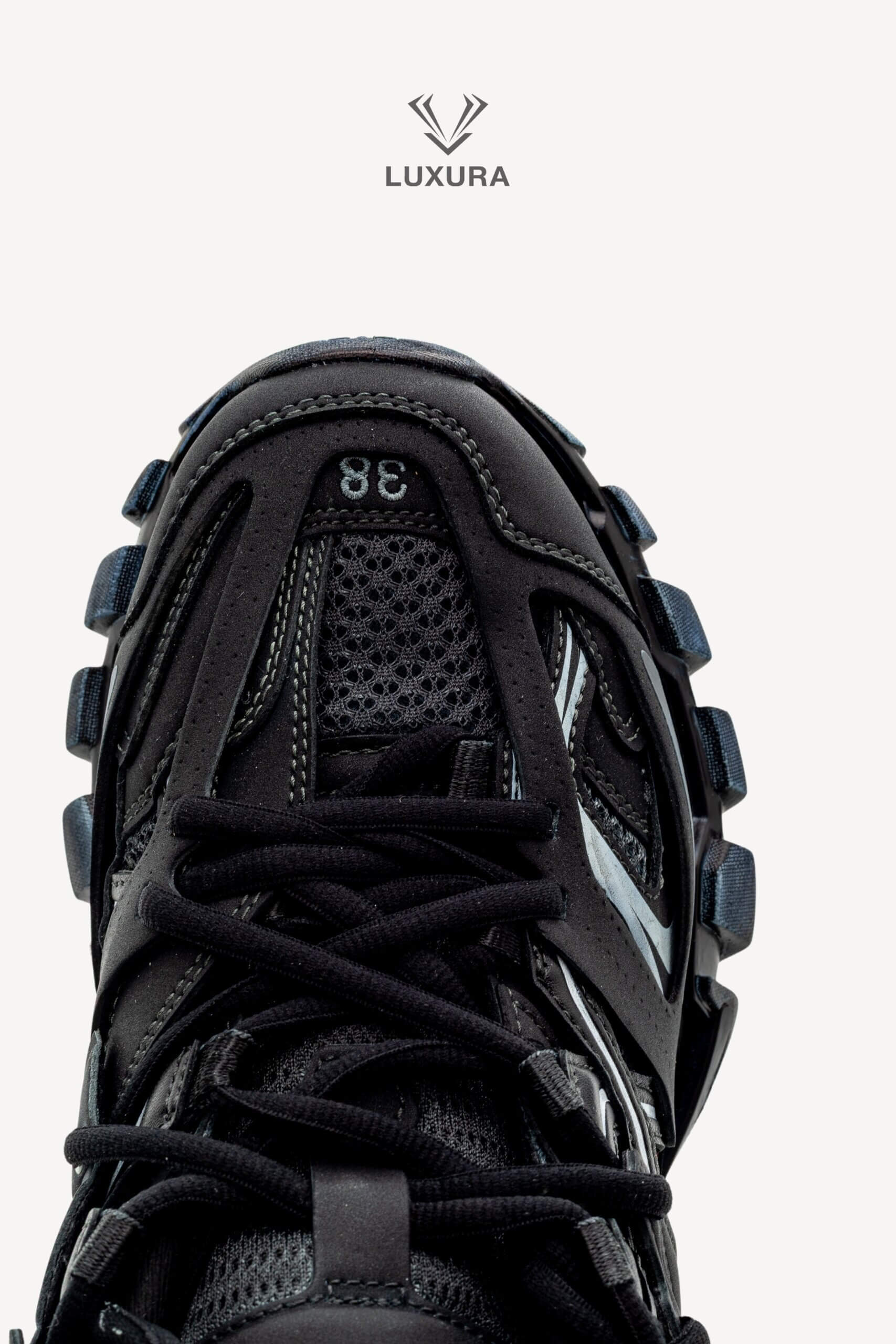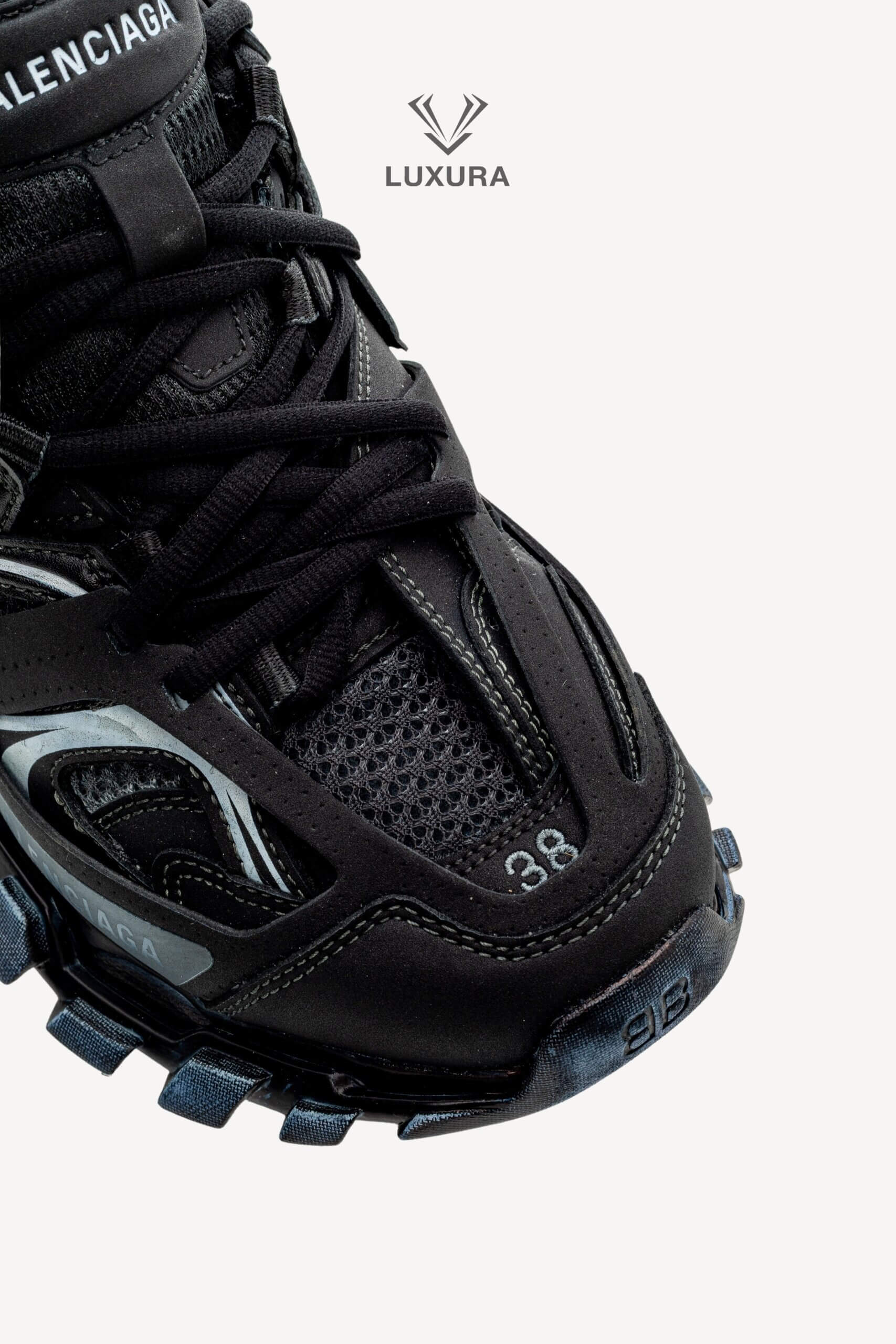 Pantofii BALENCIAGA Track Lace-up în culoarea neagră, mărimea 38 (25 cm), sunt confecționați din material textil și PVC, cu detalii hardware negre. Produsul este pre-owned, autentificat și se află într-o stare impecabilă, complet nou, livrat în ambalajul original care include cutia producătorului, dust bag și certificat de conformitate. Acest model oferă o potrivire true size și este disponibil exclusiv online prin platforma independentă Luxura Elite, fără afiliere cu brandul BALENCIAGA. Încălțămintea combină funcționalitatea cu un design distinctiv, specific identității brandului de lux contemporan.