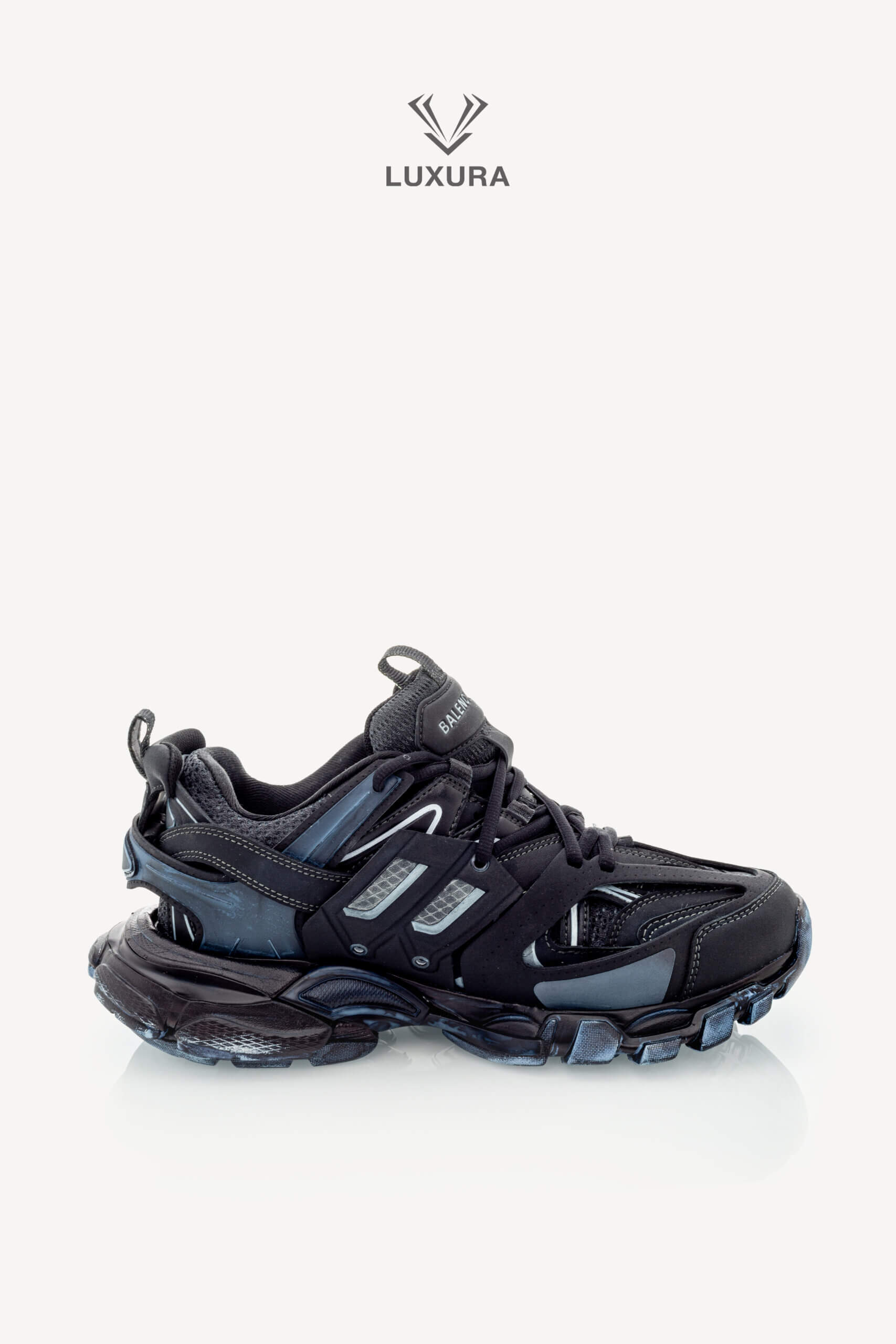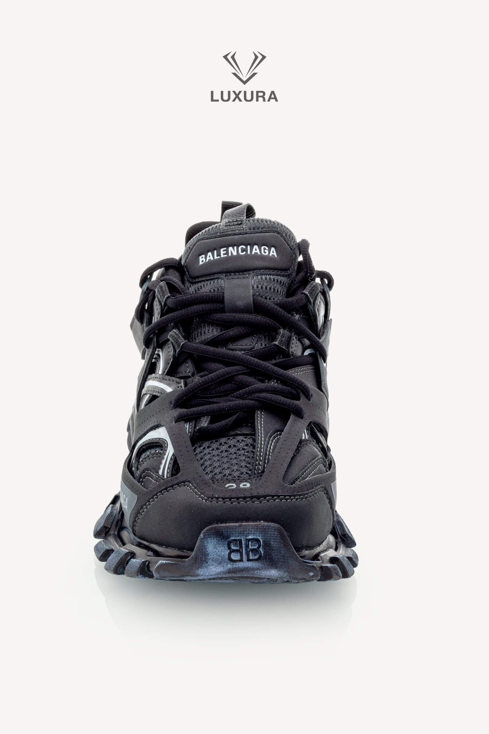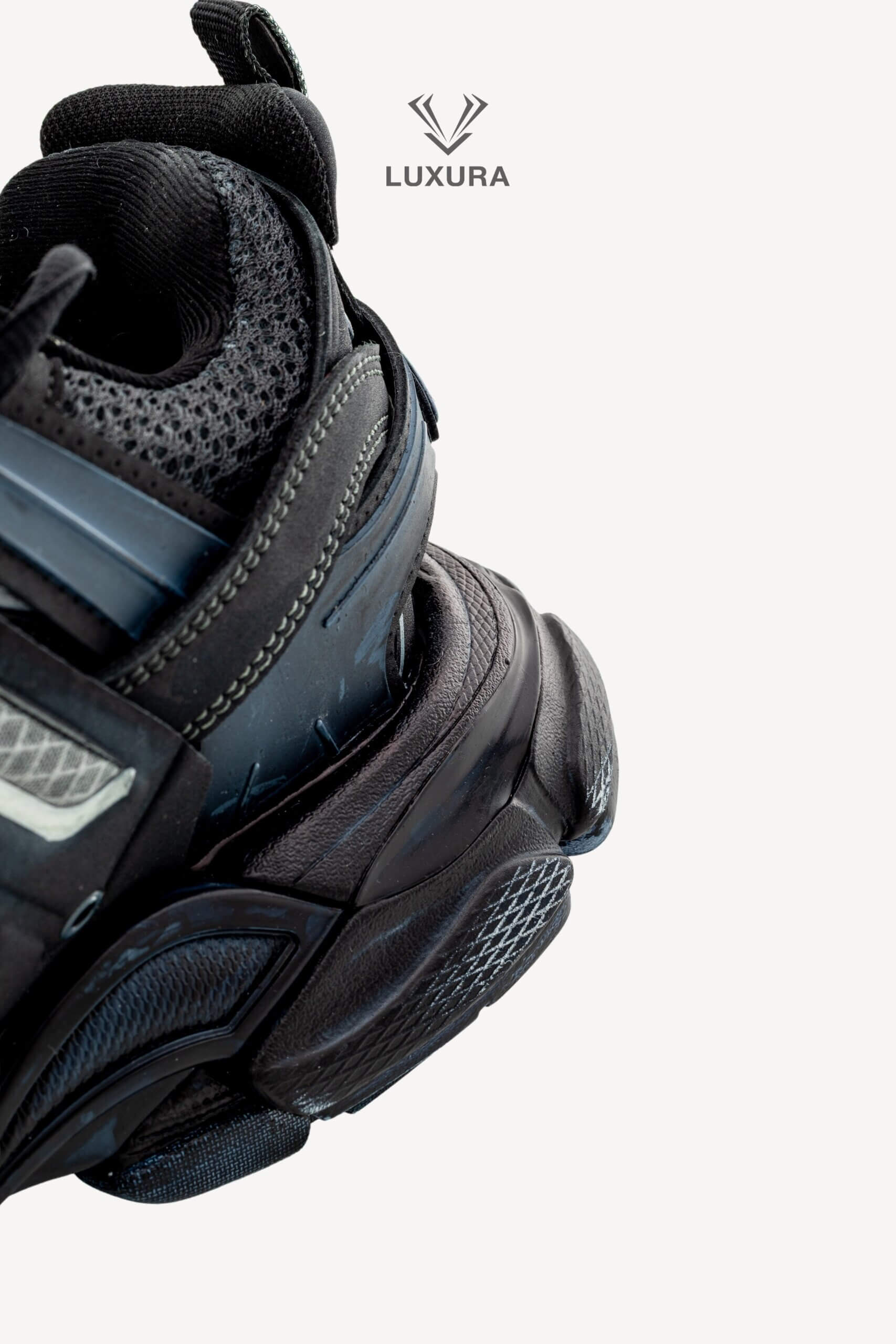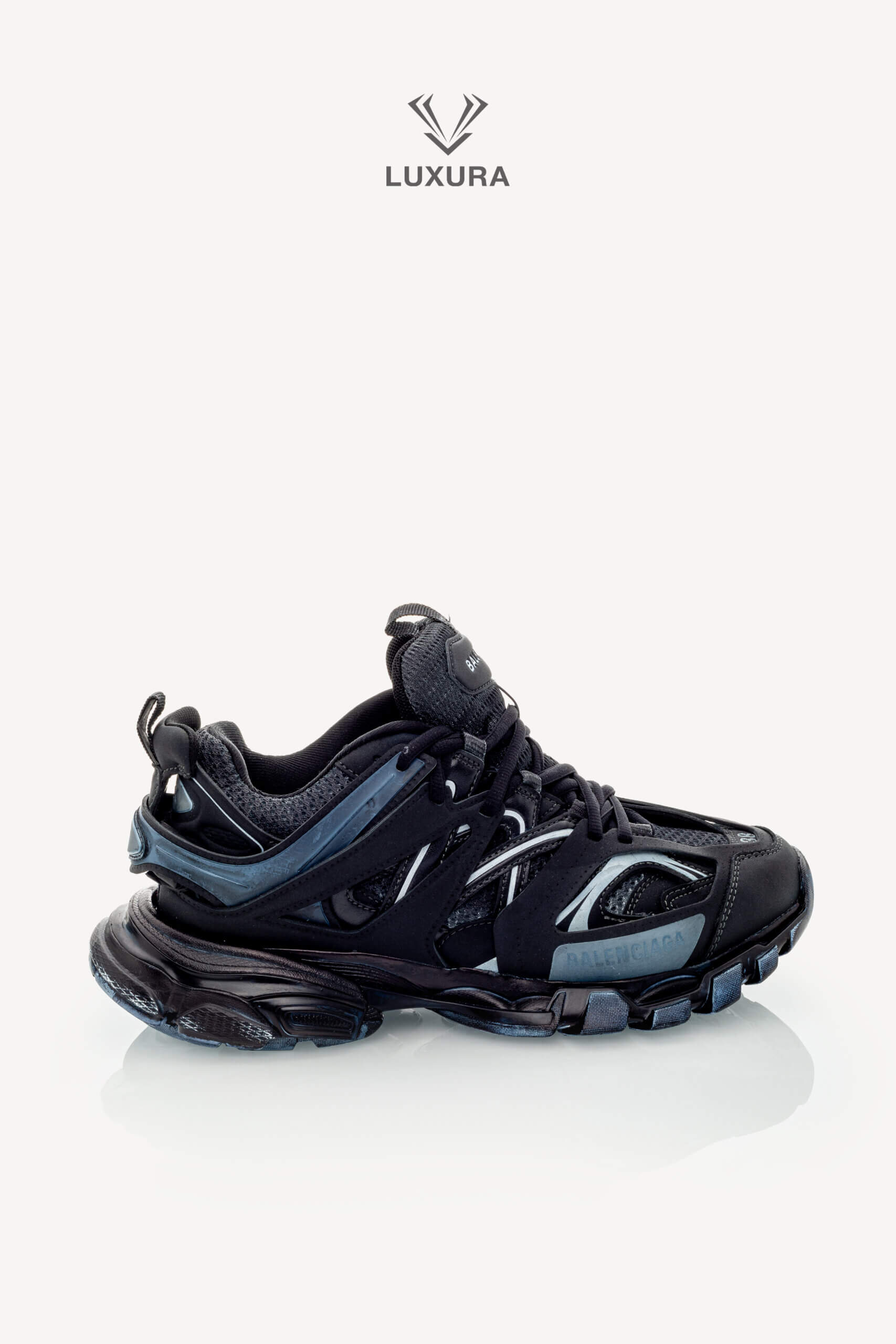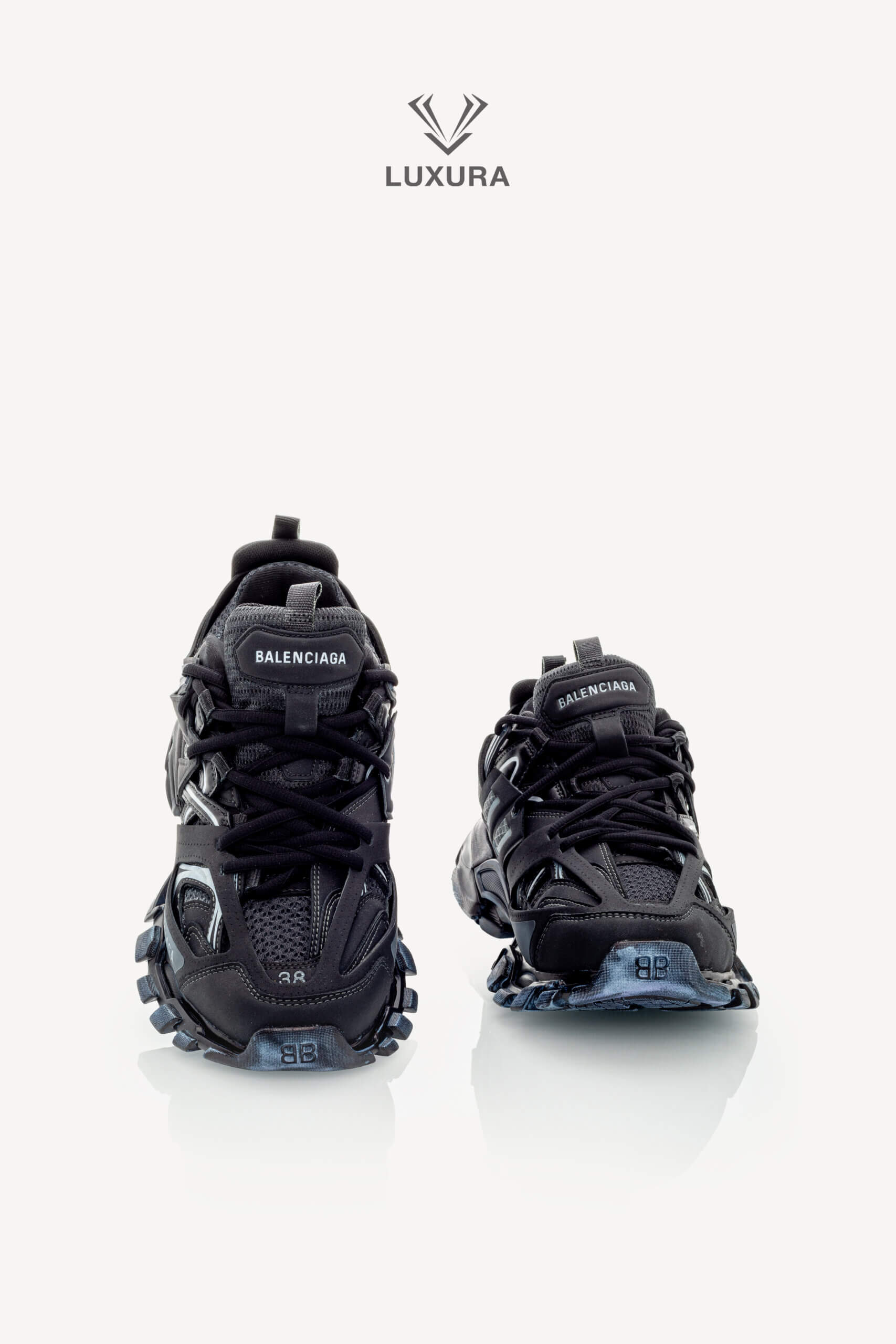 Pantofii BALENCIAGA Track Lace-up în culoarea neagră, mărimea 38 (25 cm), sunt confecționați din material textil și PVC, cu detalii hardware negre. Produsul este pre-owned, autentificat și se află într-o stare impecabilă, complet nou, livrat în ambalajul original care include cutia producătorului, dust bag și certificat de conformitate. Acest model oferă o potrivire true size și este disponibil exclusiv online prin platforma independentă Luxura Elite, fără afiliere cu brandul BALENCIAGA. Încălțămintea combină funcționalitatea cu un design distinctiv, specific identității brandului de lux contemporan.