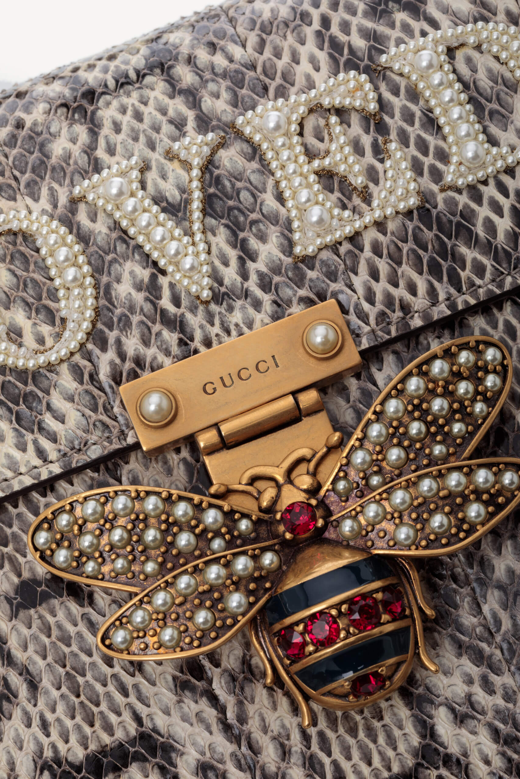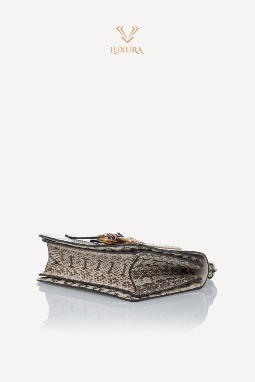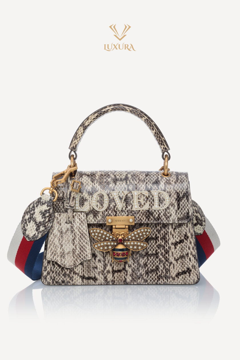 Romantism modern, coduri noi și vechi ale casei și un aer regal – aceasta este linia de genți Queen Margaret. Detaliile domnesc în designul structurat: piele moale și exotică de piton și un accent de feronerie strălucitoare sub forma unei albine din metal – un simbol din arhivele Gucci care a debutat în anii ’70 – încrustat cu perle si pietre colorate.