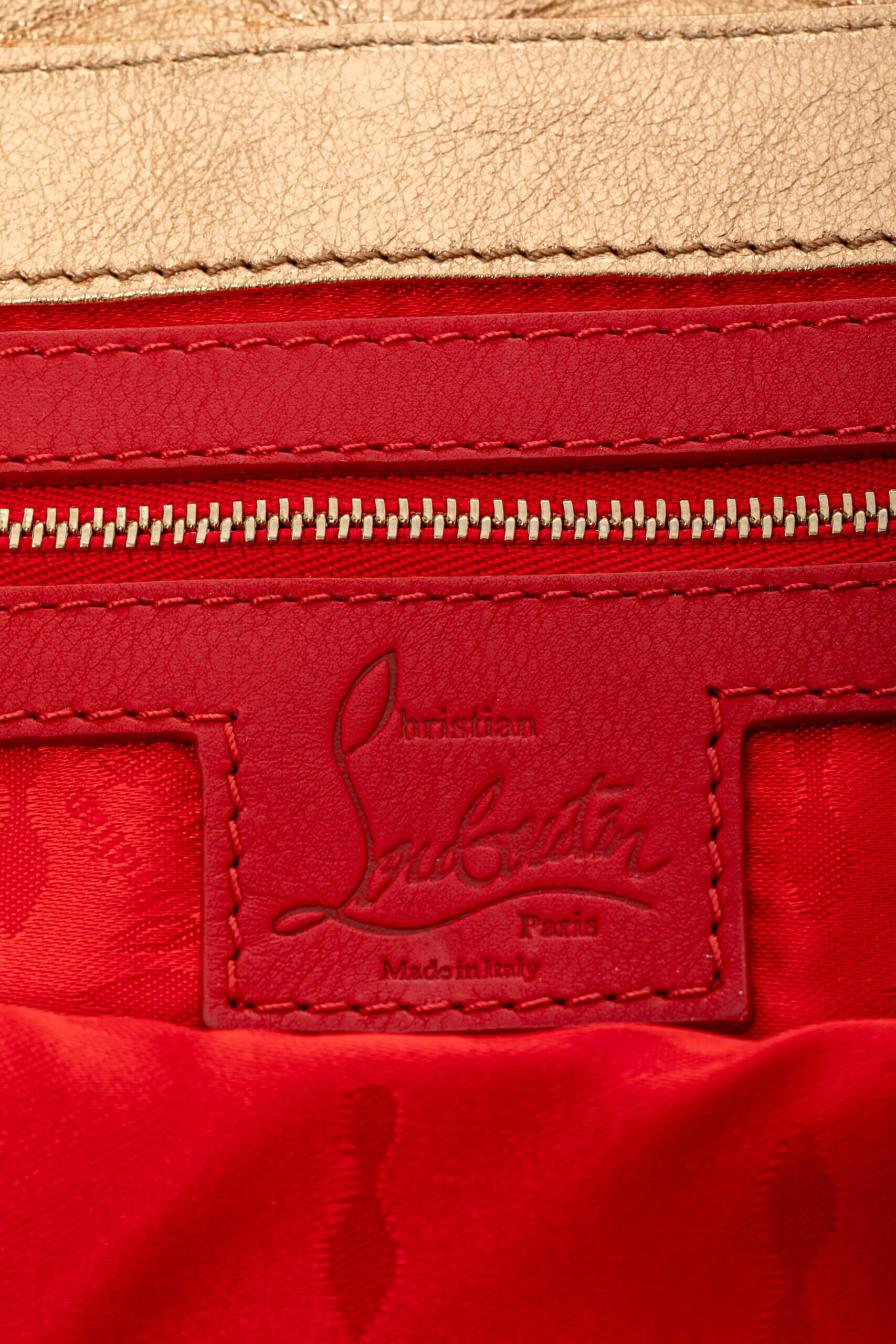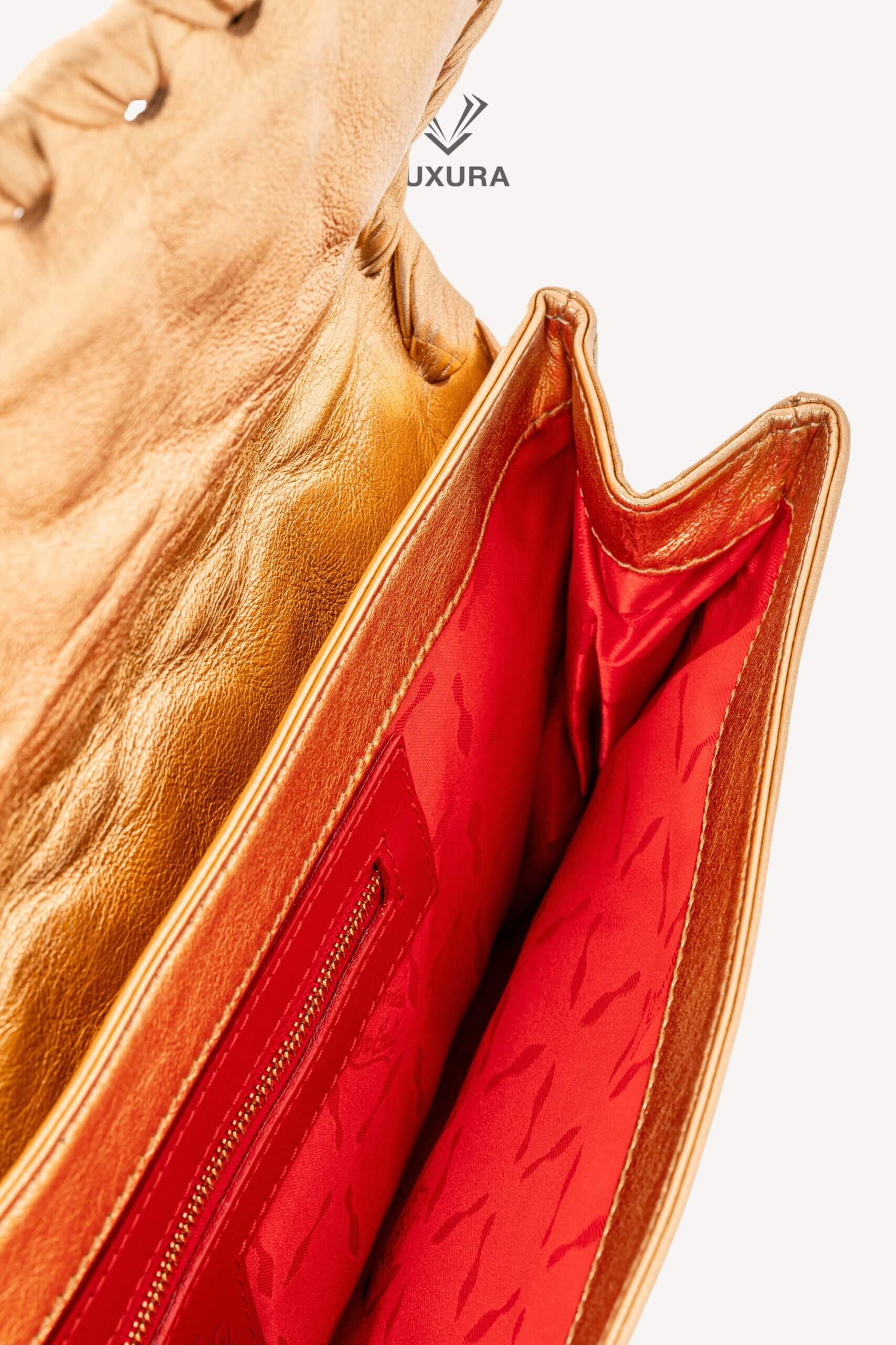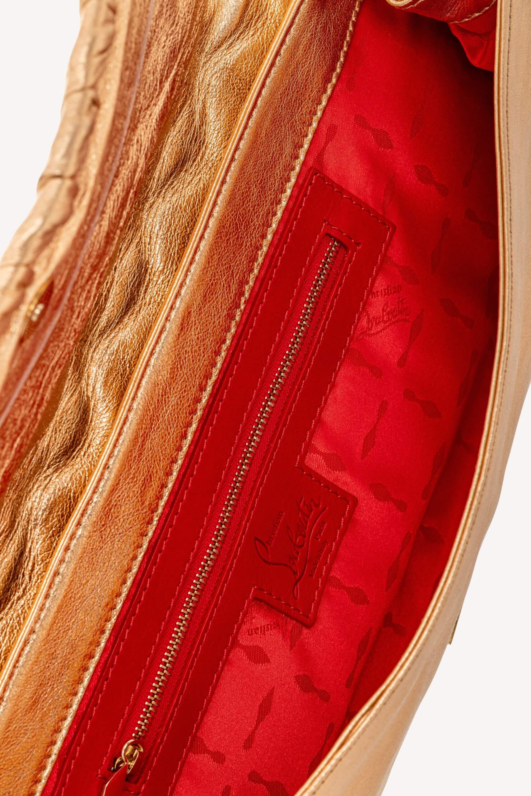 CHRISTIAN LOUBOUTIN Kenya Clutch Large Calfskin Laminato Auriu, Rosu – Genti de colecție