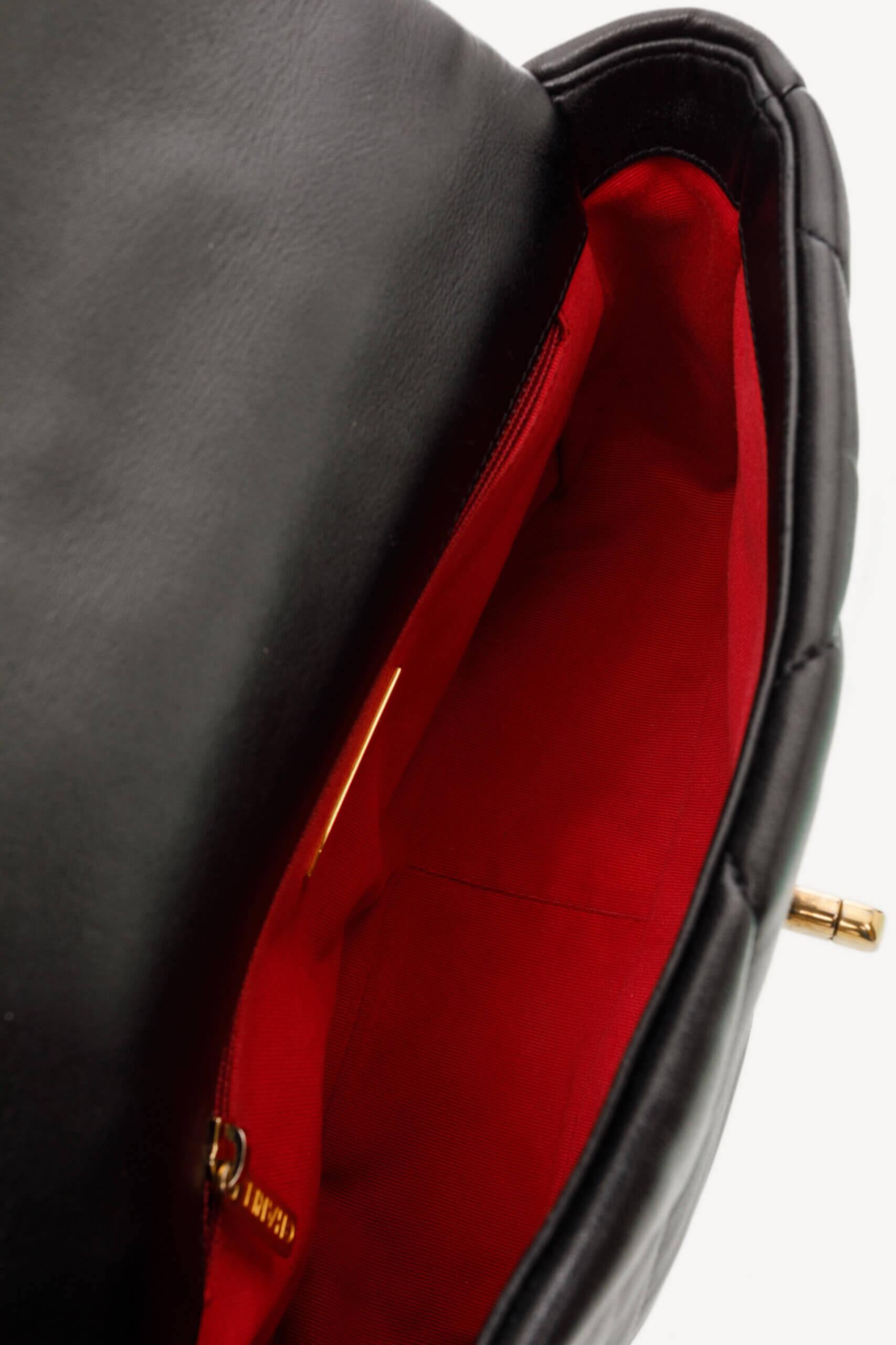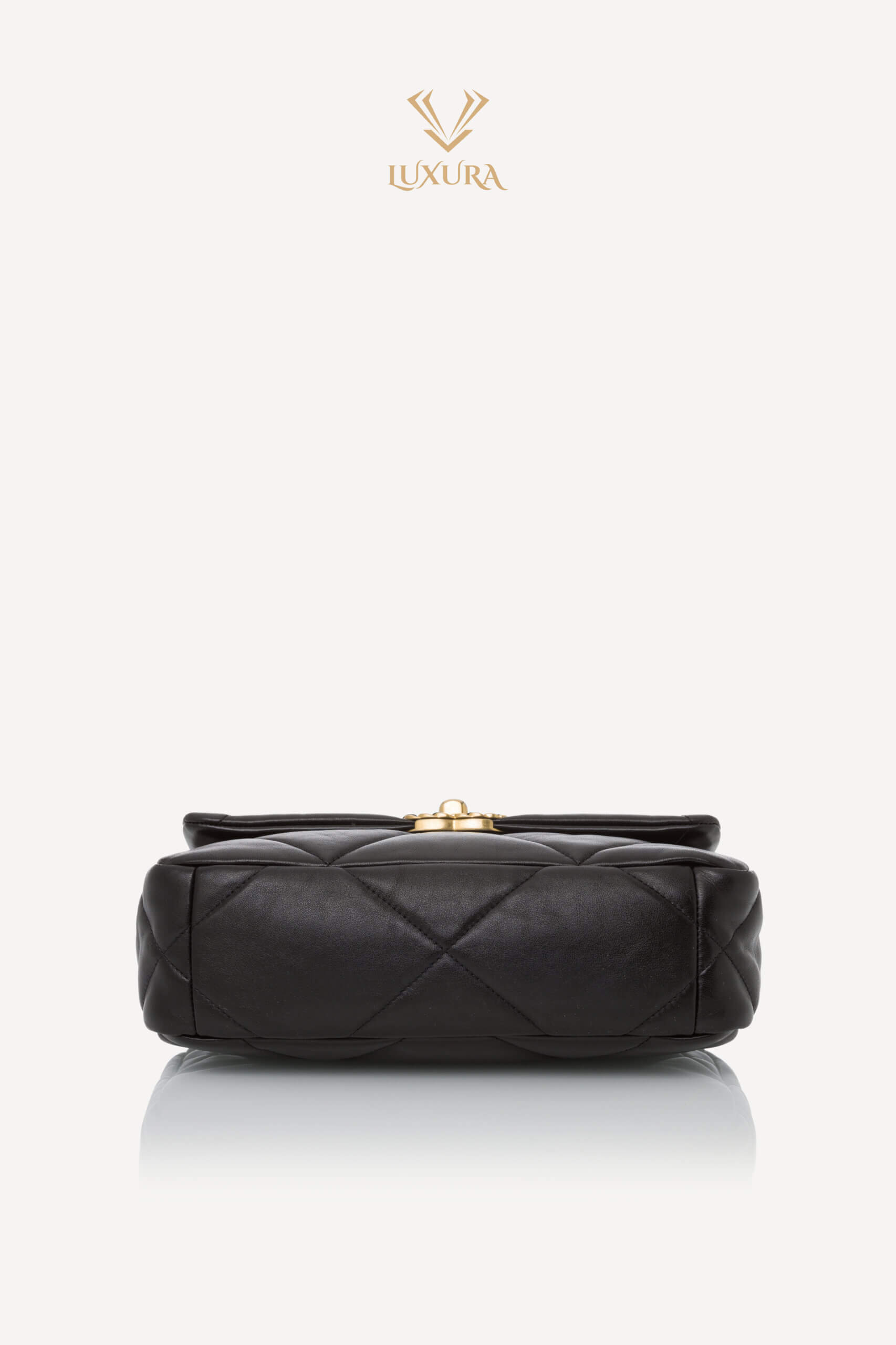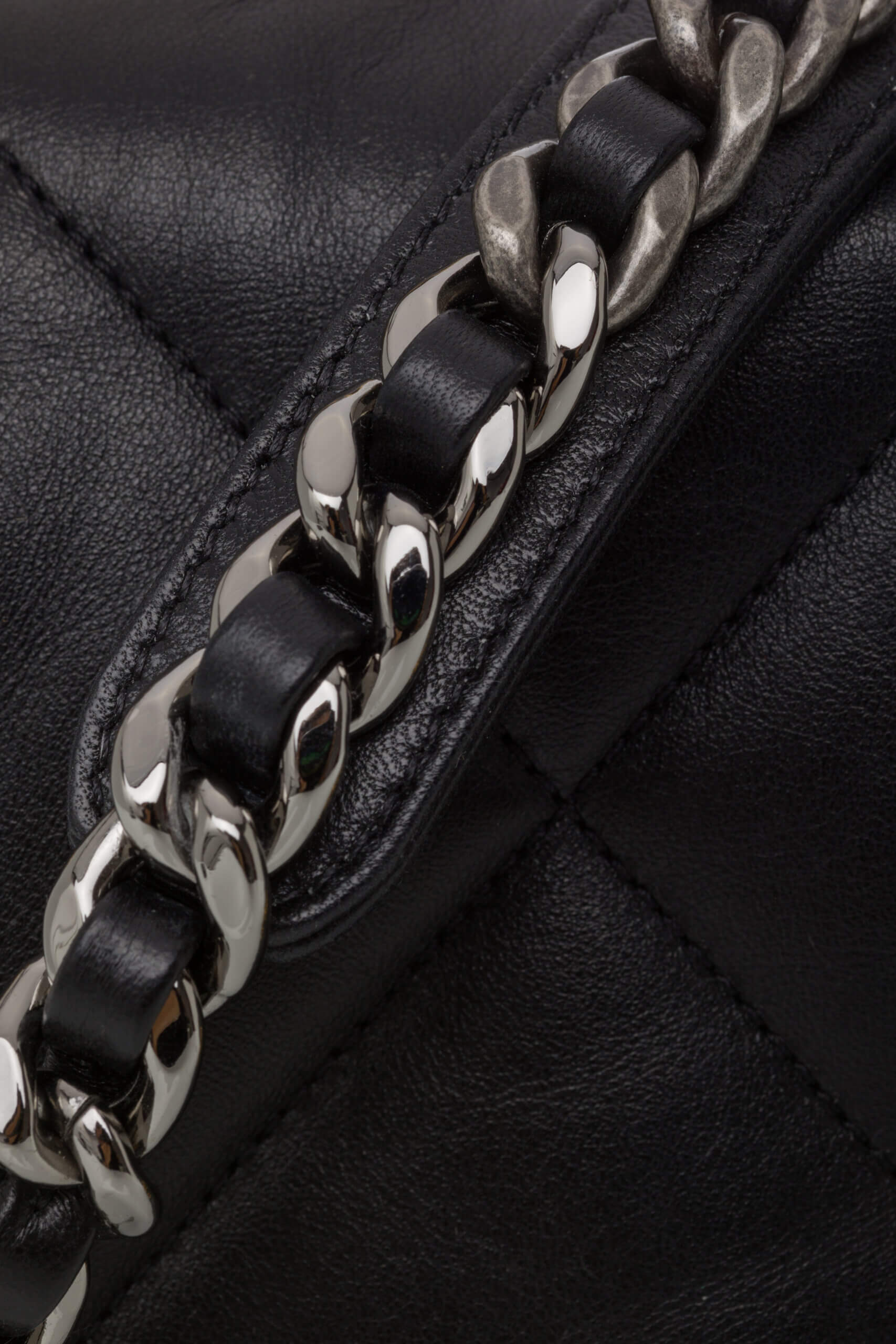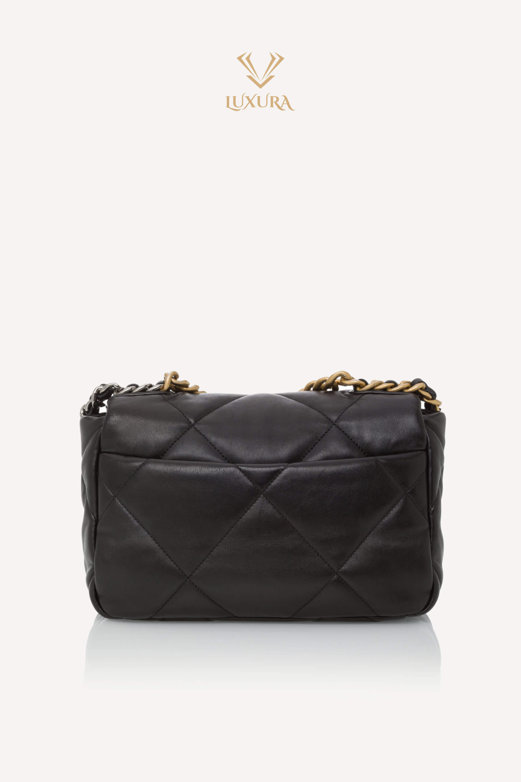 O piesă iconică reinterpretată pentru estetica modernă, această geantă neagră din piele moale matlasată emană rafinament și versatilitate. Dimensiunile compacte sunt perfect echilibrate de prezența sa impunătoare, evidențiată de lanțul metalic în trei nuanțe – o semnătură vizuală distinctivă, ce îmbină eleganța atemporală cu accente contemporane.
