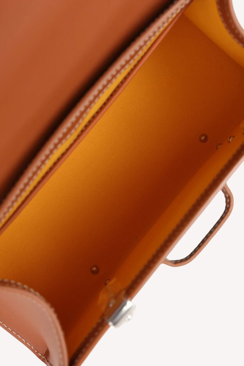 Această geantă Structuré Saigon Mini este realizată din pânză Goyardine acoperită în nuanțe de negru și maro, completată de piele de vițel Cervon maro și accesorii metalice în finisaj palladium. Detaliile contrastante de cusătură, clapeta frontală, panourile din lemn cu nituri palladium, mânerul superior din lemn și cureaua detașabilă îi conferă un aspect sofisticat și rafinat.