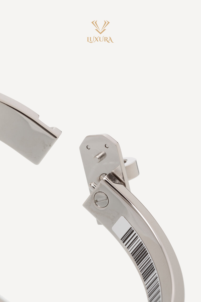 Brățara este nouă, în stare impecabilă, însoțită de cutie și accesoriile aferente. Prezintă foliile de protecție intacte pe zona de închidere, garantând autenticitatea și lipsa oricăror urme de utilizare. Un accesoriu elegant, perfect pentru colecționari.