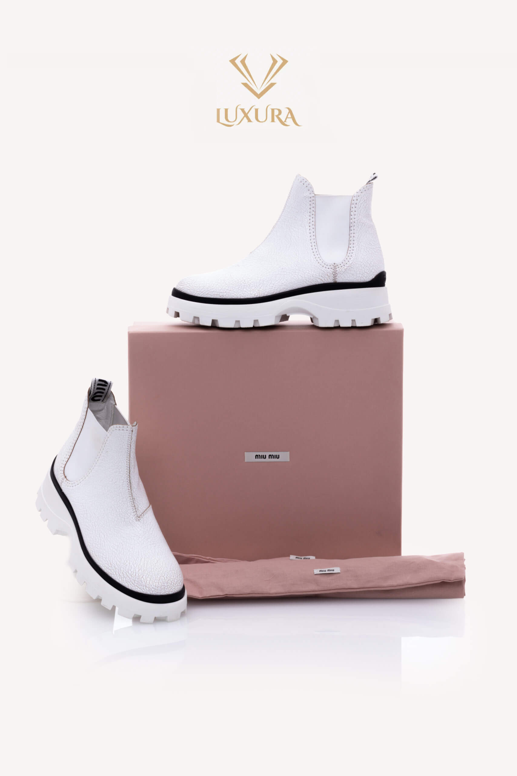 Descoperă eleganța discretă a MIU MIU Crackle Chunky Boots White, disponibilă acum prin Luxura Elite – garanția autenticității și calității în segmentul de lux pre-owned.