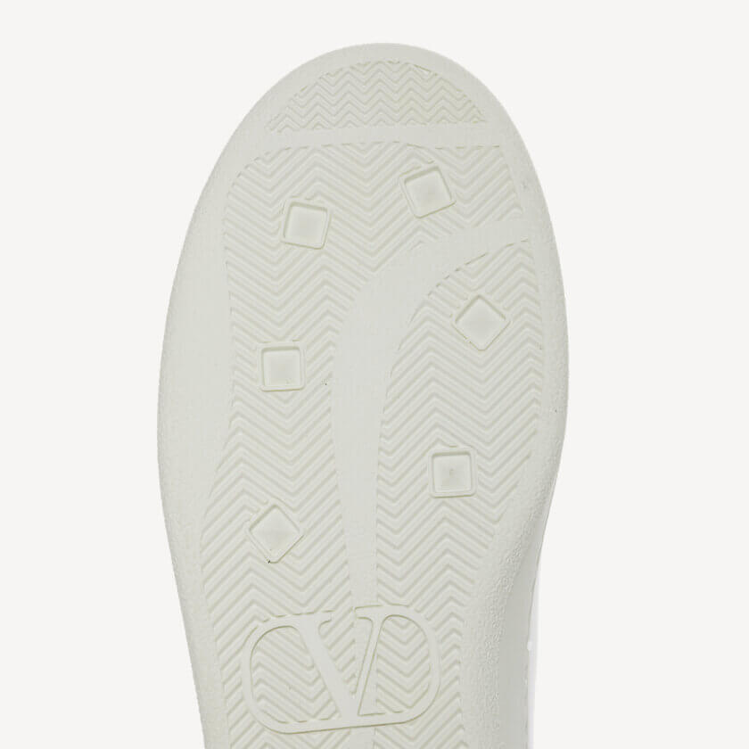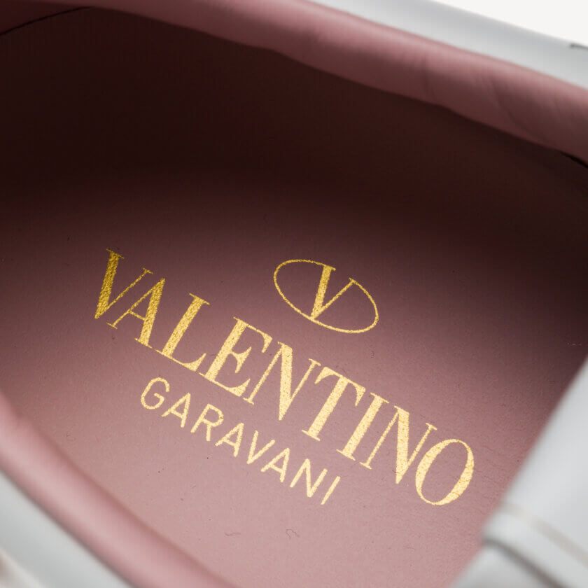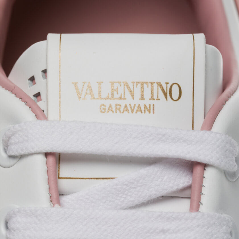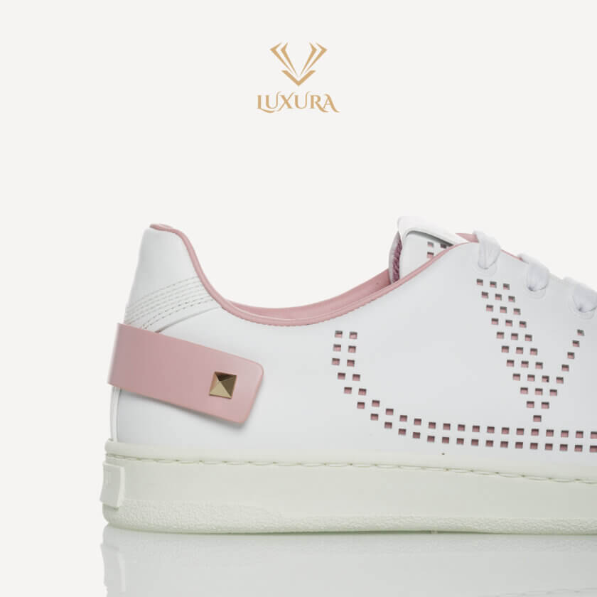 Acești pantofi sport moderni sunt confecționați din piele de vițel albă, cu logo-ul V perforat pe lateral și au o căptușeală interioară roz deschis cu o curea roz detașabilă la toc pe fiecare pantof.