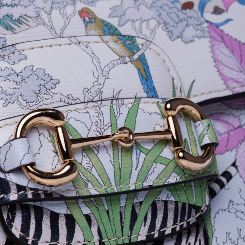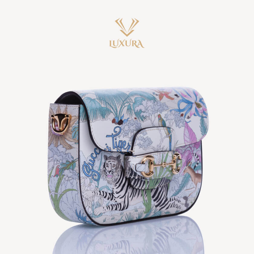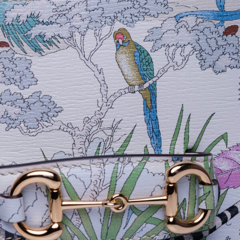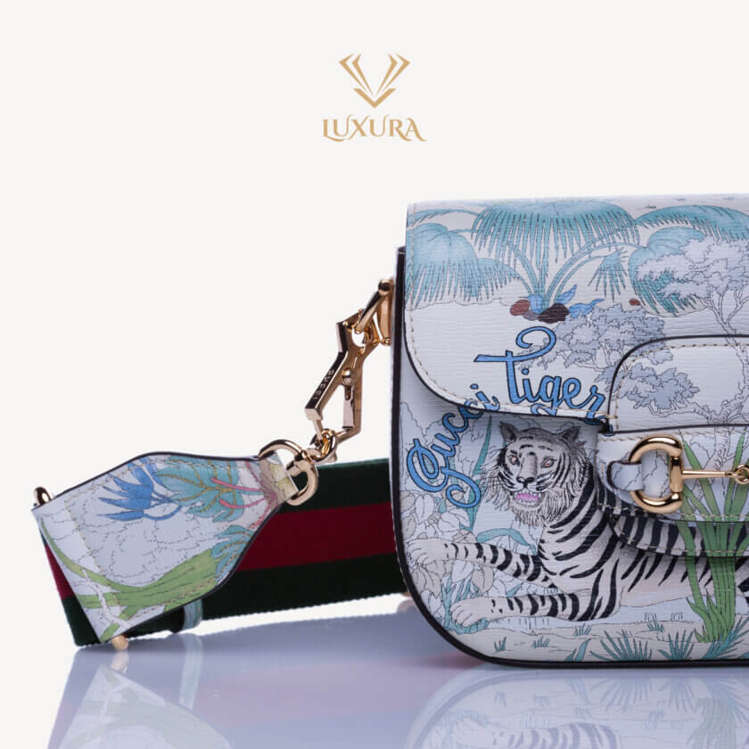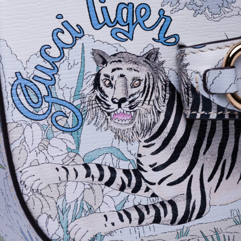 Gucci prezintă o reinterpretare a unui design de la sfârșitul anilor 1960 realizat de Vittorio Accornero – artistul și ilustratorul care a creat imprimeul Flora, semnătura casei. Tigrul, un motiv des întâlnit în colecțiile lui Alessandro Michele, este o expresie a fascinației Casei pentru frumusețea sălbatică a lumii naturale. Aici, felina definește această mini geantă Gucci Horsebit 1955.