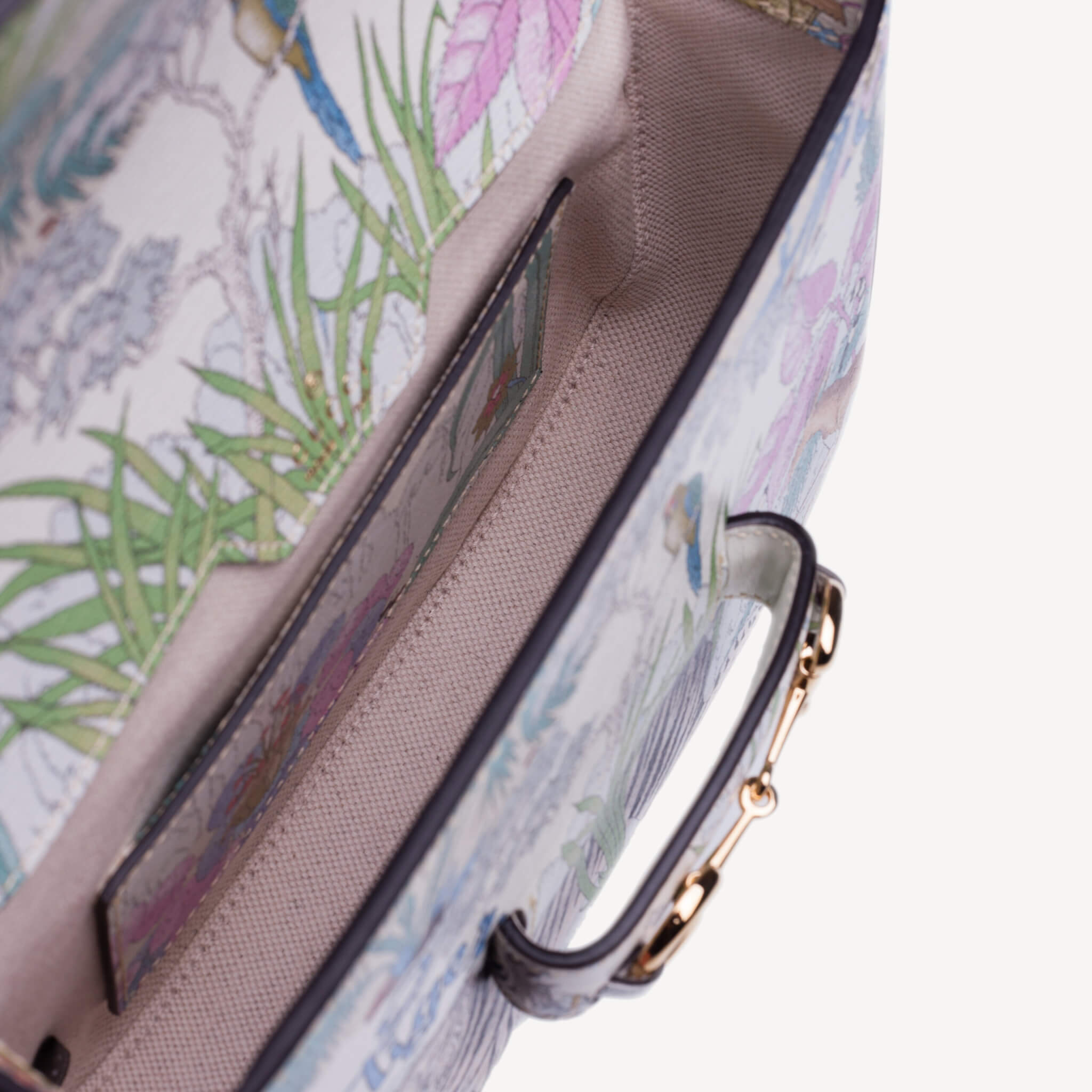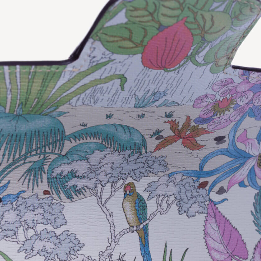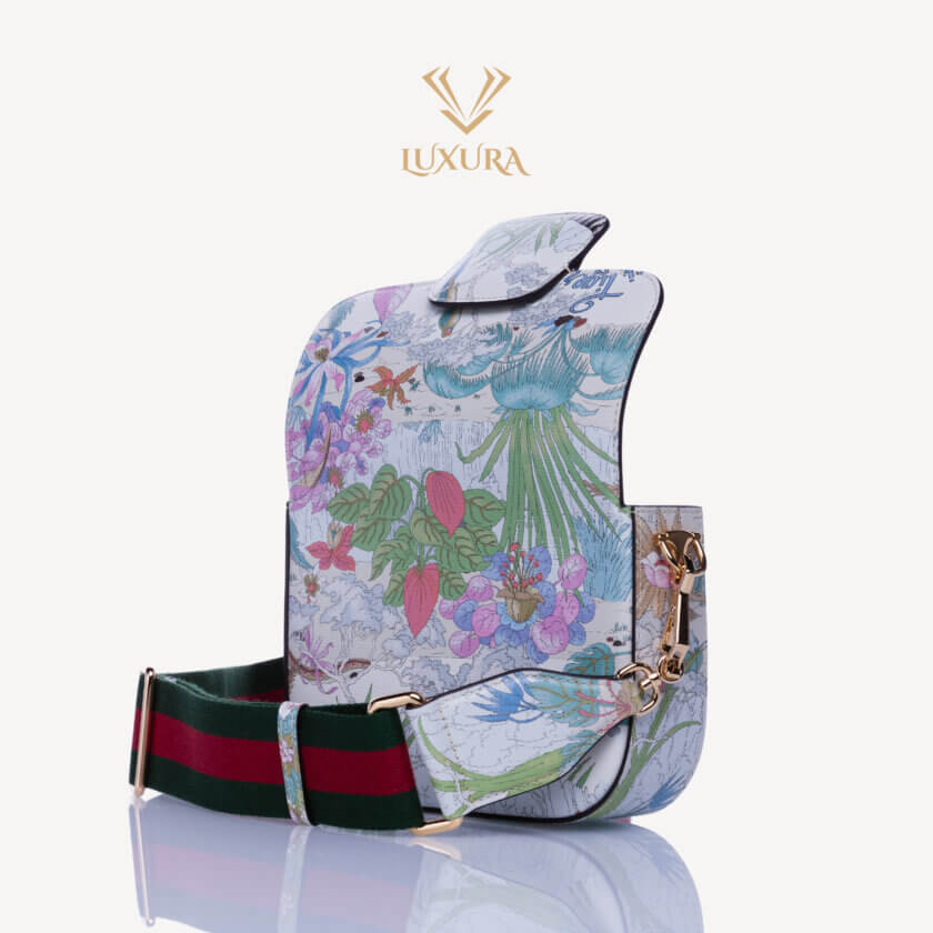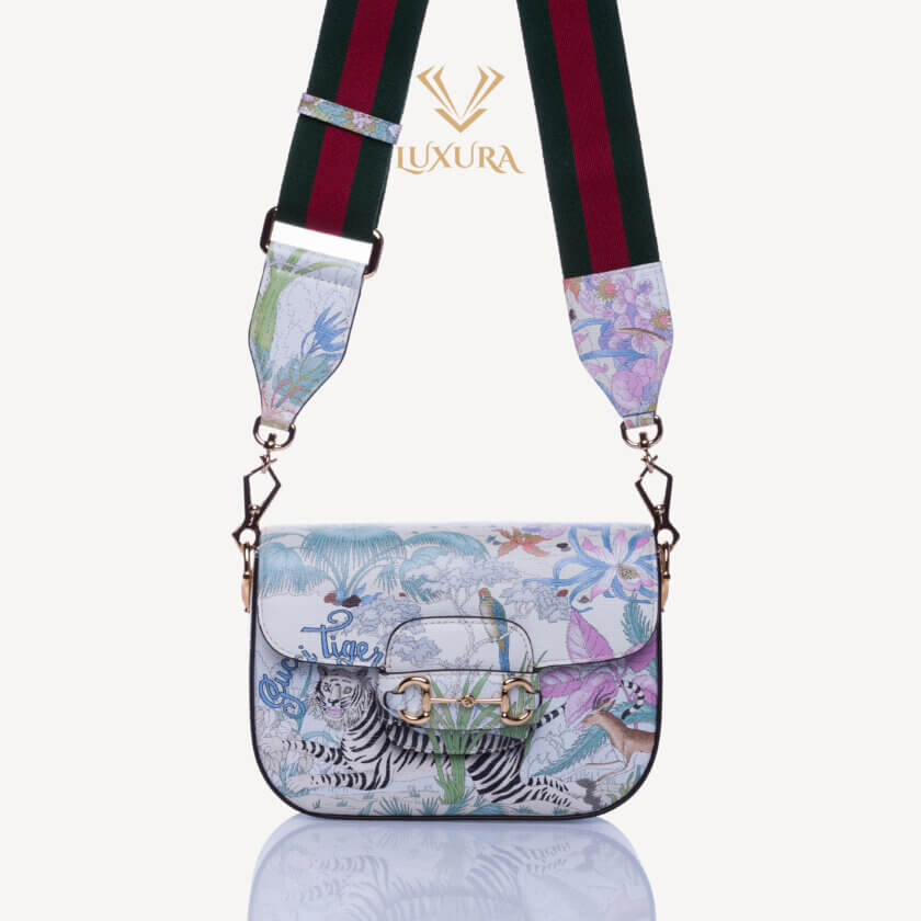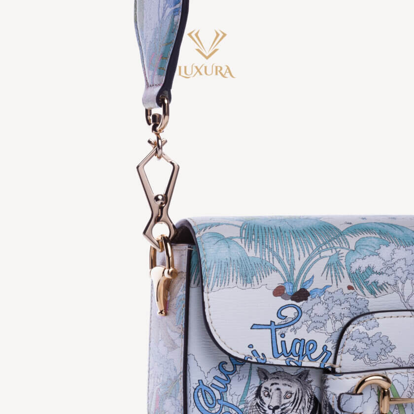 Gucci prezintă o reinterpretare a unui design de la sfârșitul anilor 1960 realizat de Vittorio Accornero – artistul și ilustratorul care a creat imprimeul Flora, semnătura casei. Tigrul, un motiv des întâlnit în colecțiile lui Alessandro Michele, este o expresie a fascinației Casei pentru frumusețea sălbatică a lumii naturale. Aici, felina definește această mini geantă Gucci Horsebit 1955.