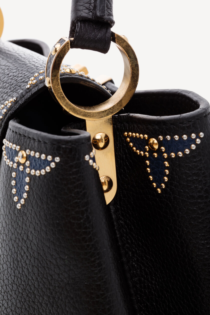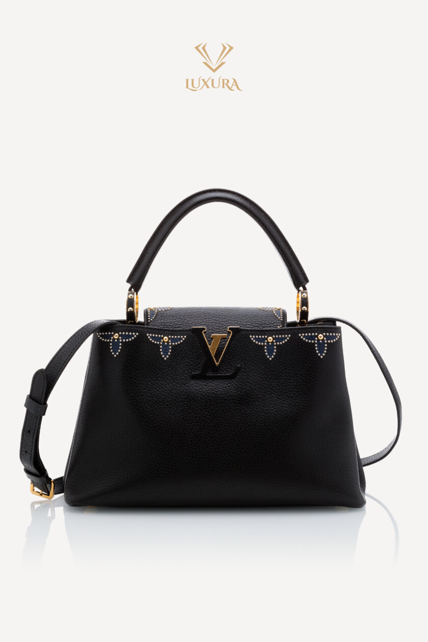 Numită după Rue des Capucines din Paris, unde Louis Vuitton şi-a deschis activitatea în 1854, geanta de mână Capucines MM a fost introdusă pentru prima dată în 2013. Confecționată din piele Taurillon, are o clapă care poate fi purtată în două moduri: în afară dezvăluie o floare monogramă sau în interior pentru a afișa inițialele LV îmbrăcate în piele. Destul de ușor pentru a fi purtată toată ziua, in mâna sau pe umăr .
