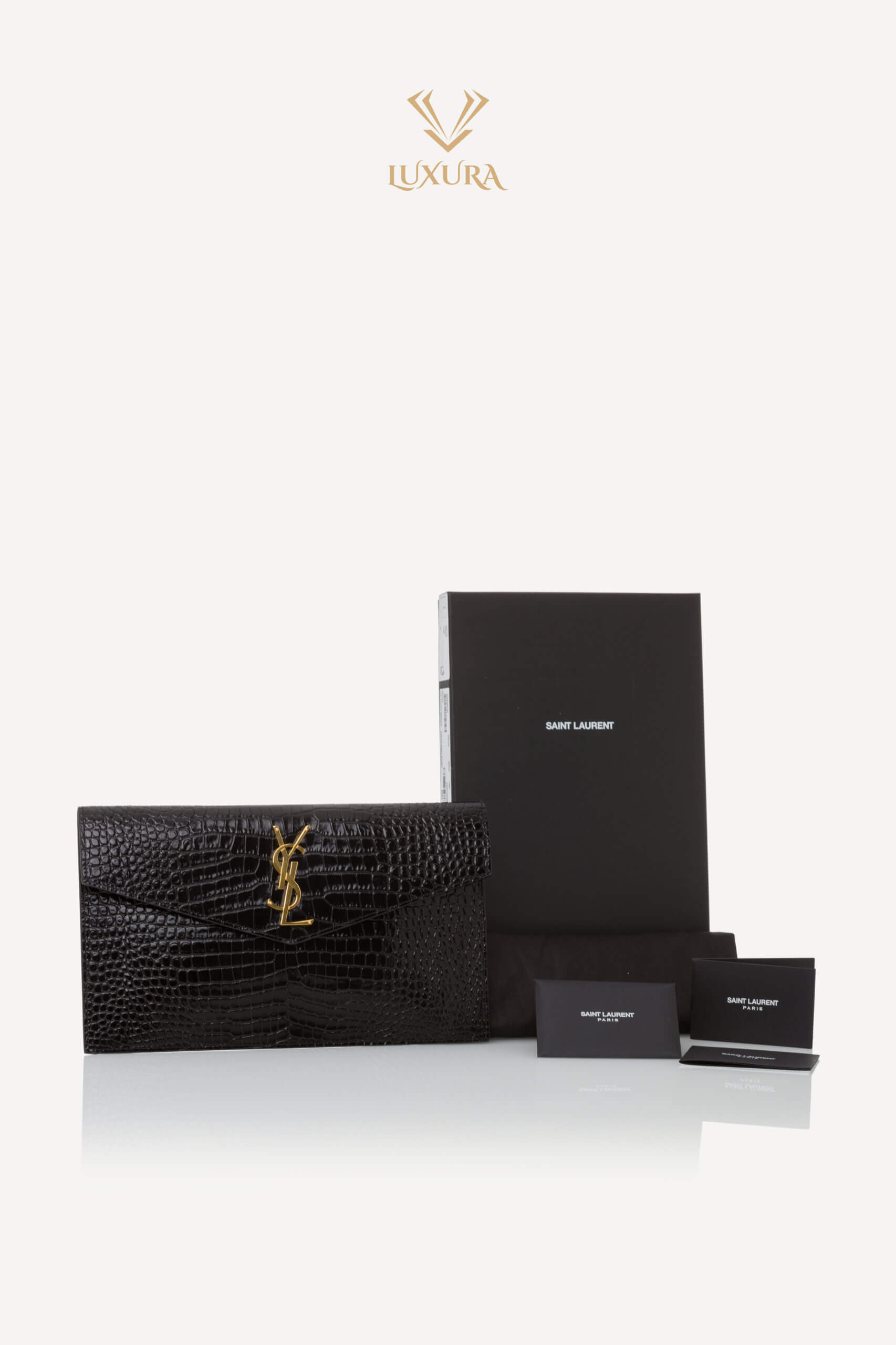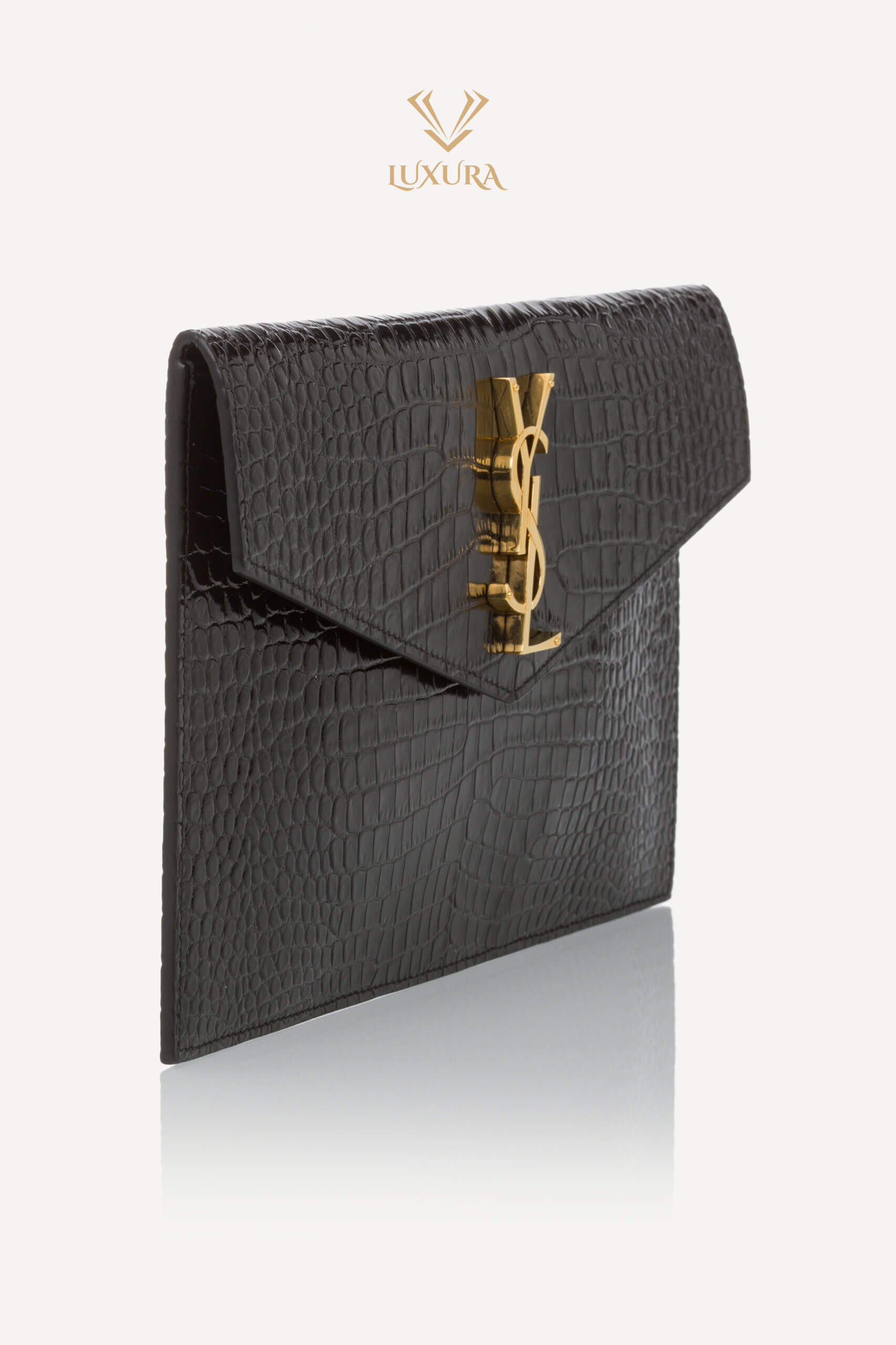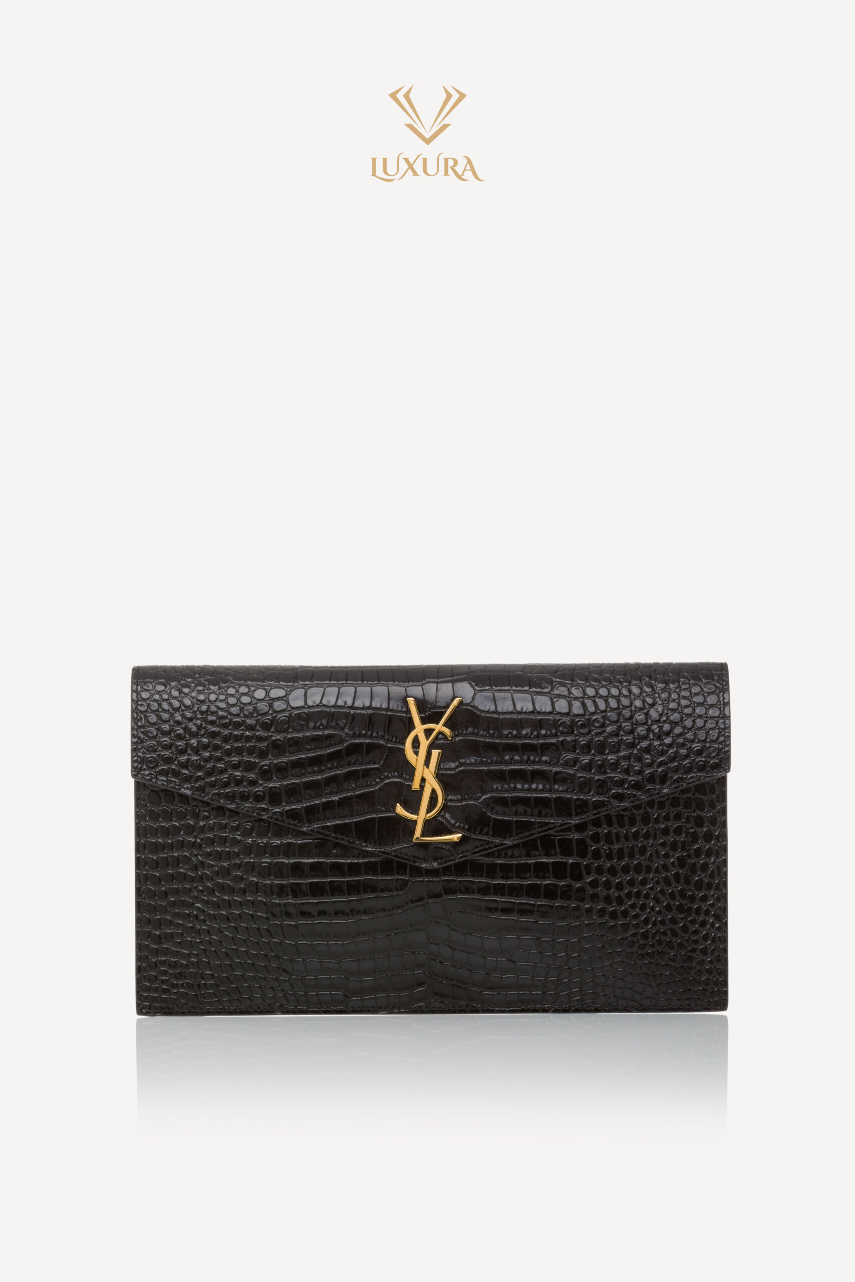 SAINT LAURENT Uptown Pouch Croc Embossed Clutch Black Negru – Genti de colecție