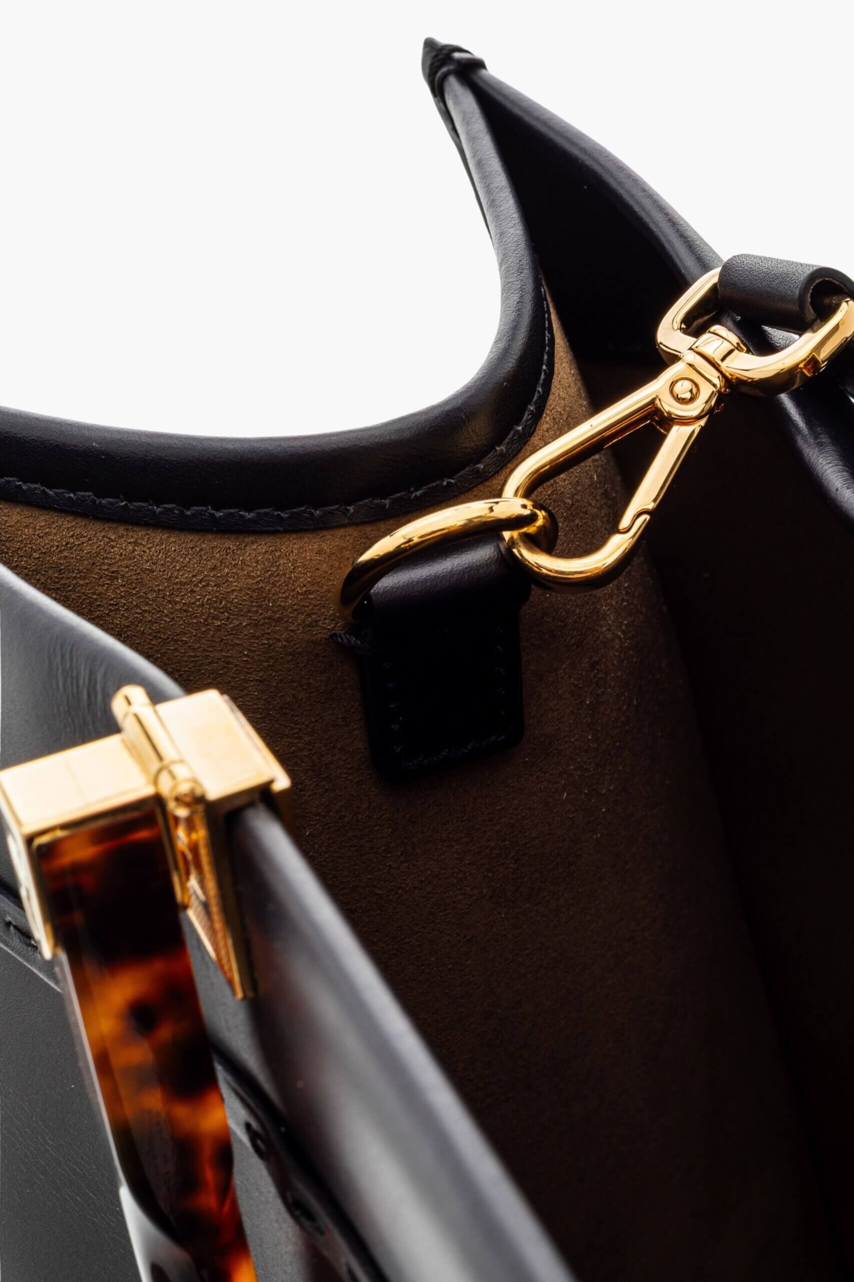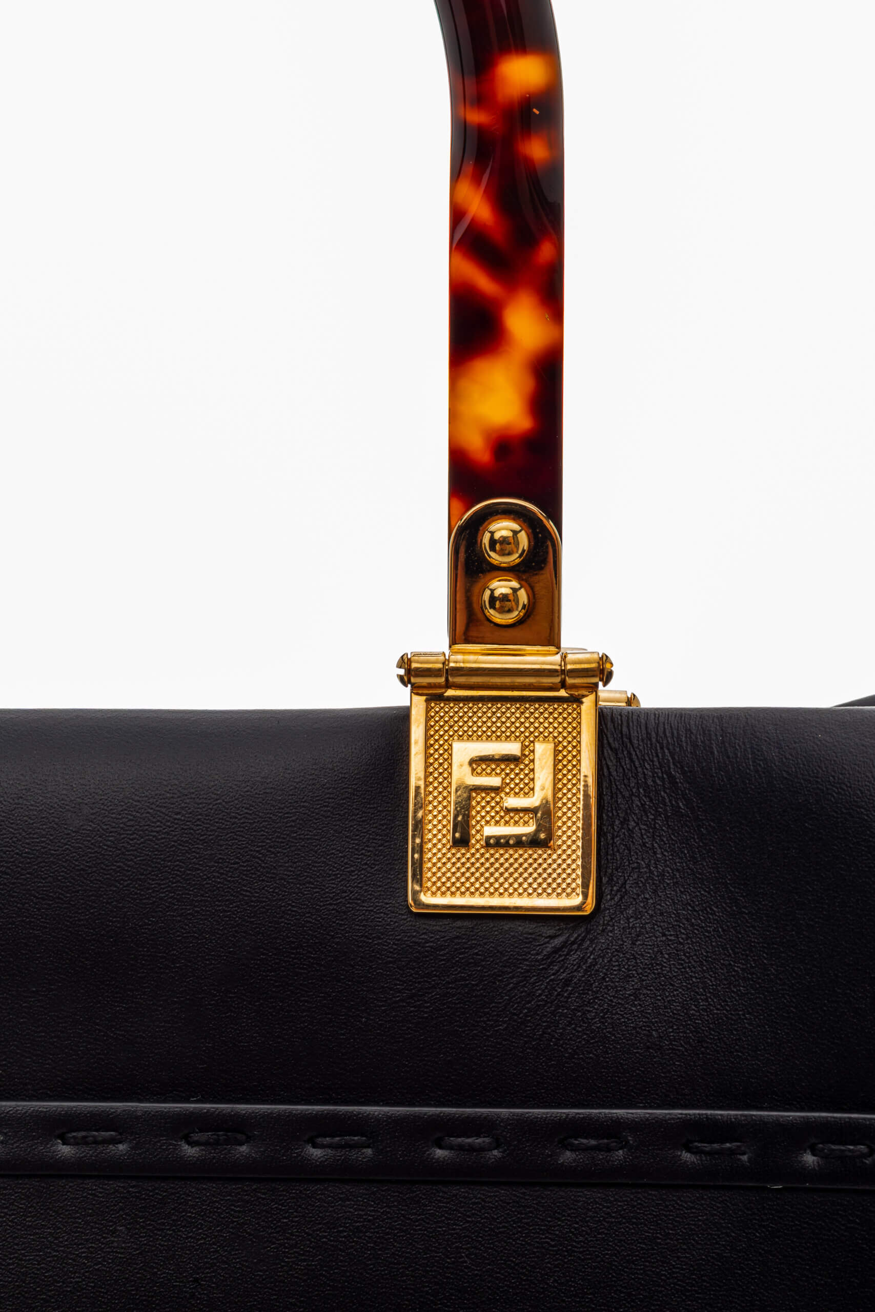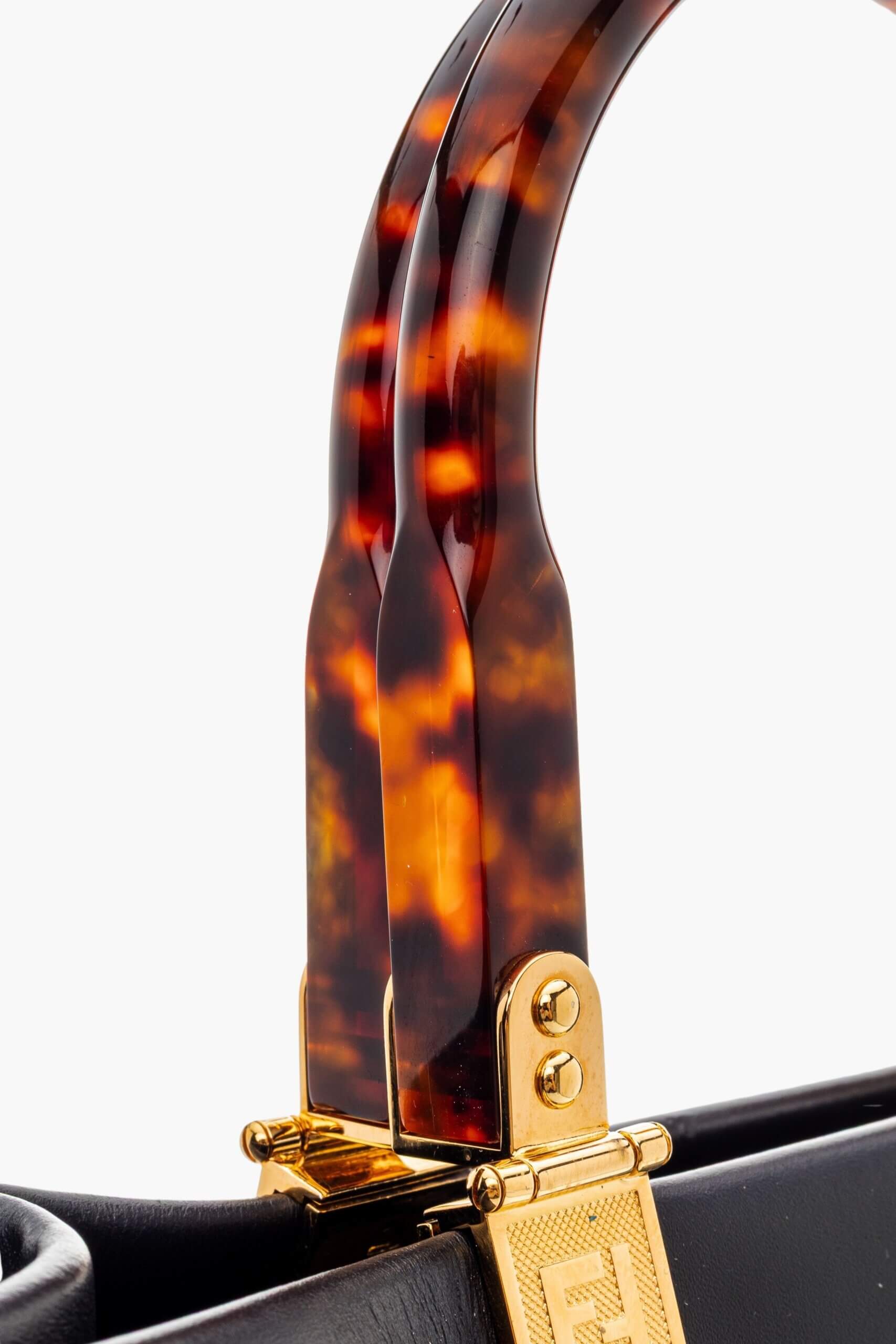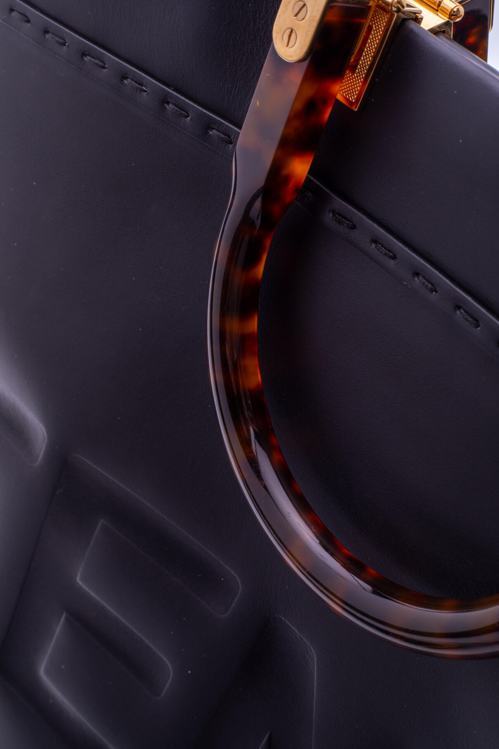 Această geantă este simplă, destul de simplă ca formă de fapt, dar simplitatea de multe ori este cheia, iar pielea laminată de culoare aurie, cu motiv FENDI ROMA gradat ștanțat la cald și mânere rigide din plexiglas cu efect de carapace de țestoasă se potrivesc de minune.