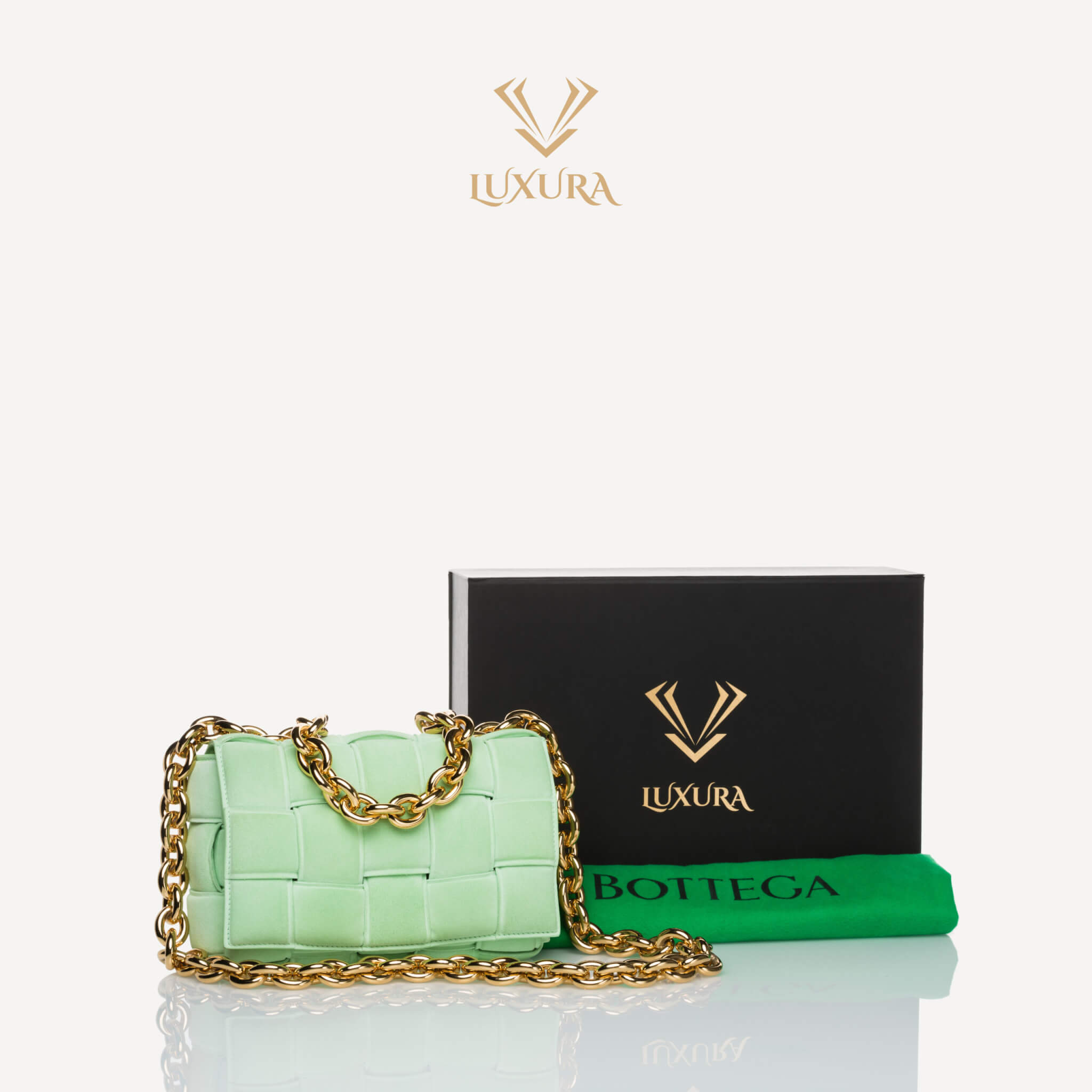 Geanta este confecționată manual dintr-o versiune exagerată și căptușită a țesăturii intrecciato de la Bottega Veneta. Chain Cassette verde wasabi se întoarce către trecut în timp ce captează toată atenția în prezent. Feroneria de lanț auriu este realizată cu o atenție meticuloasă la detalii; acesta este lustruit pentru a crea finisajul perfect al suprafeței înainte de a fi galvanizat și tratat cu straturi hipoalergenice și de protecție.