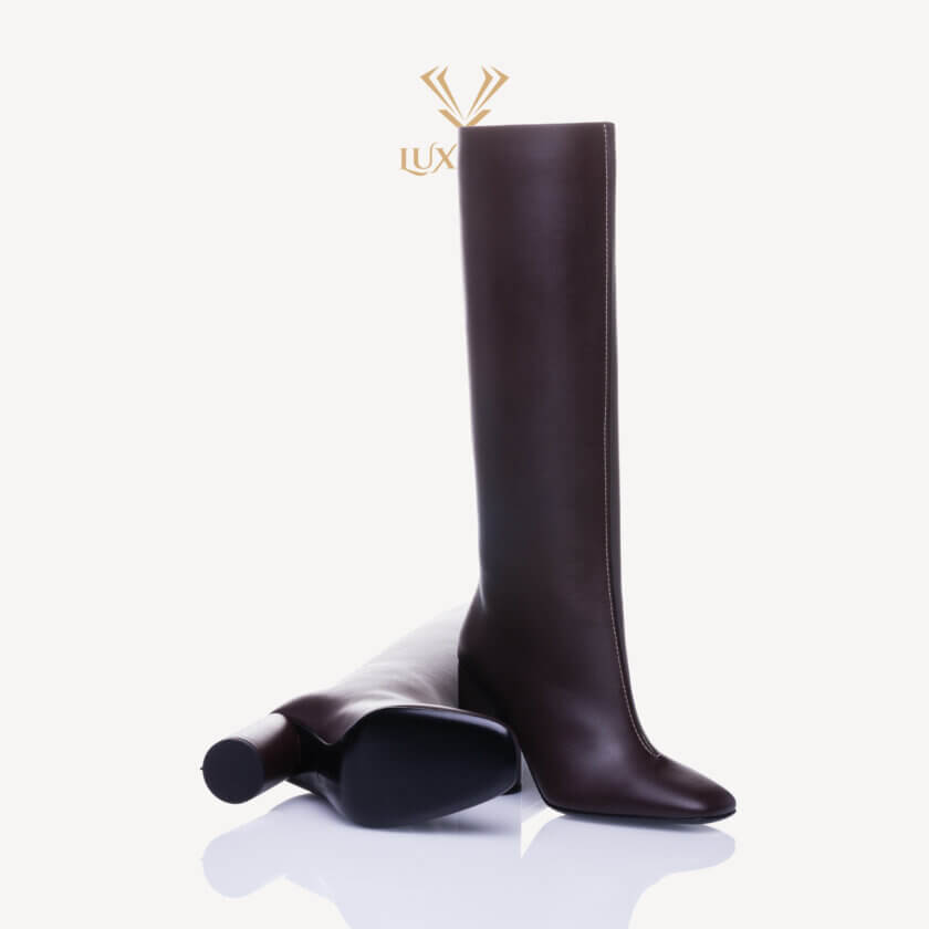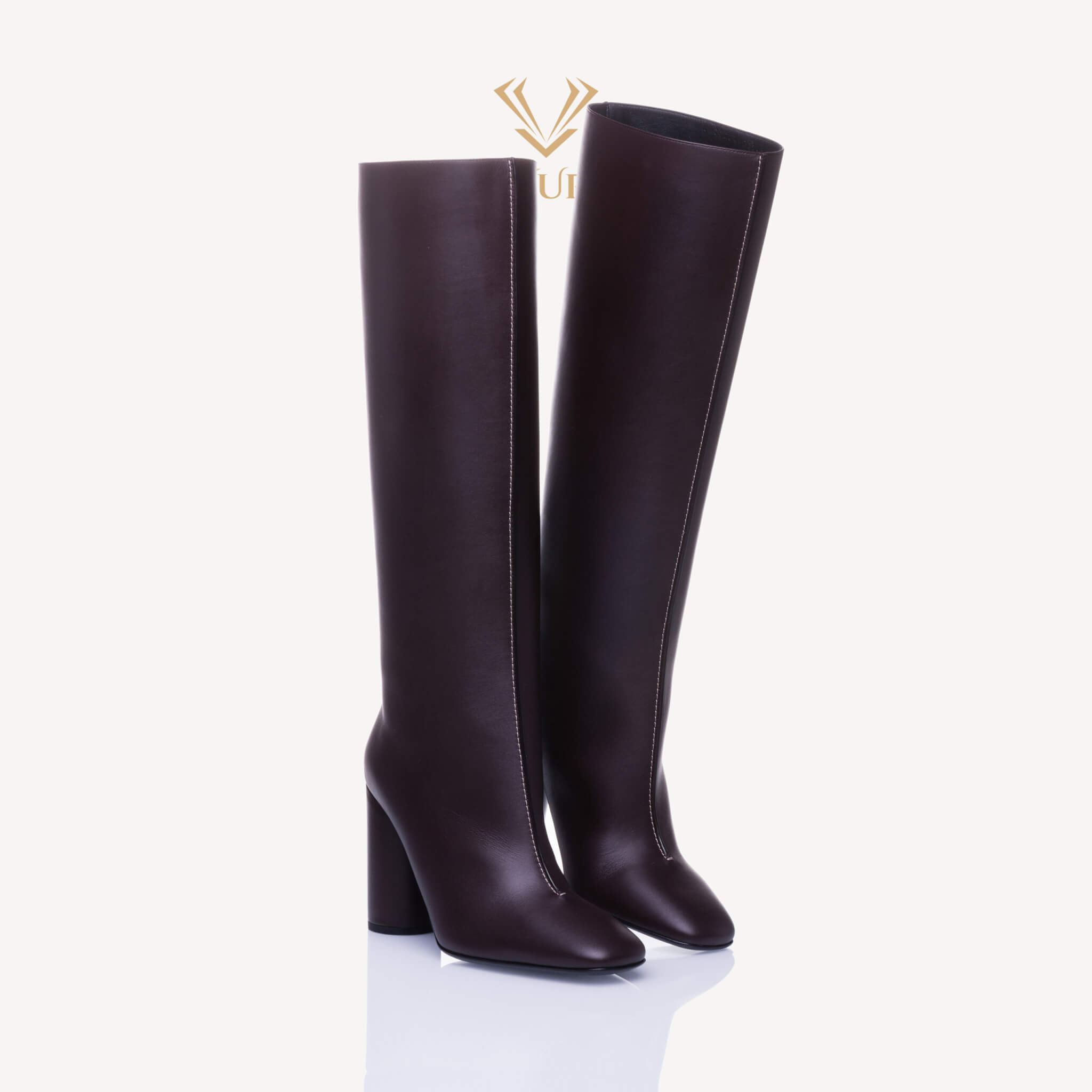 Cizme cu toc înalt din piele de vițel cu margini nuanțate și cusături contrastante. Un stil de cusătură pentru un aspect atemporal și elegant.