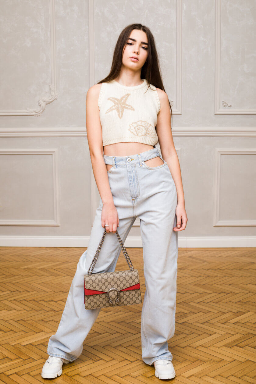Râvnita geantă „Dionysus” de la Gucci inspirată de legenda zeului Dionis este una dintre clasicele brand-ului și un esențial în garderoba pasionatelor de modă. Geanta fost realizată în Italia din cunoscutul GG Canvas și este accesorizată cu hardware-ul distinctiv cu cap de tigru dublu deja iconic al casei de modă. Fiind un clasic din era lui Alessandro Michele, acest model a fost reimaginat cu accente din piele de căprioară pentru un extra touch de sofisticare.