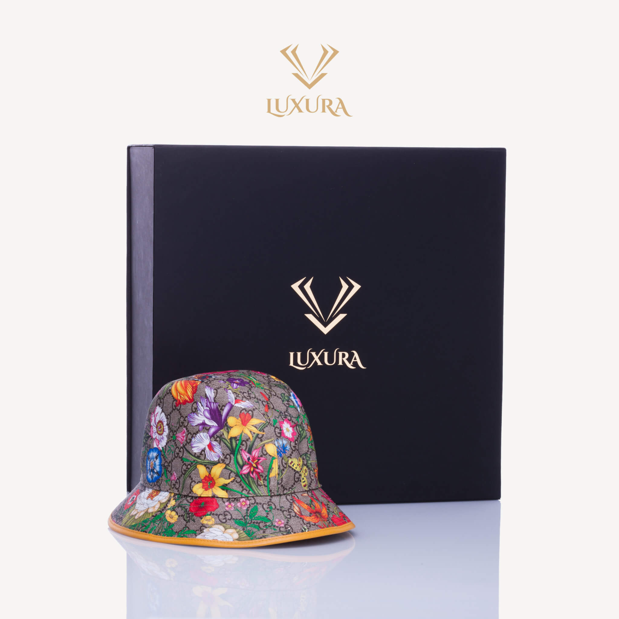 Întoarceți capetele oriunde ați merge cu această pălărie Fedora de la GUCCI GG Supreme Monogram Flora, realizată din pânză monogramă bej și abanos, cu imprimeu floral multicolor.