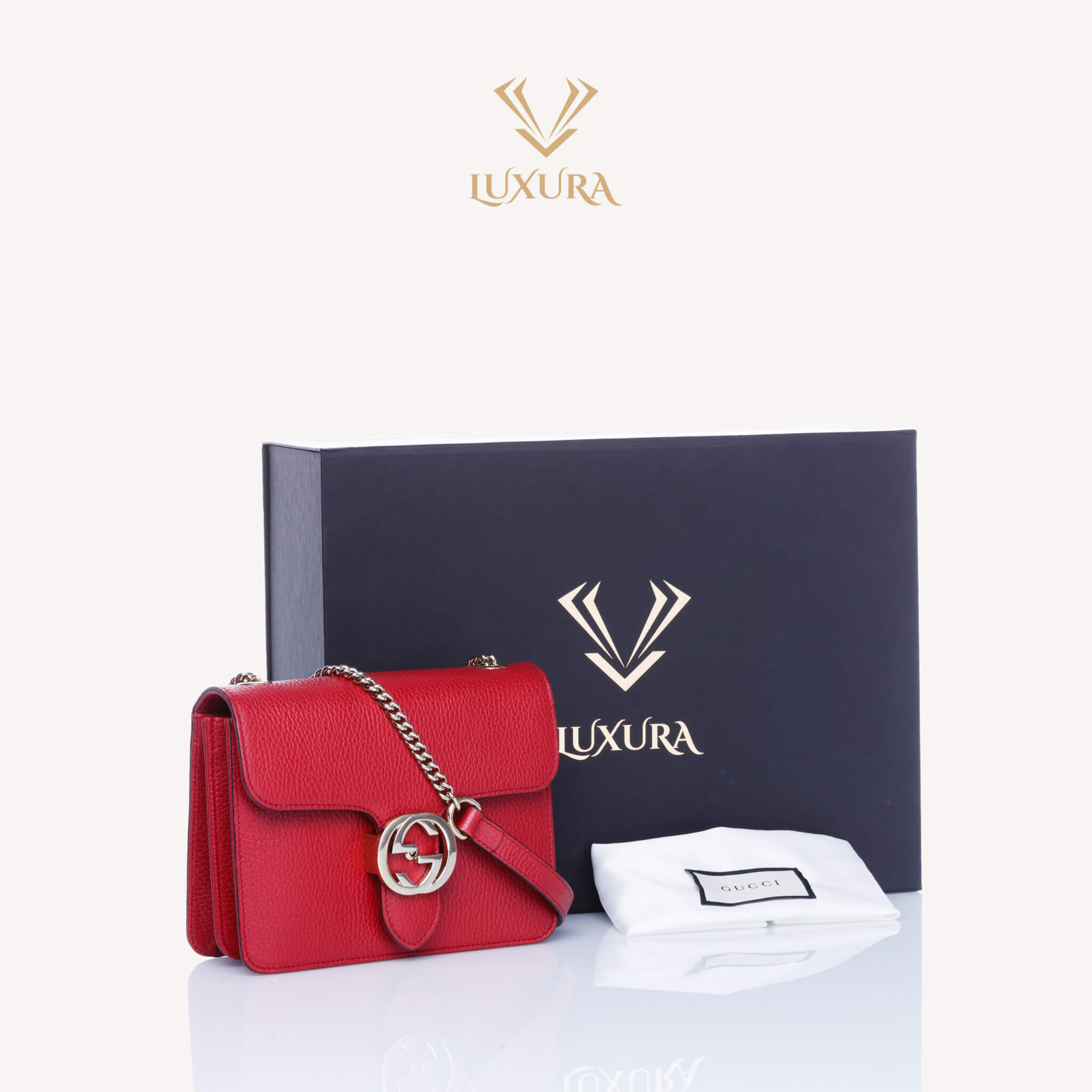 Această geantă sofisticată este distractivă și plină de farmec. Cu o piele roșie superbă și o închidere cu logo GG interconectată în nuanță aurie. Interiorul este perfect pentru a vă ține lucrurile esențiale, iar cureaua cu lanț poate fi purtată pe umăr și ascunsă înăuntru și atunci devine clutch. O geantă perfectă pentru acum și mai târziu.