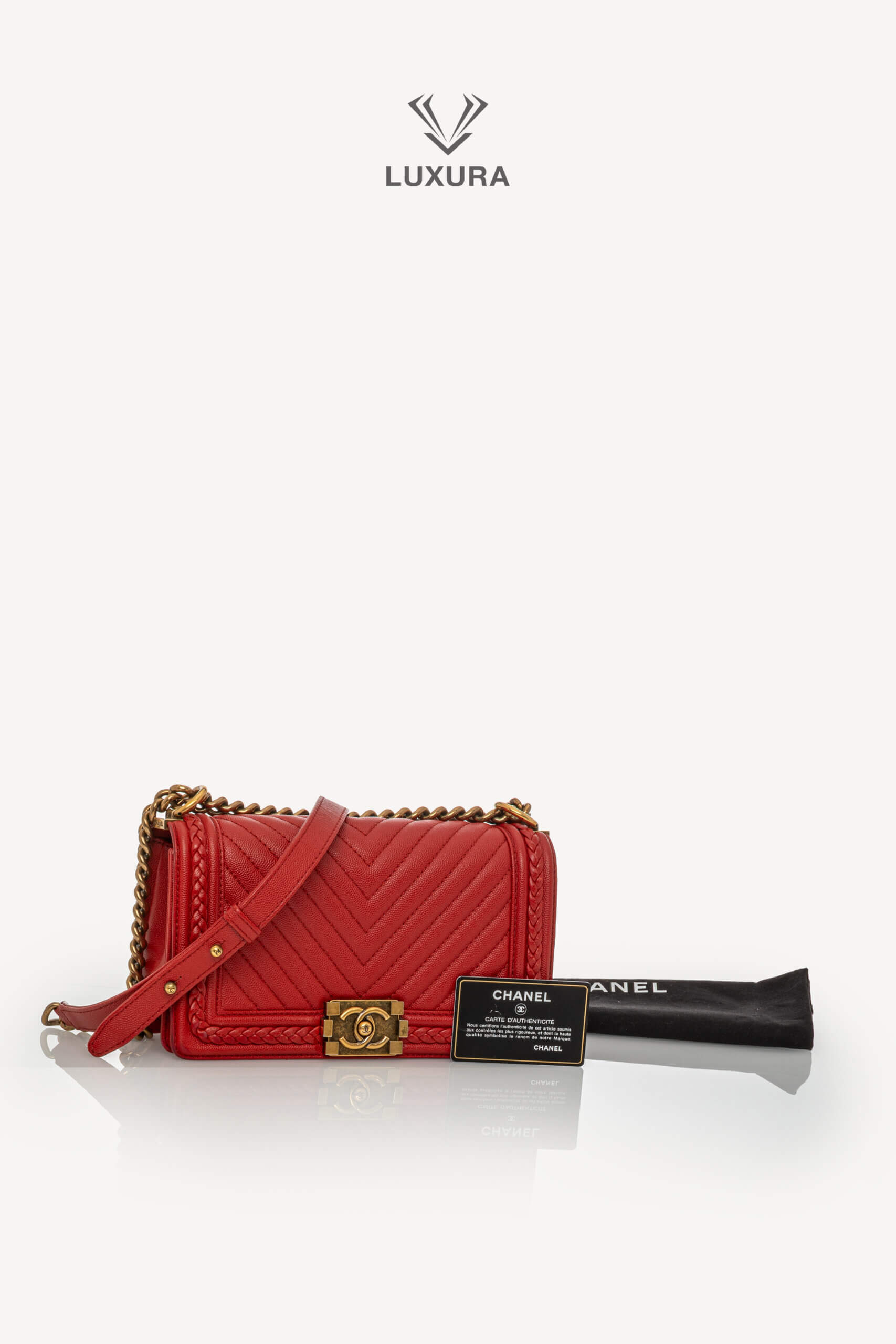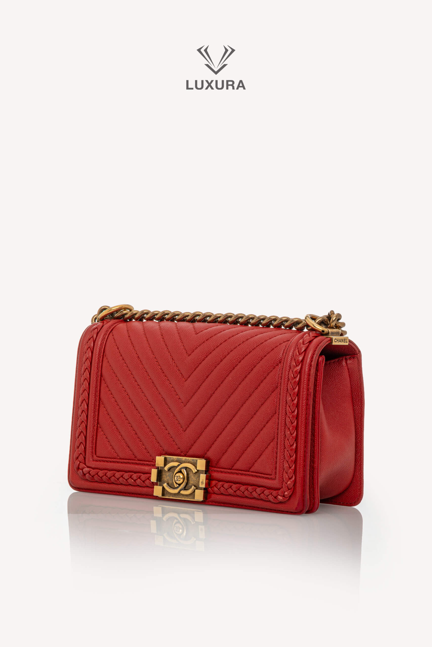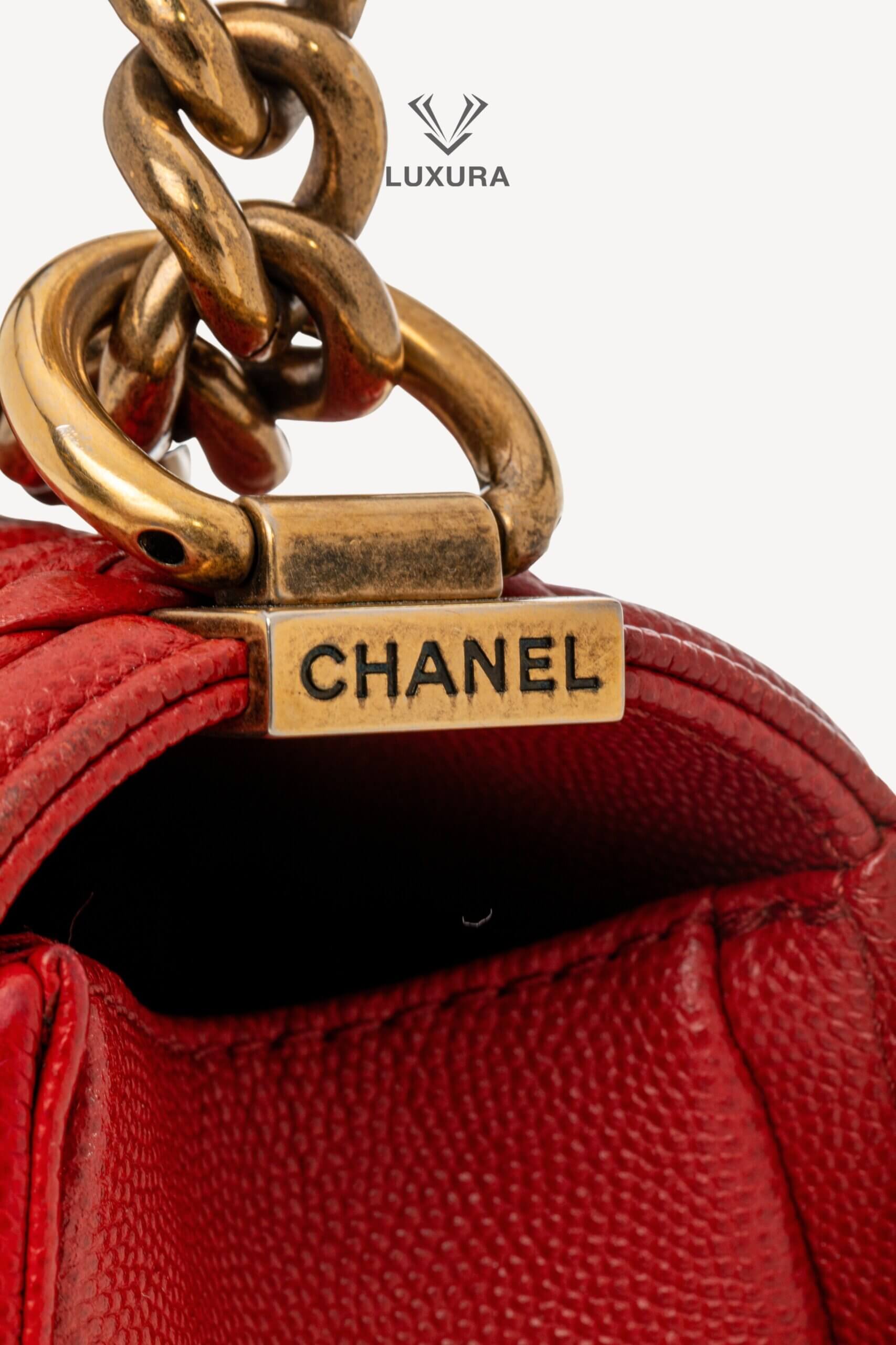 Geanta CHANEL Rare Le Boy Caviar Leather Chevron Braided Trim, mărime medium, are dimensiunile 25 cm lungime, 15 cm lățime și 8 cm adâncime. Este confecționată din piele caviar și material textil, având un hardware din ruthenium, în culoare roșu intens, atât la exterior, cât și la interior. Produsul este pre-owned, autentificat și se află într-o stare foarte bună, cu urme minore de uzură la colțuri și pe interiorul clapetei. Include accesorii originale: dust bag, cutie Luxura și certificat de conformitate, fiind disponibil în Luxura Boutique, platformă independentă de resale, fără afiliere cu brandul CHANEL.