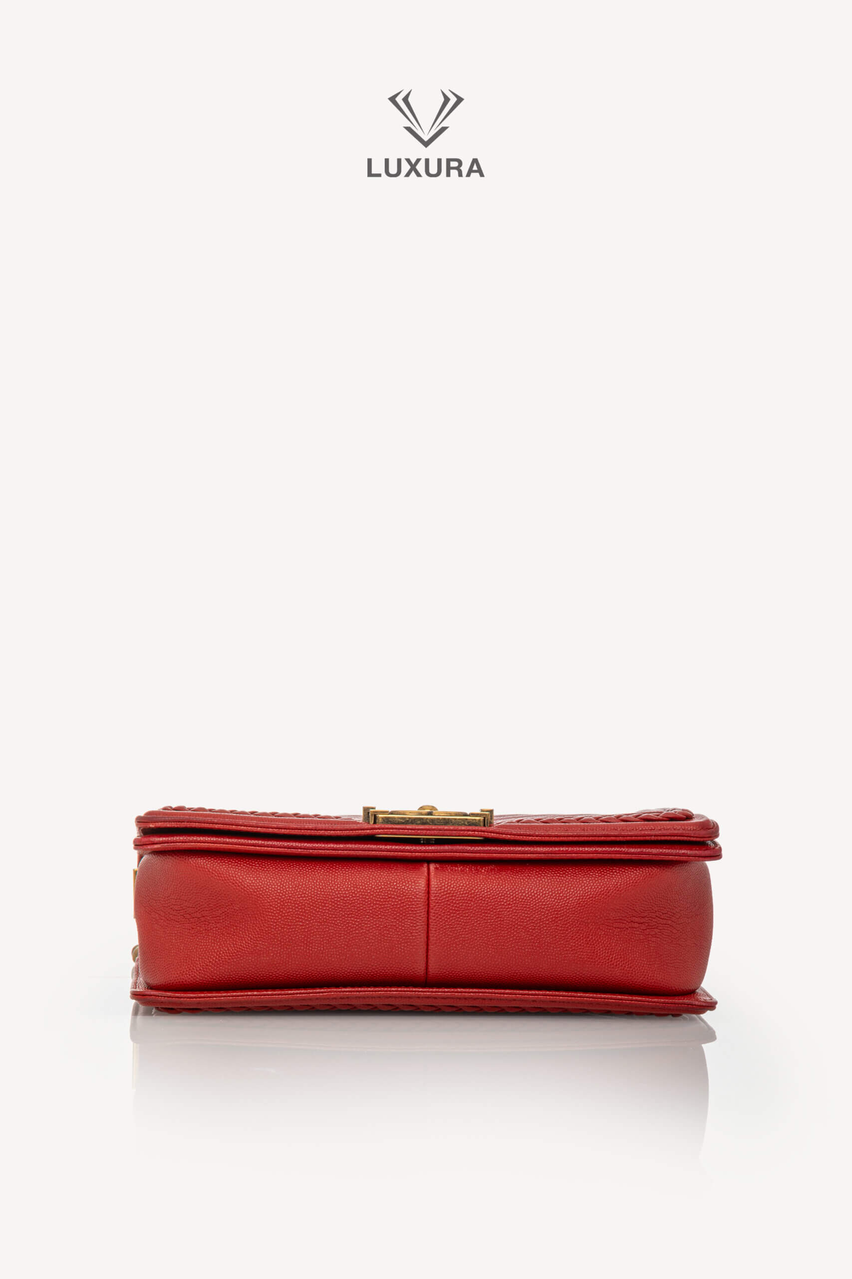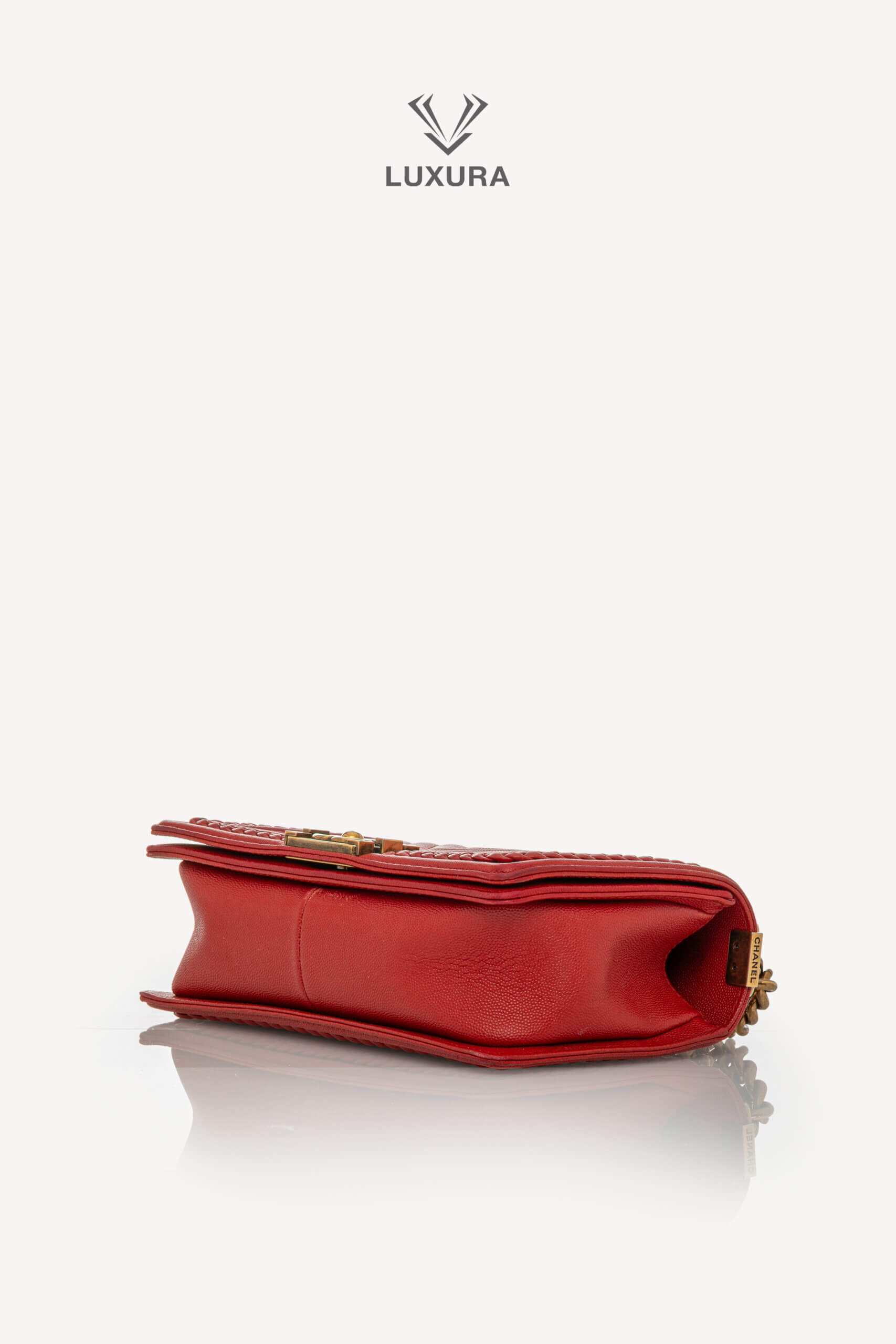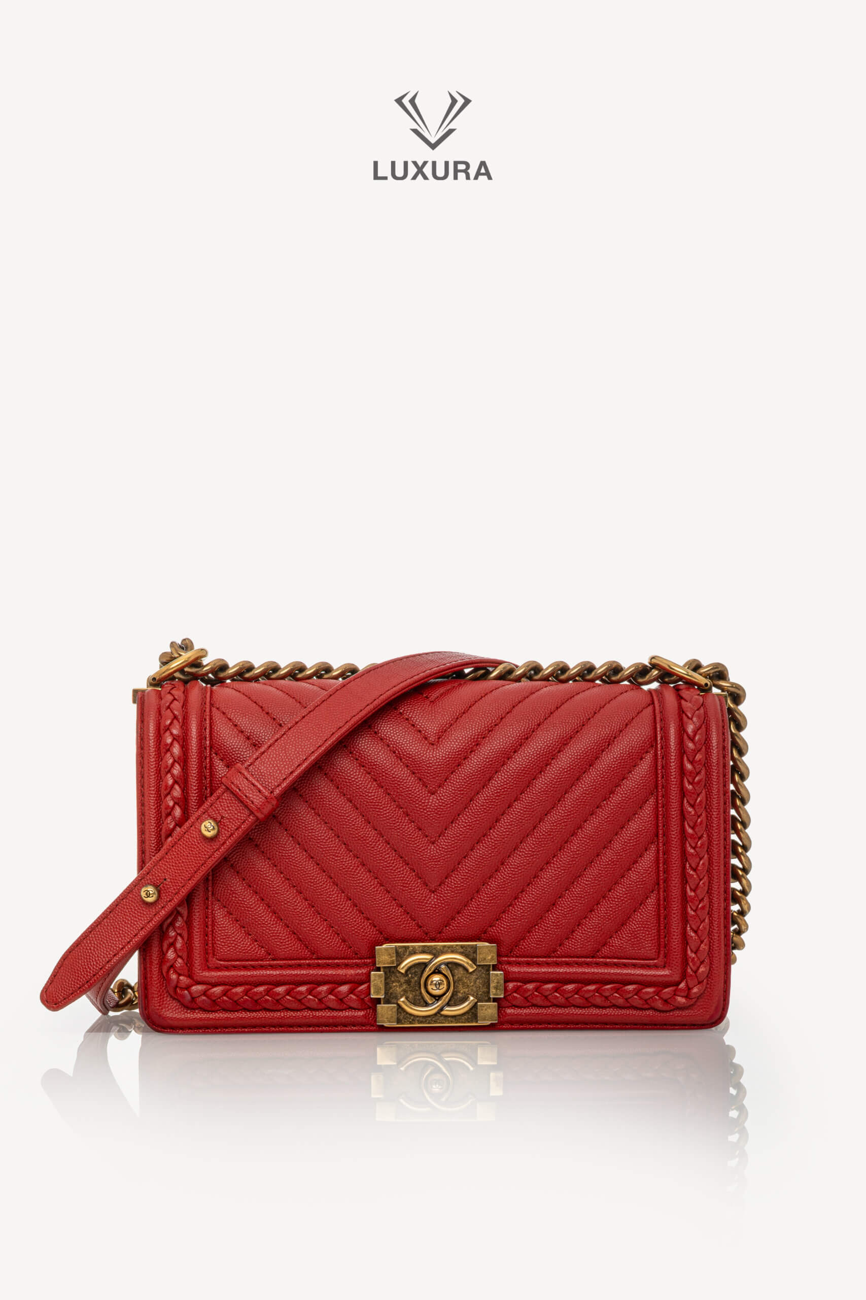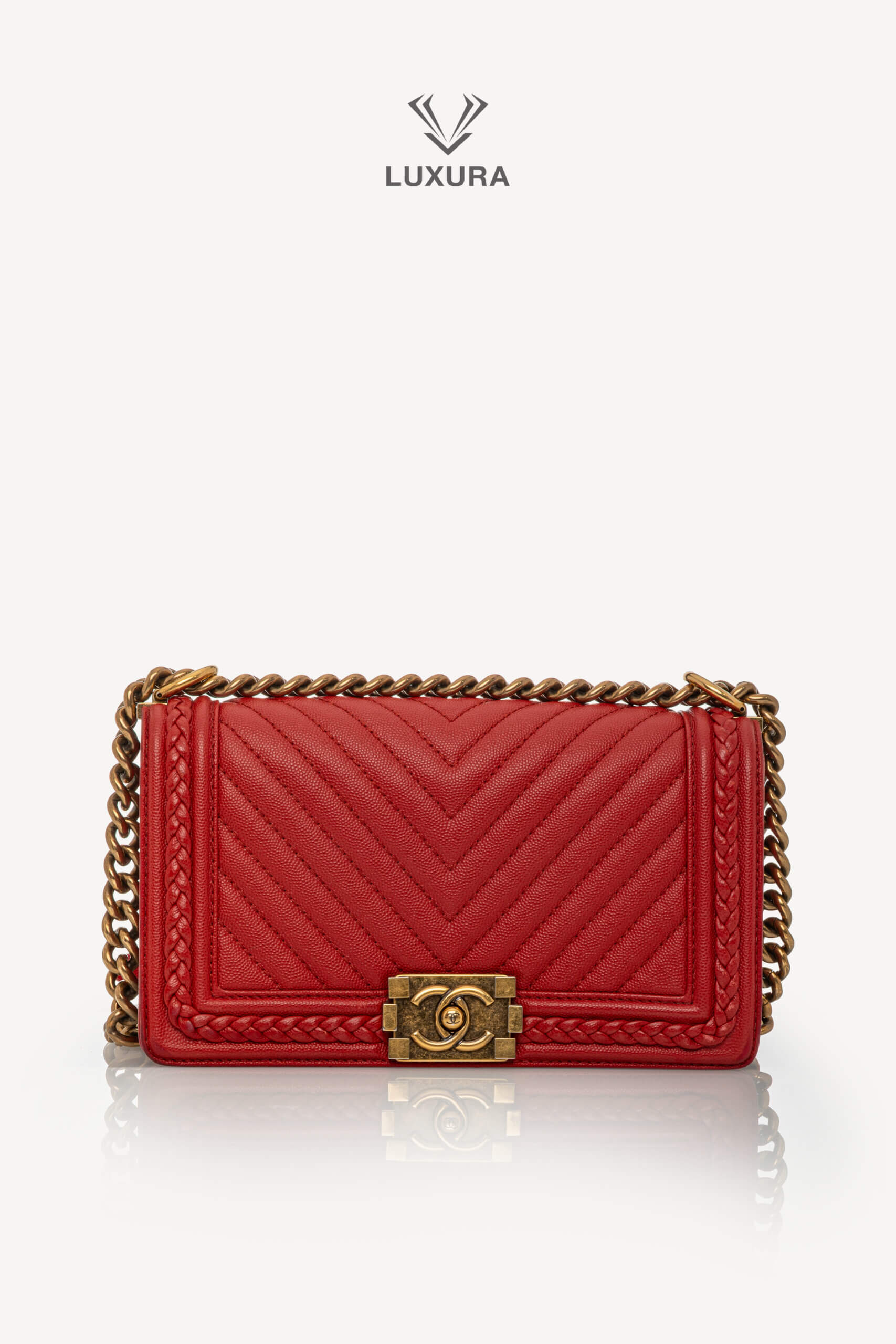 Geanta CHANEL Rare Le Boy Caviar Leather Chevron Braided Trim, mărime medium, are dimensiunile 25 cm lungime, 15 cm lățime și 8 cm adâncime. Este confecționată din piele caviar și material textil, având un hardware din ruthenium, în culoare roșu intens, atât la exterior, cât și la interior. Produsul este pre-owned, autentificat și se află într-o stare foarte bună, cu urme minore de uzură la colțuri și pe interiorul clapetei. Include accesorii originale: dust bag, cutie Luxura și certificat de conformitate, fiind disponibil în Luxura Boutique, platformă independentă de resale, fără afiliere cu brandul CHANEL.