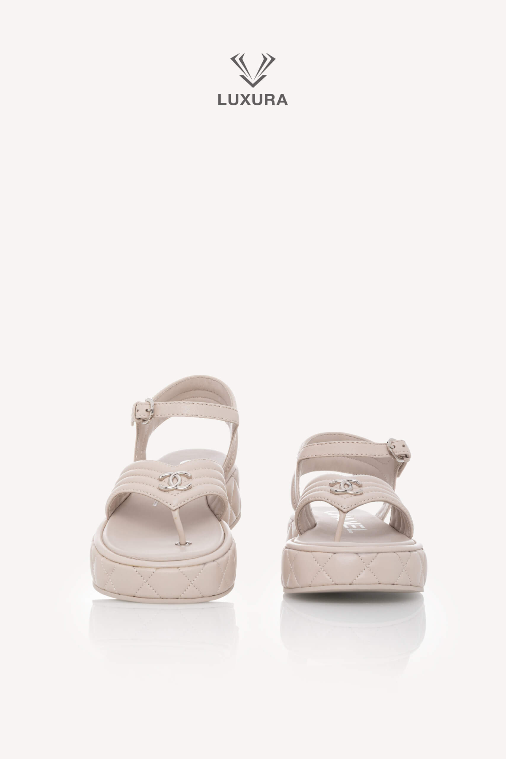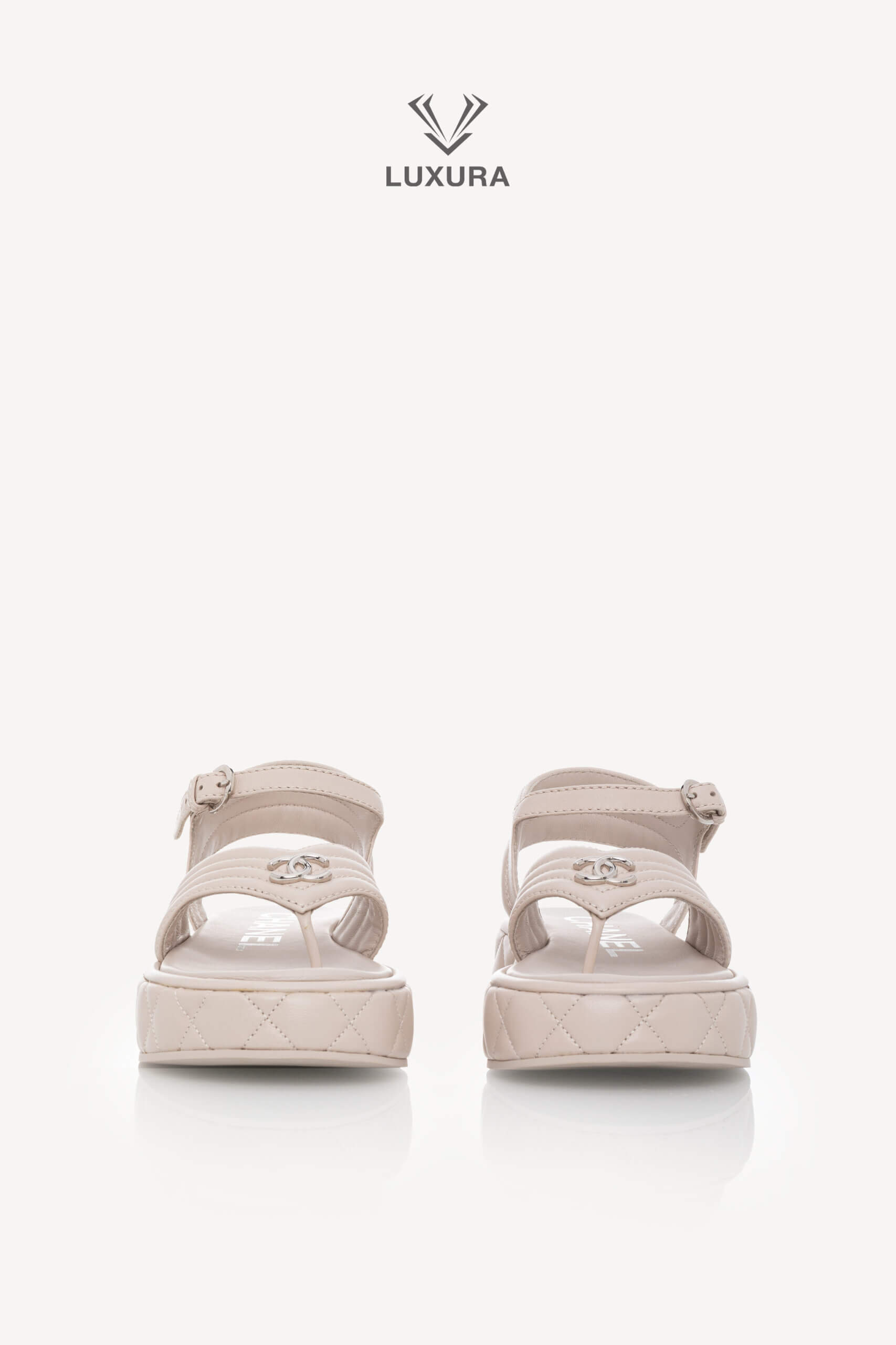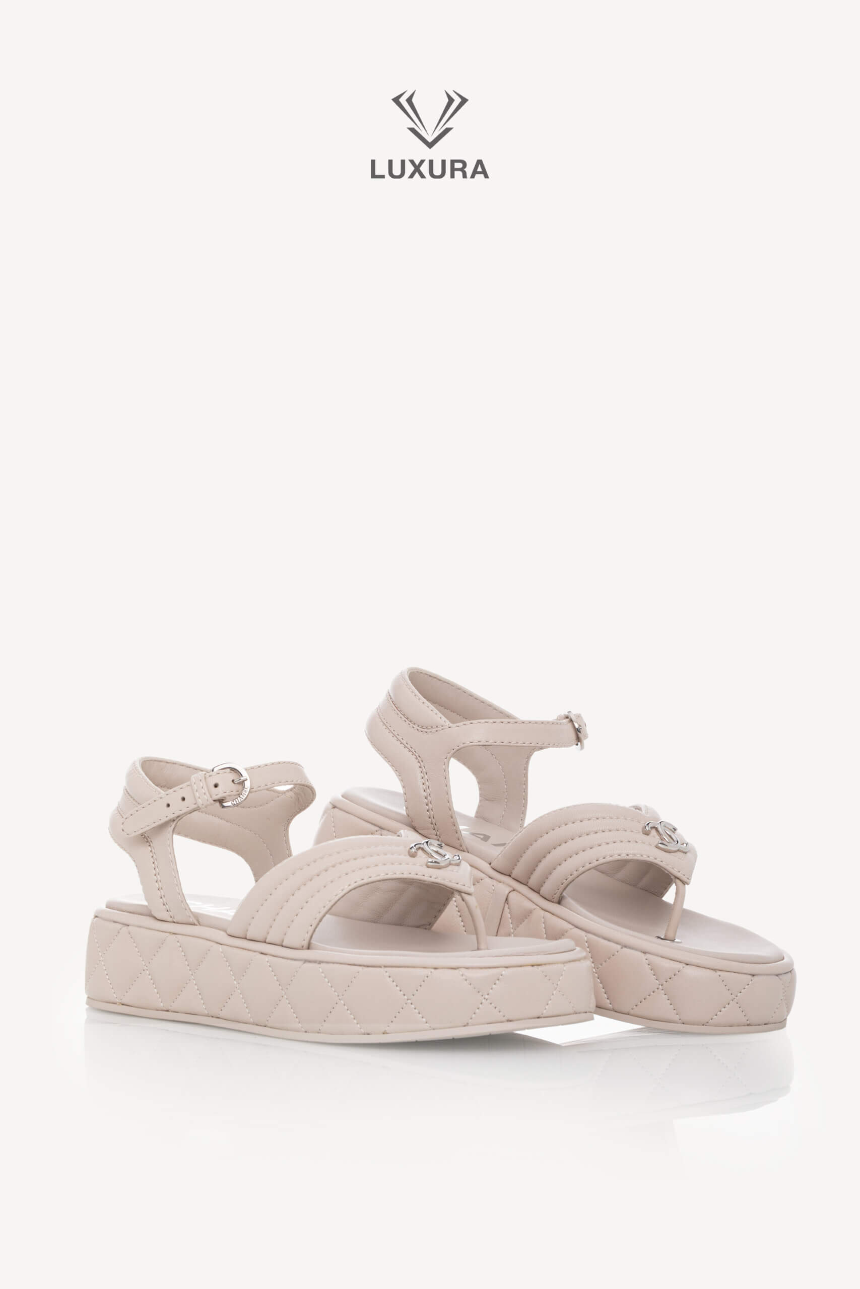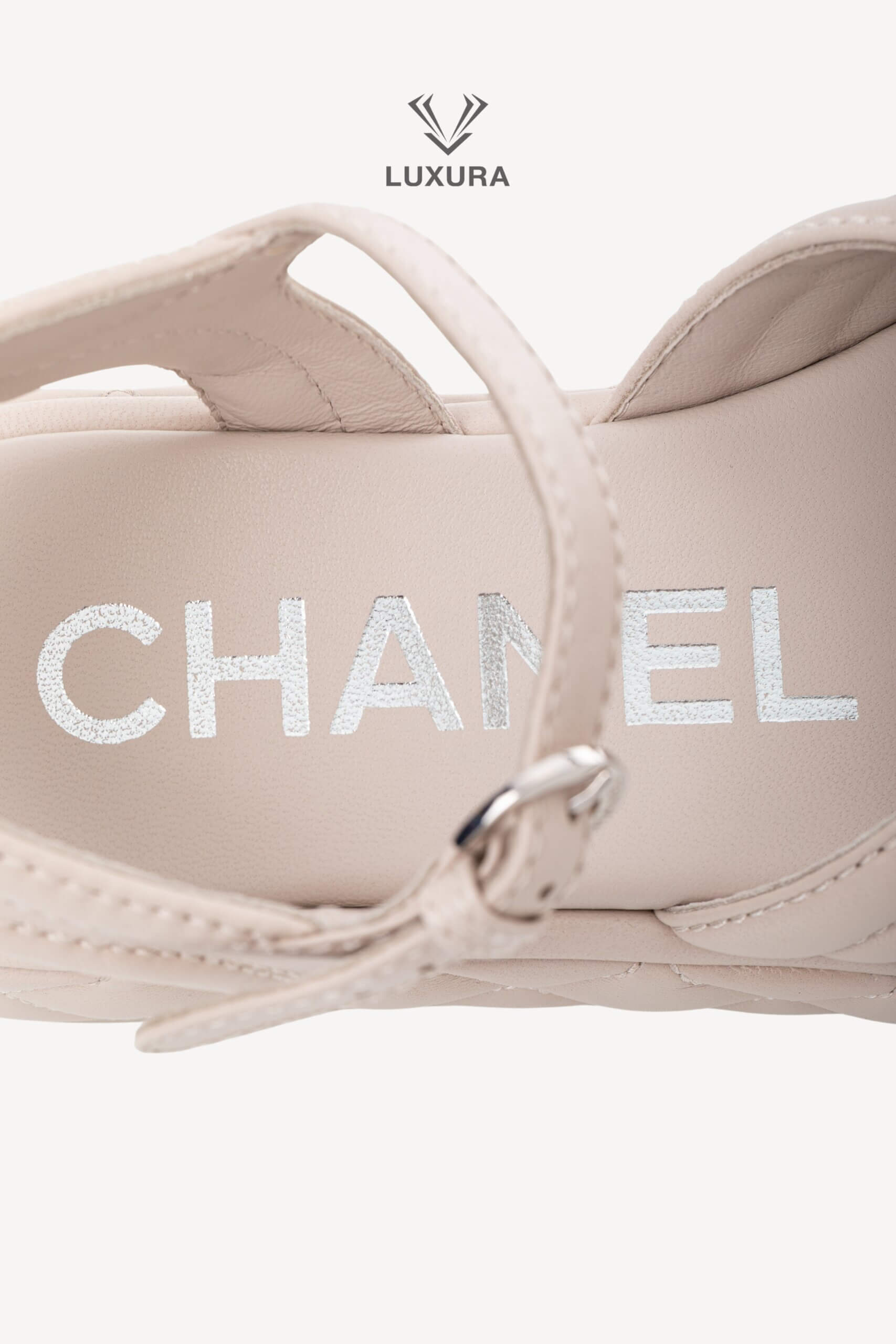 Sandalele CHANEL Strap Light Grey, mărimea 37 (24 cm), sunt realizate integral din piele de calitate superioară, cu detalii hardware argintii. Produsul este pre-owned, însă în stare impecabilă, neutilizat, și este livrat cu toate accesoriile originale: cutie, dust bag, card și certificat de conformitate. Aceste sandale reflectă o dimensiune true size, asigurând confort și potrivire precisă. Disponibile exclusiv online prin platforma Luxura Elite, independentă de brandul CHANEL.