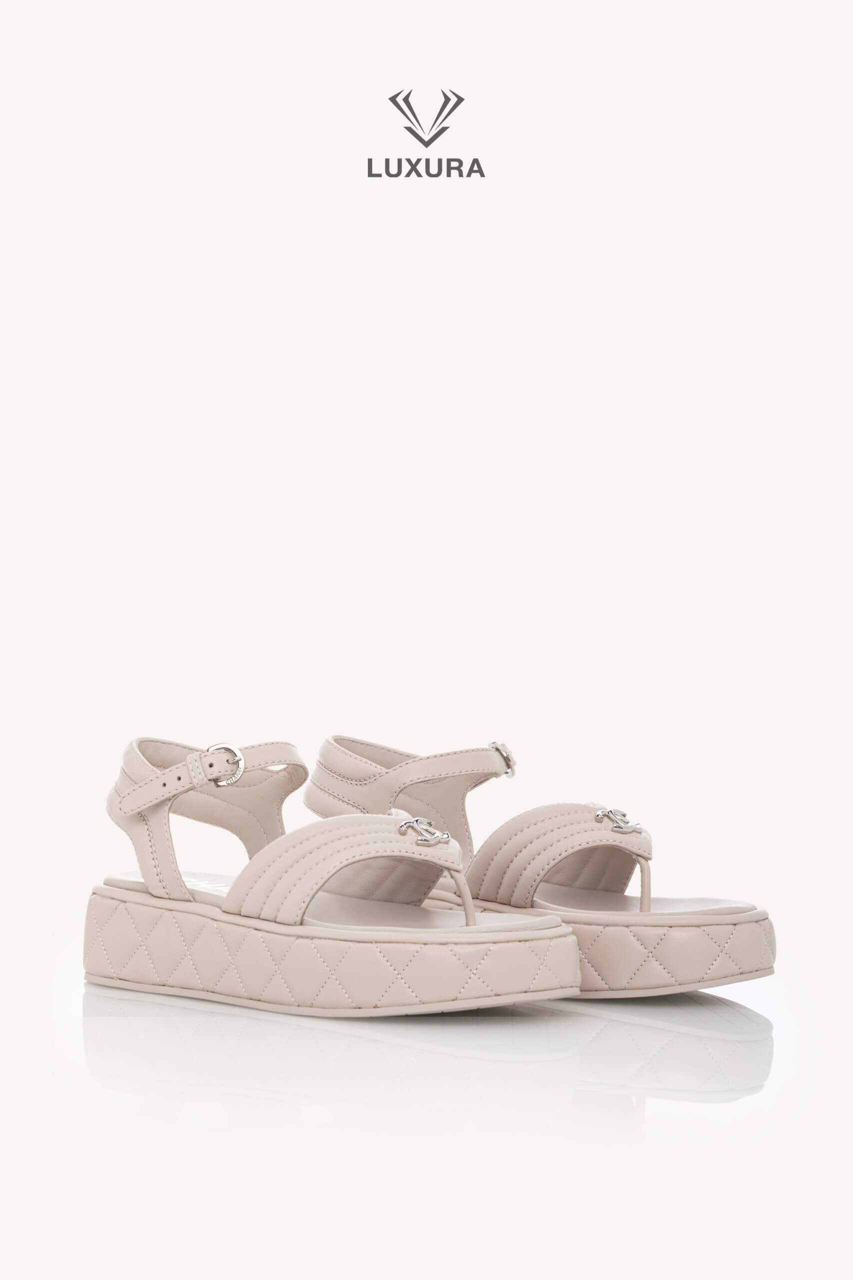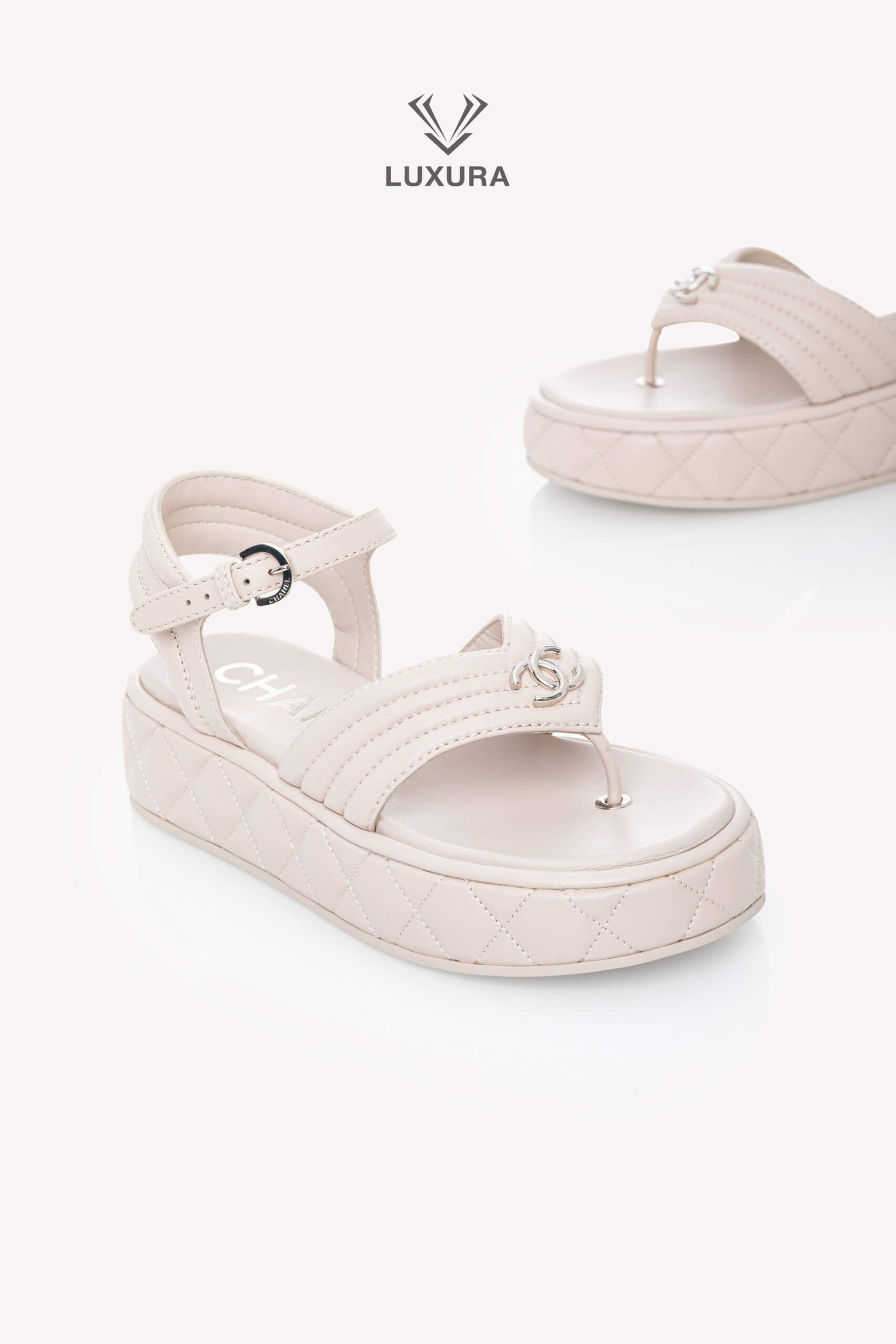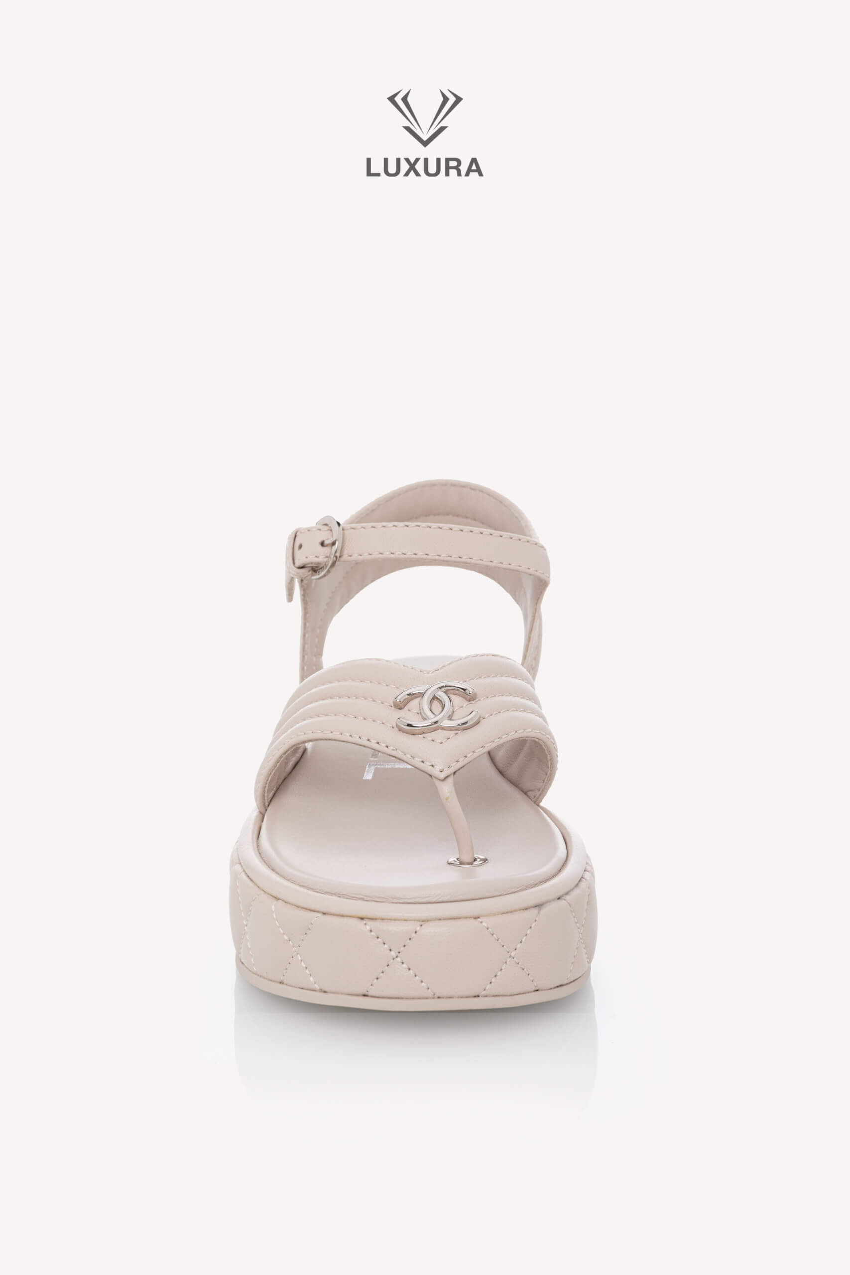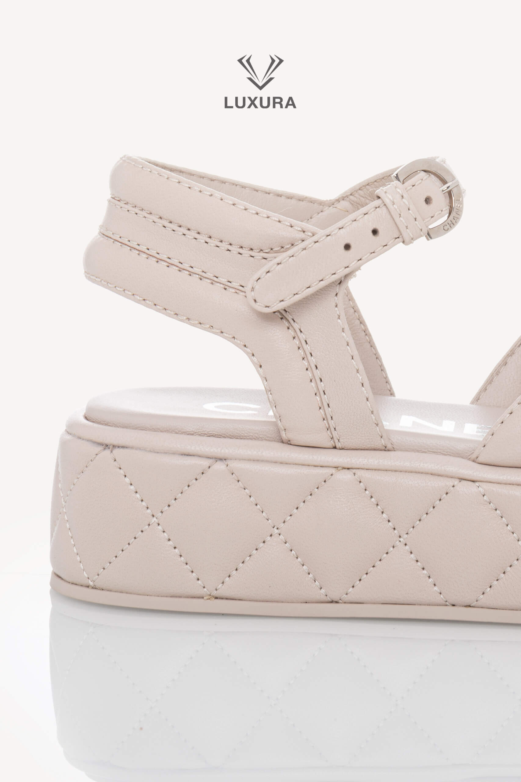 Sandalele CHANEL Strap Light Grey, mărimea 37 (24 cm), sunt realizate integral din piele de calitate superioară, cu detalii hardware argintii. Produsul este pre-owned, însă în stare impecabilă, neutilizat, și este livrat cu toate accesoriile originale: cutie, dust bag, card și certificat de conformitate. Aceste sandale reflectă o dimensiune true size, asigurând confort și potrivire precisă. Disponibile exclusiv online prin platforma Luxura Elite, independentă de brandul CHANEL.