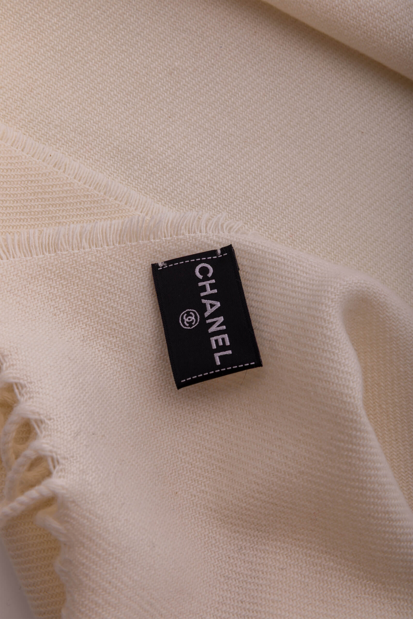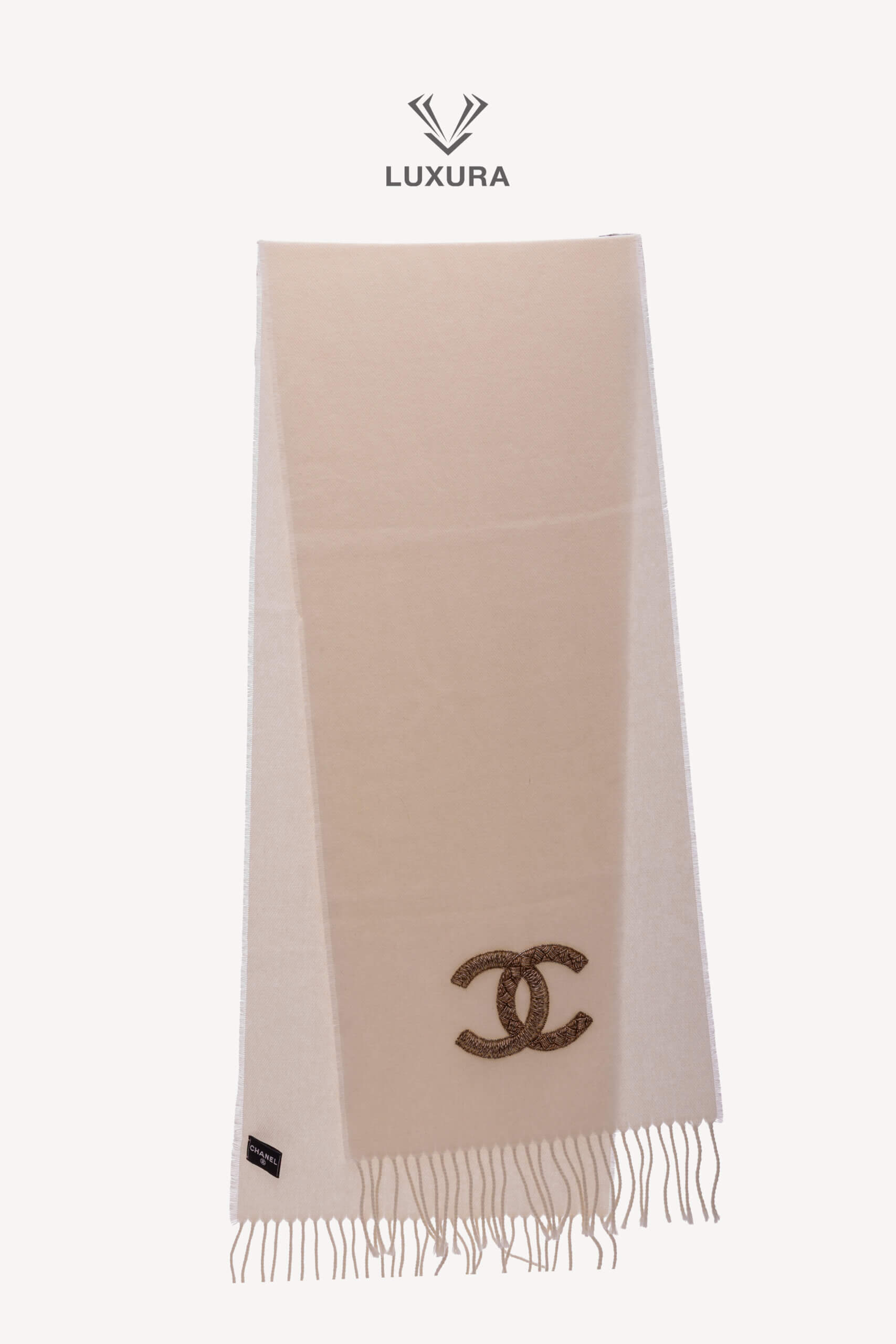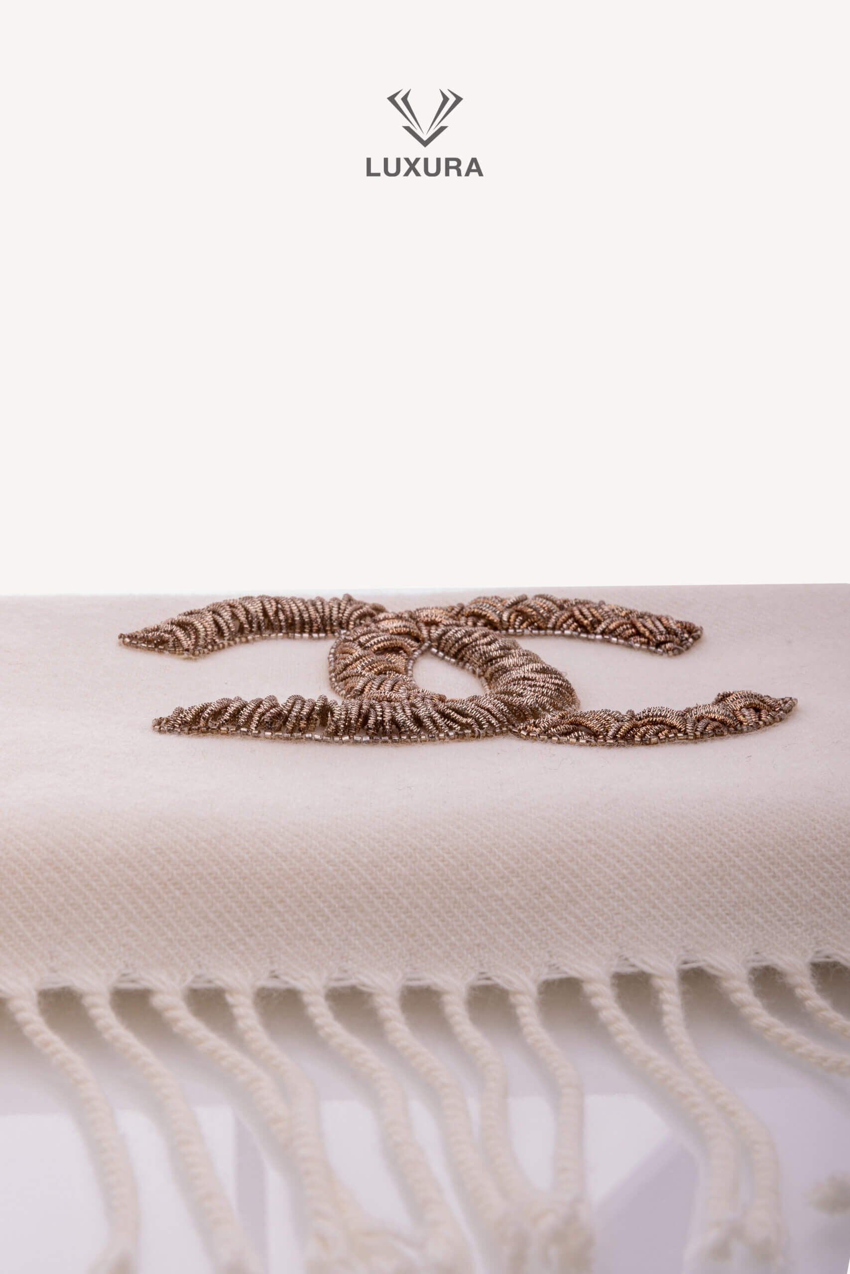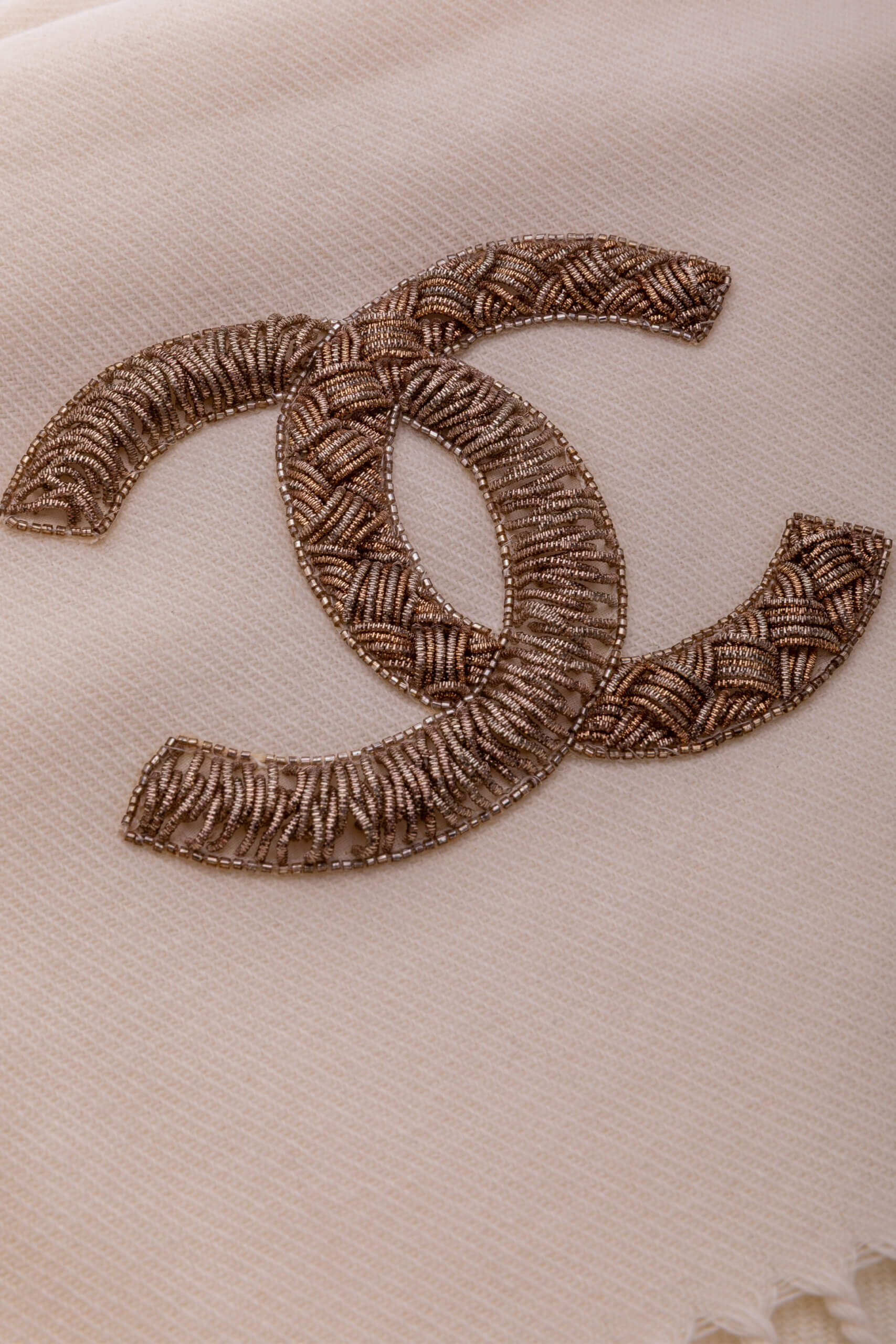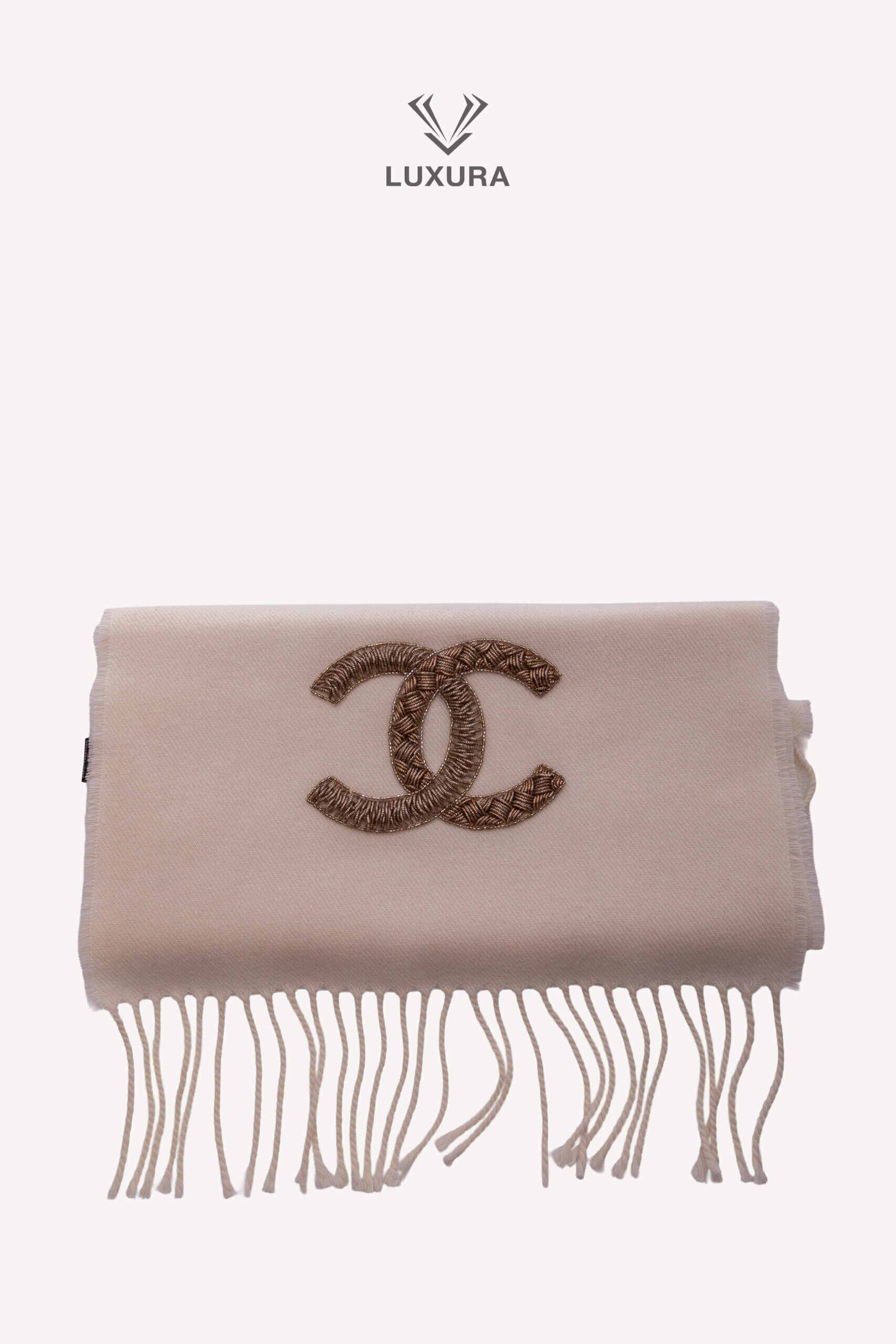 CHANEL White Cashmere and wool blend scarf with a Gold -Sequined CC Logo Alb – Accesorii de colecție