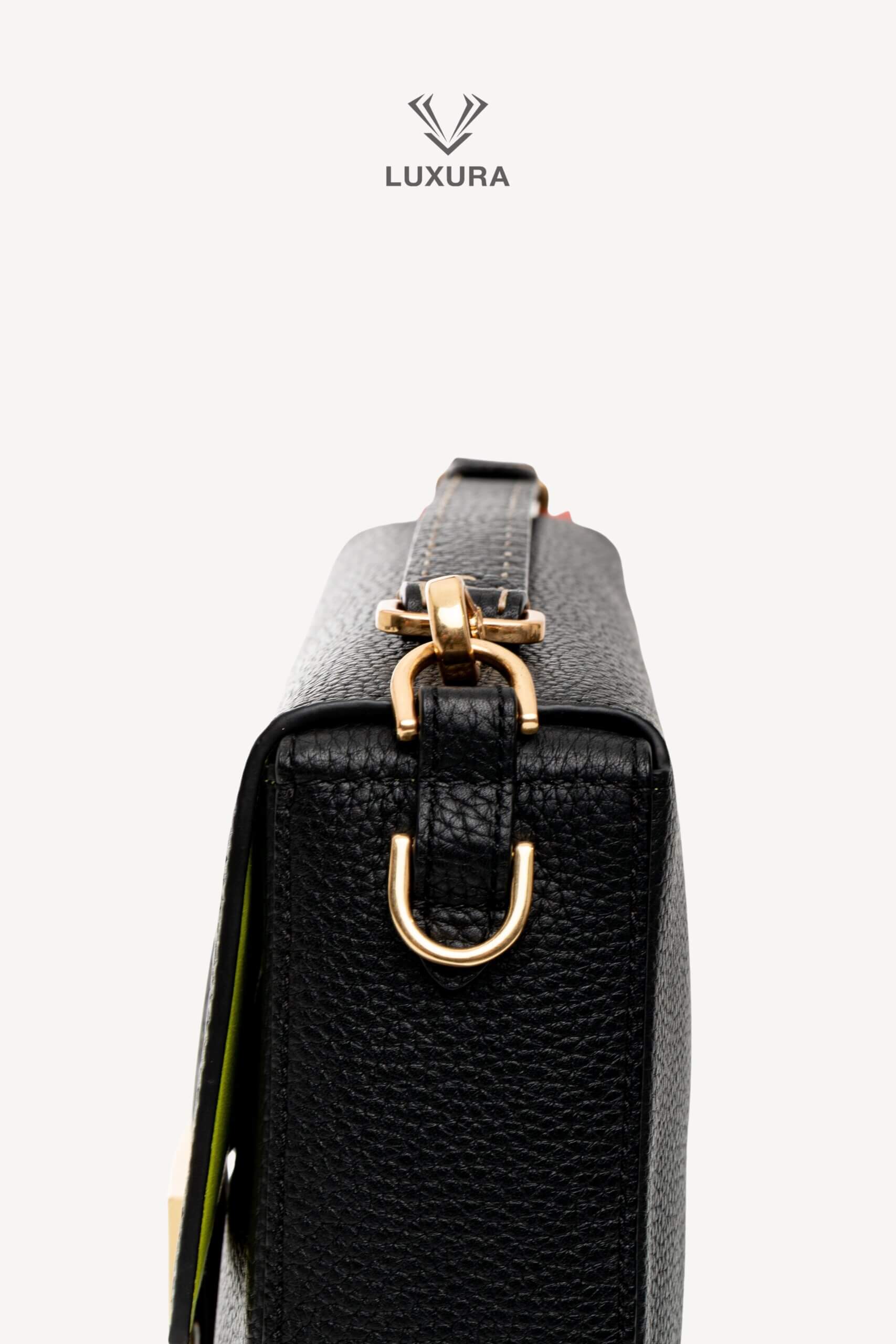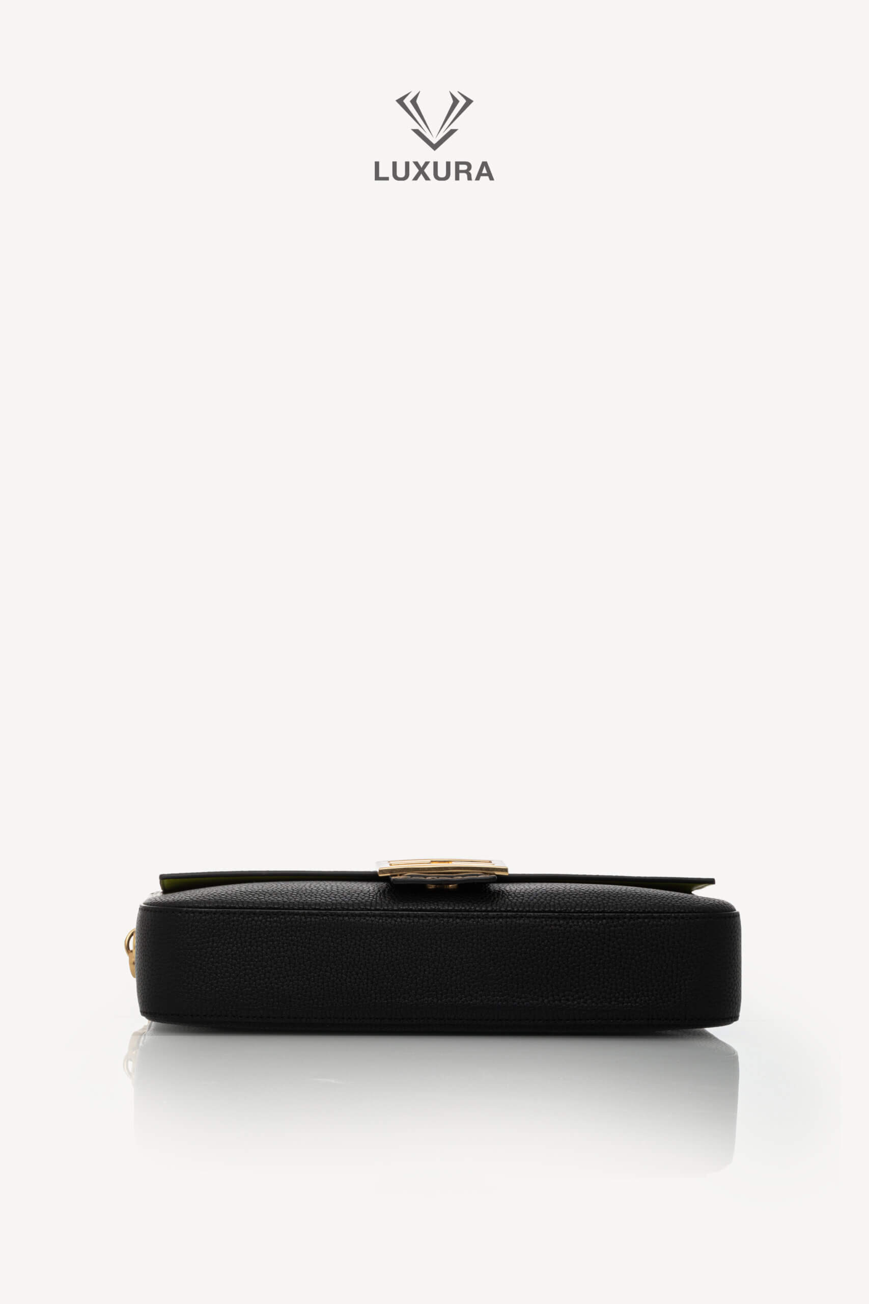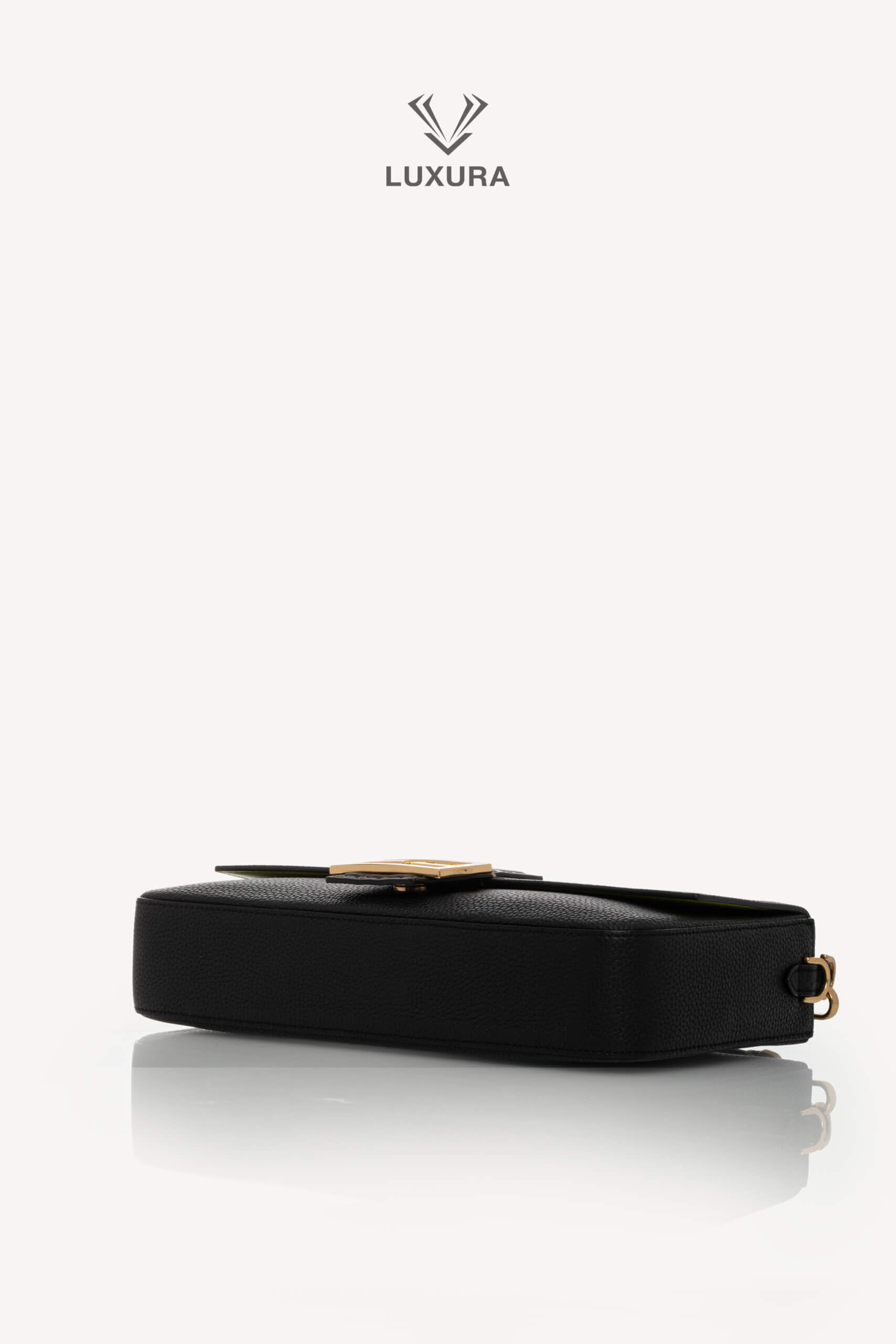 Geanta FENDI Baguette Selleria Leather Shoulder Bag în dimensiunea Large măsoară 33 cm lungime, 18 cm lățime și 6.5 cm adâncime. Exteriorul și interiorul sunt confecționate din piele de înaltă calitate, cu detalii hardware aurii. Culoarea exterioară este negru, iar interiorul verde, oferind un contrast sofisticat. Acest exemplar pre-owned este autentificat și însoțit de cutie Luxura, dust bag, card și certificat de conformitate.