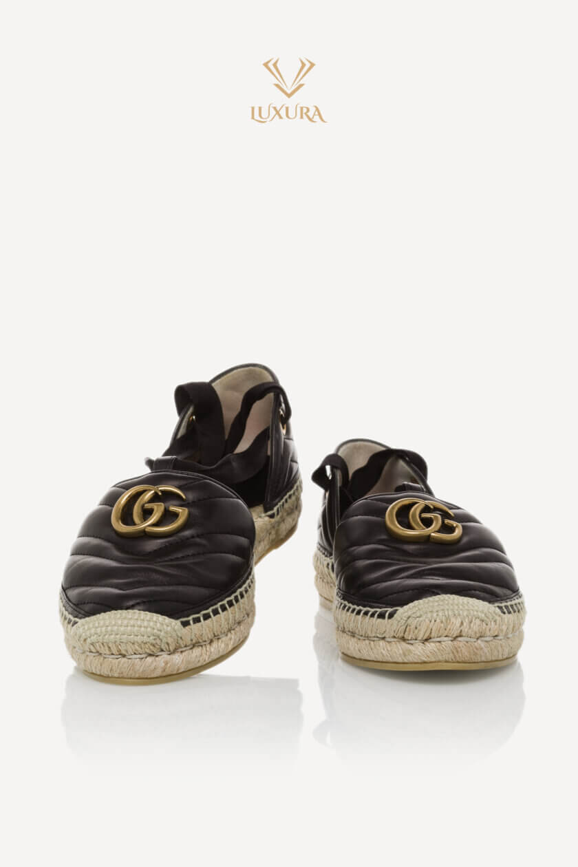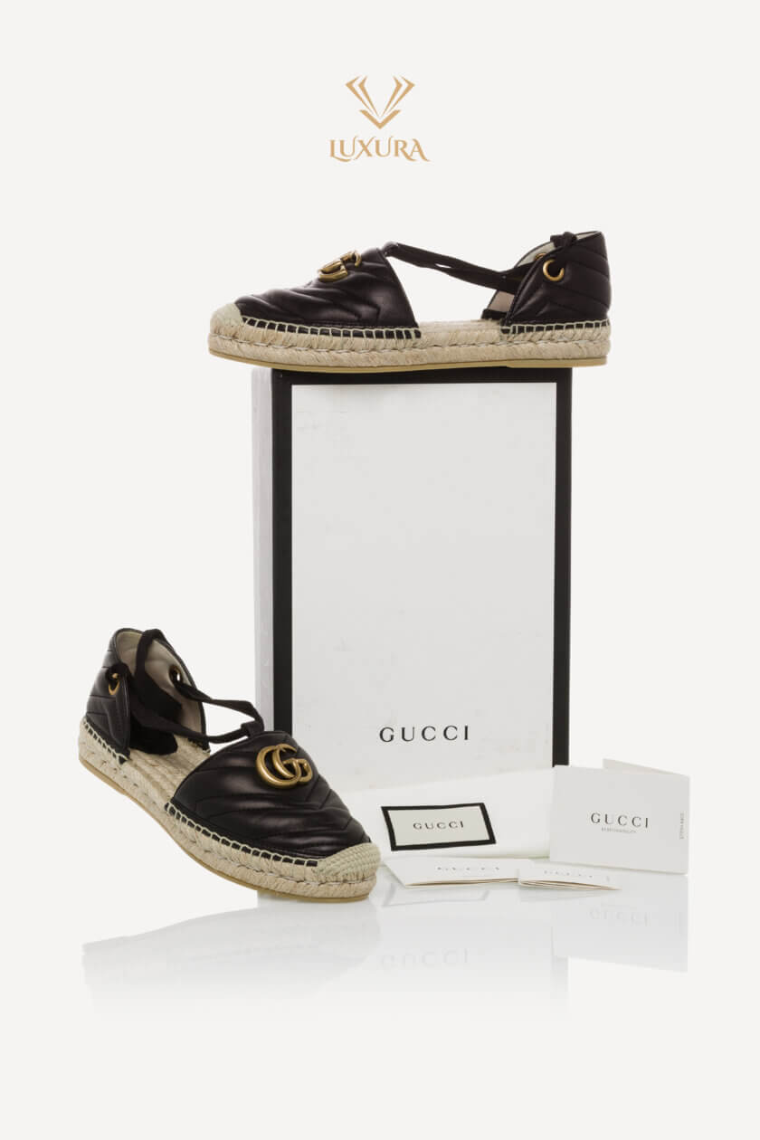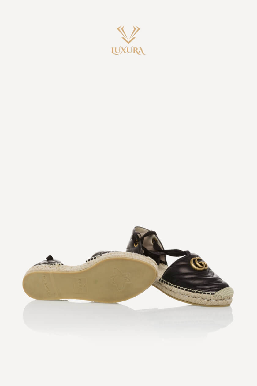 Aceasta este o pereche autentică de GUCCI Nappa Matelasse GG Marmont Ankle Wrap Espadrille. Espadrilele șic au fețe negre țesute, cu bretele de pânză la glezne, un logo GG auriu învechit și o talpă de iută.