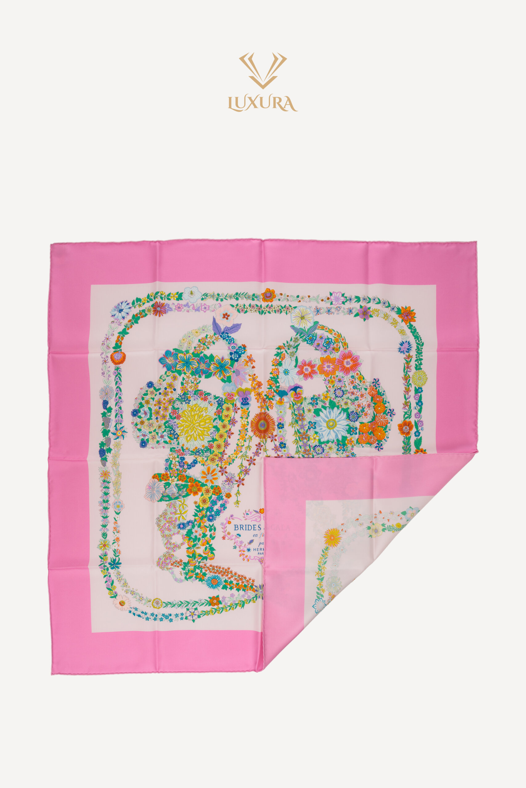 Carre 90 Brides de Gala en Fleurs Rose Bonbon Rose Dragee Vert