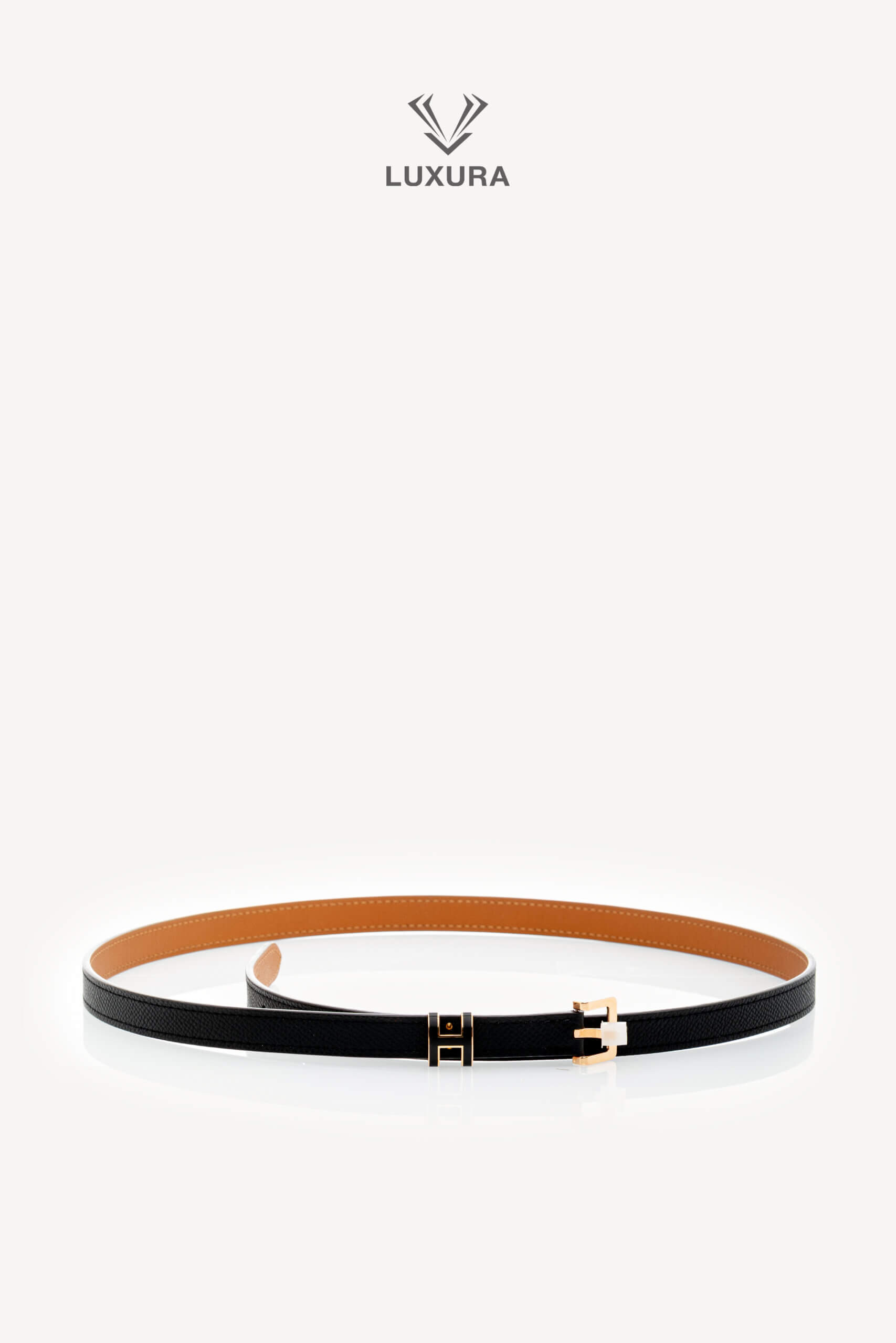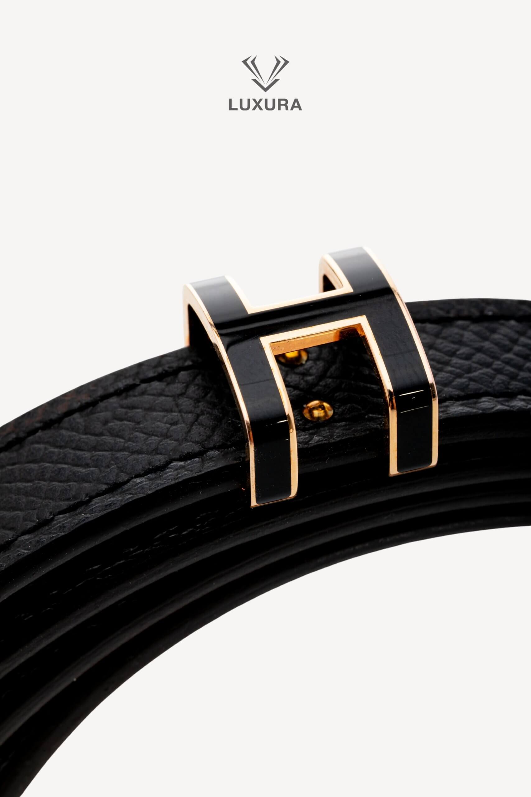 Cureaua Hermes Pop H 15 Belt Noir are o lungime de 90 cm și o latime de 1.5 cm, fiind realizată din piele Epsom la exterior și piele la interior. Accesoriile sale metalice sunt placate cu rose gold, oferind un contrast elegant cu nuanța Noir. Produsul este pre-owned, autentic și în stare impecabilă, însoțit de cutie originală, dust bag și certificat de conformitate. Această piesă este disponibilă prin Luxura Elite, o platformă independentă de resale, neafiliată brandului Hermes.