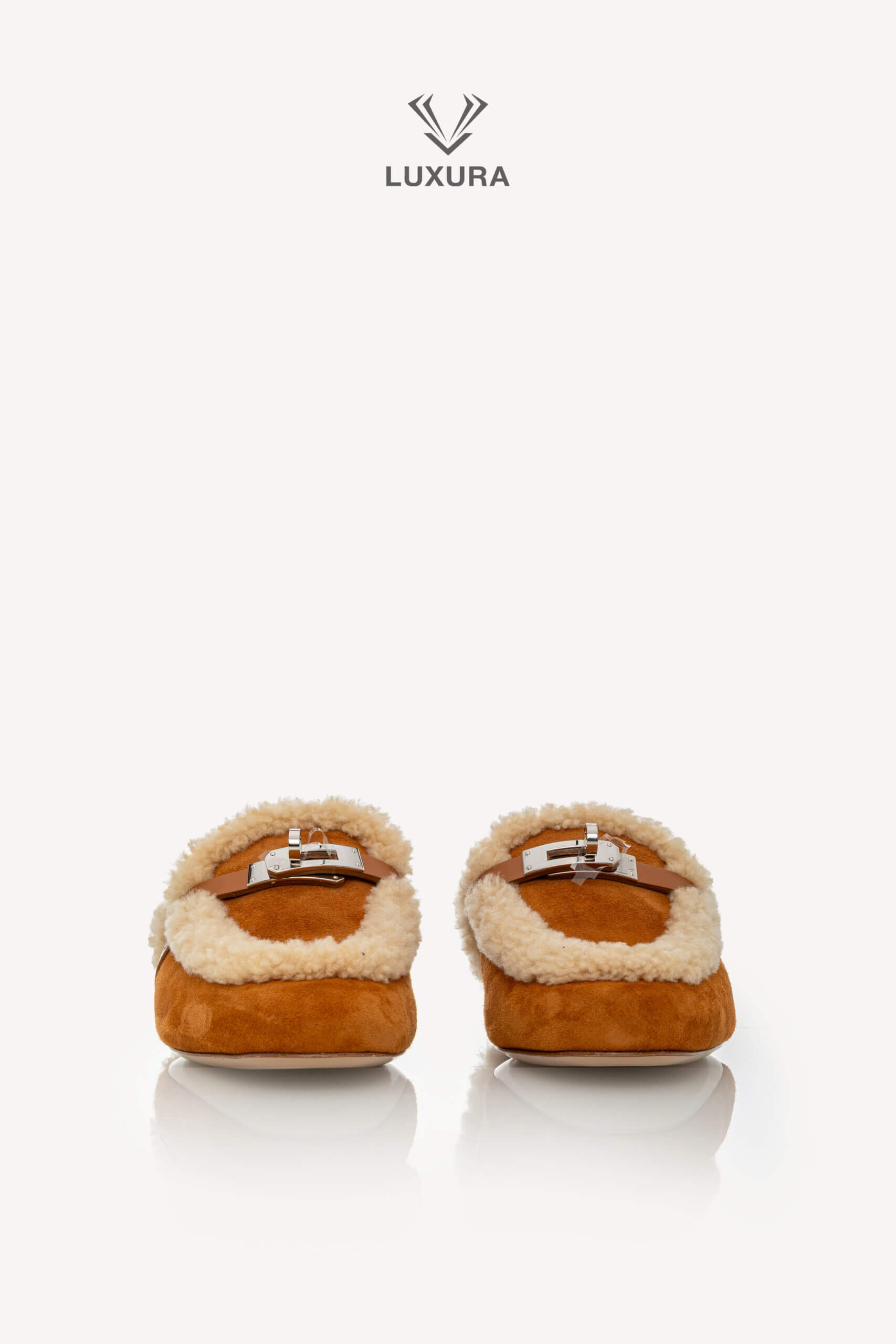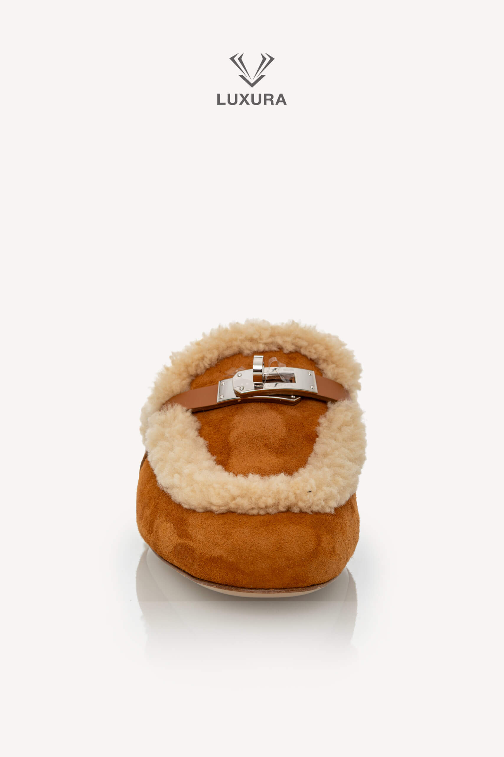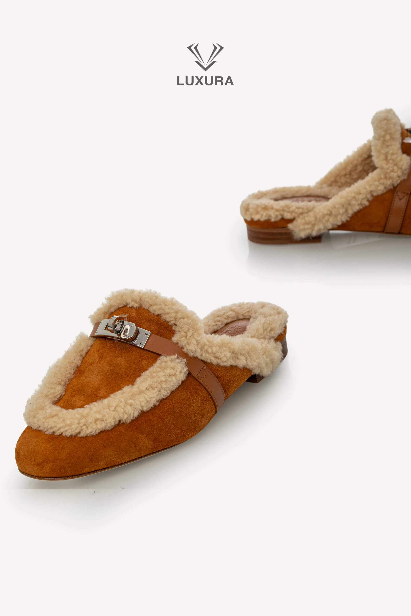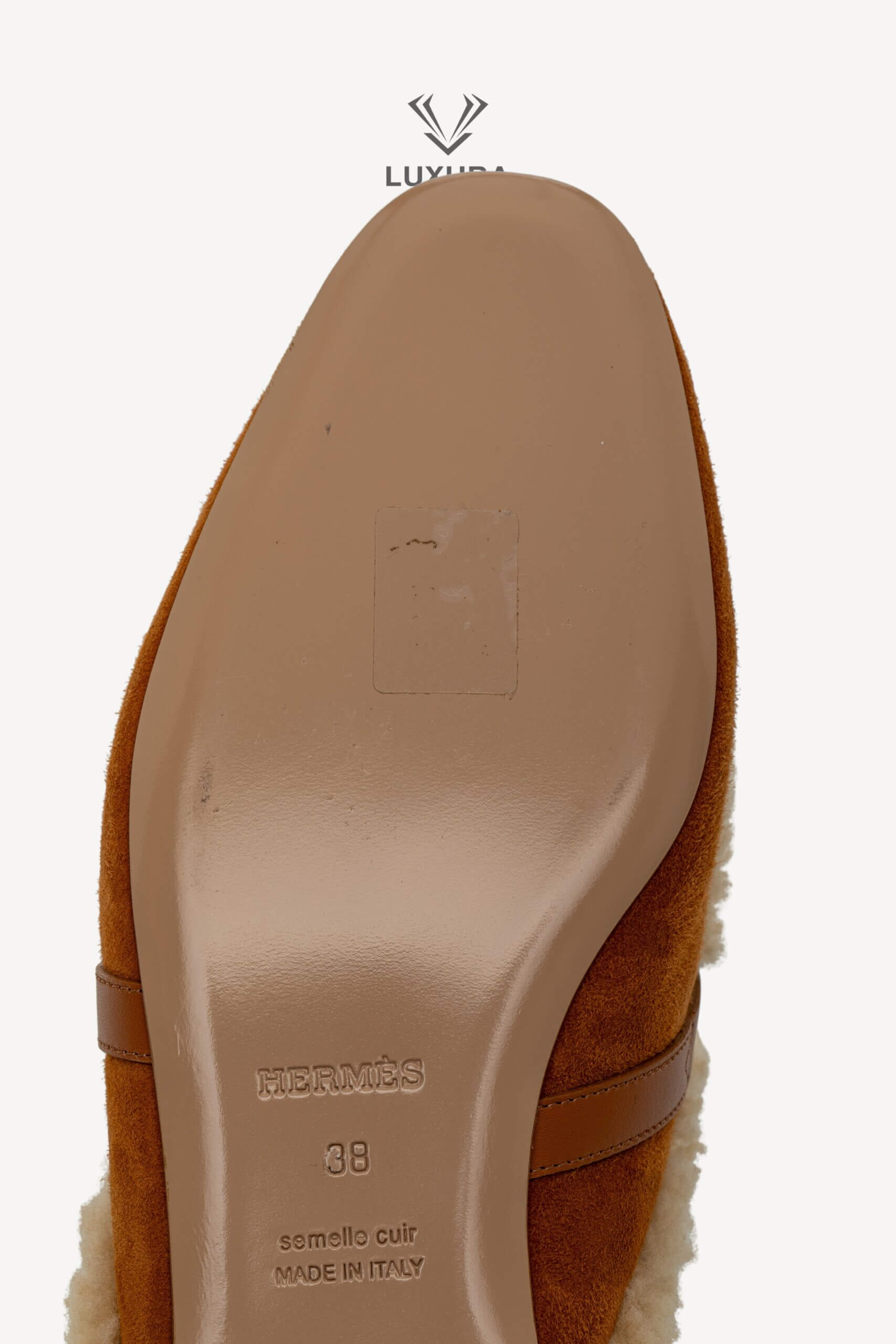 Această pereche pre-owned de mule Hermes Shearling Suede Oz, mărimea 38 (24.47 cm), este confecționată din piele de capră suede și piele de vițel, cu interior din blană shearling pentru confort și căldură. Culoarea naturel accentuează textura naturală a materialelor, iar hardware-ul argintiu adaugă un detaliu discret de rafinament. Produsul este autentic, în stare impecabilă, și este livrat cu cutia originală, dust bag și certificat de conformitate. Luxura Elite este o platformă independentă de resale, fără afiliere cu brandul Hermes.