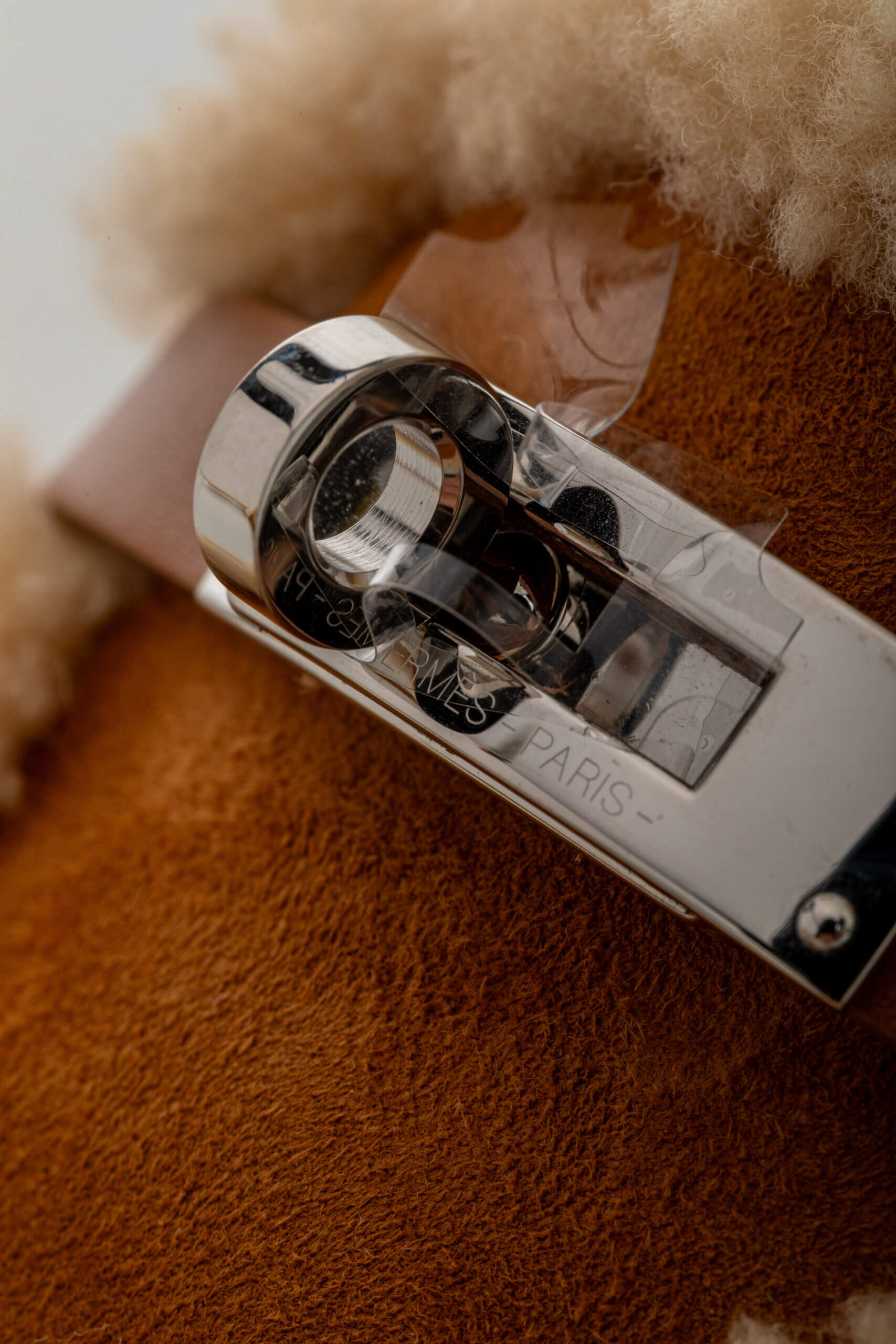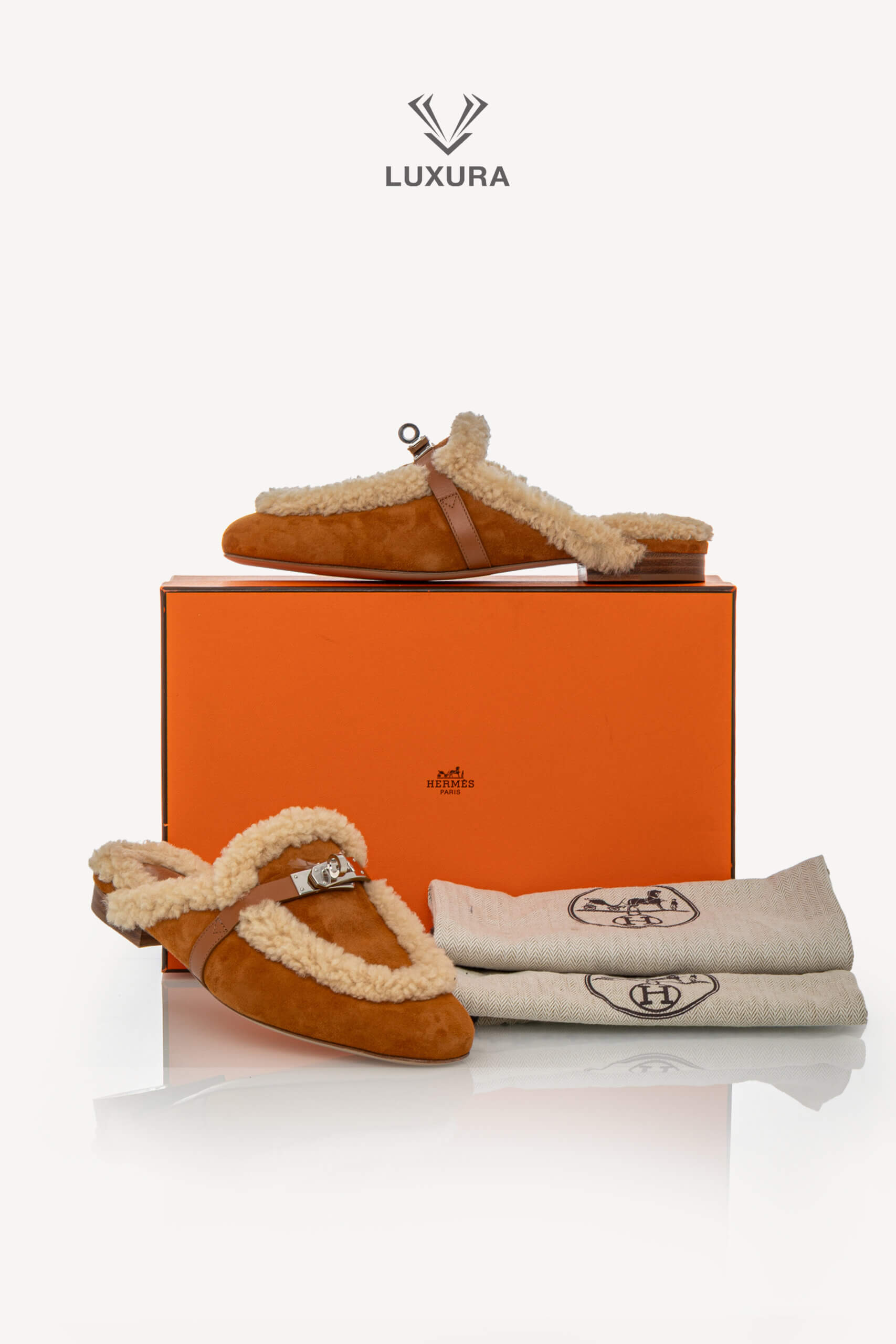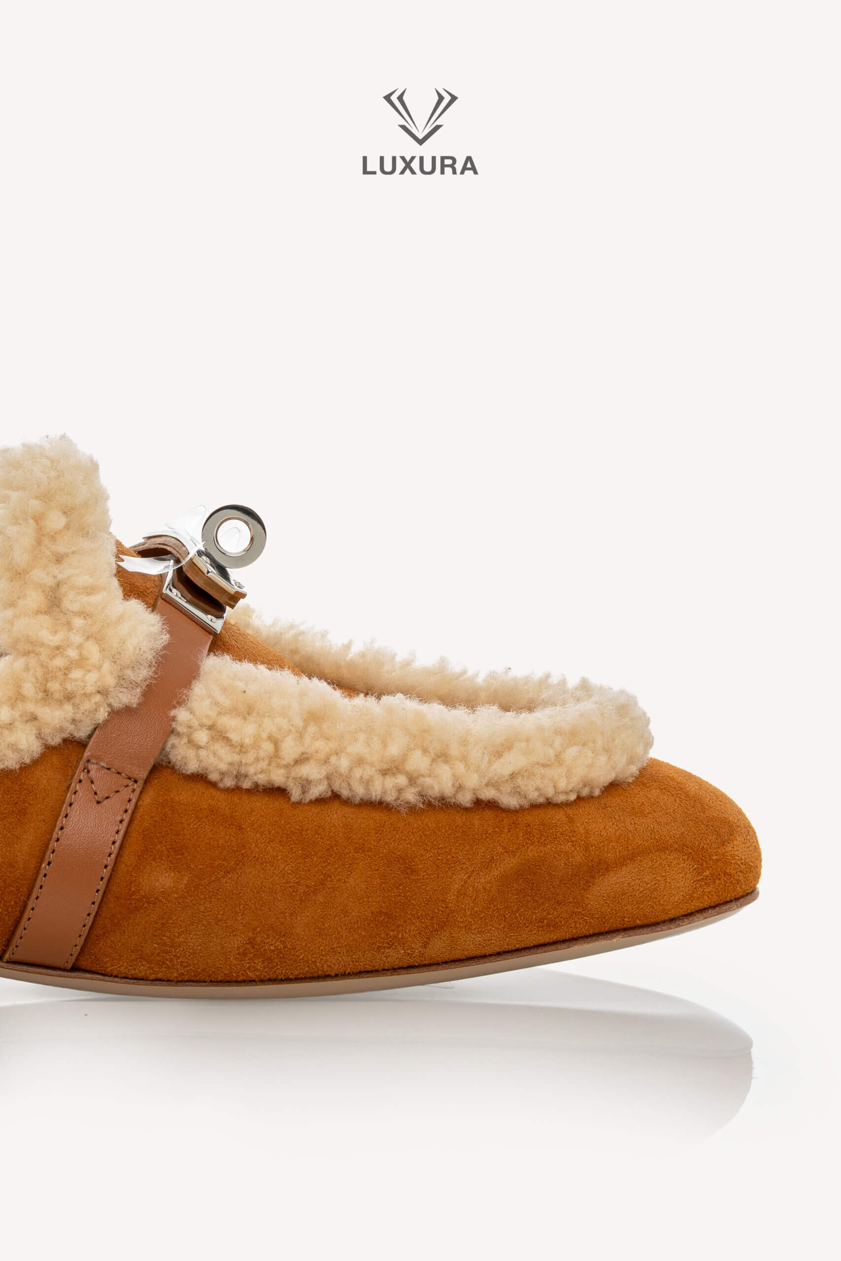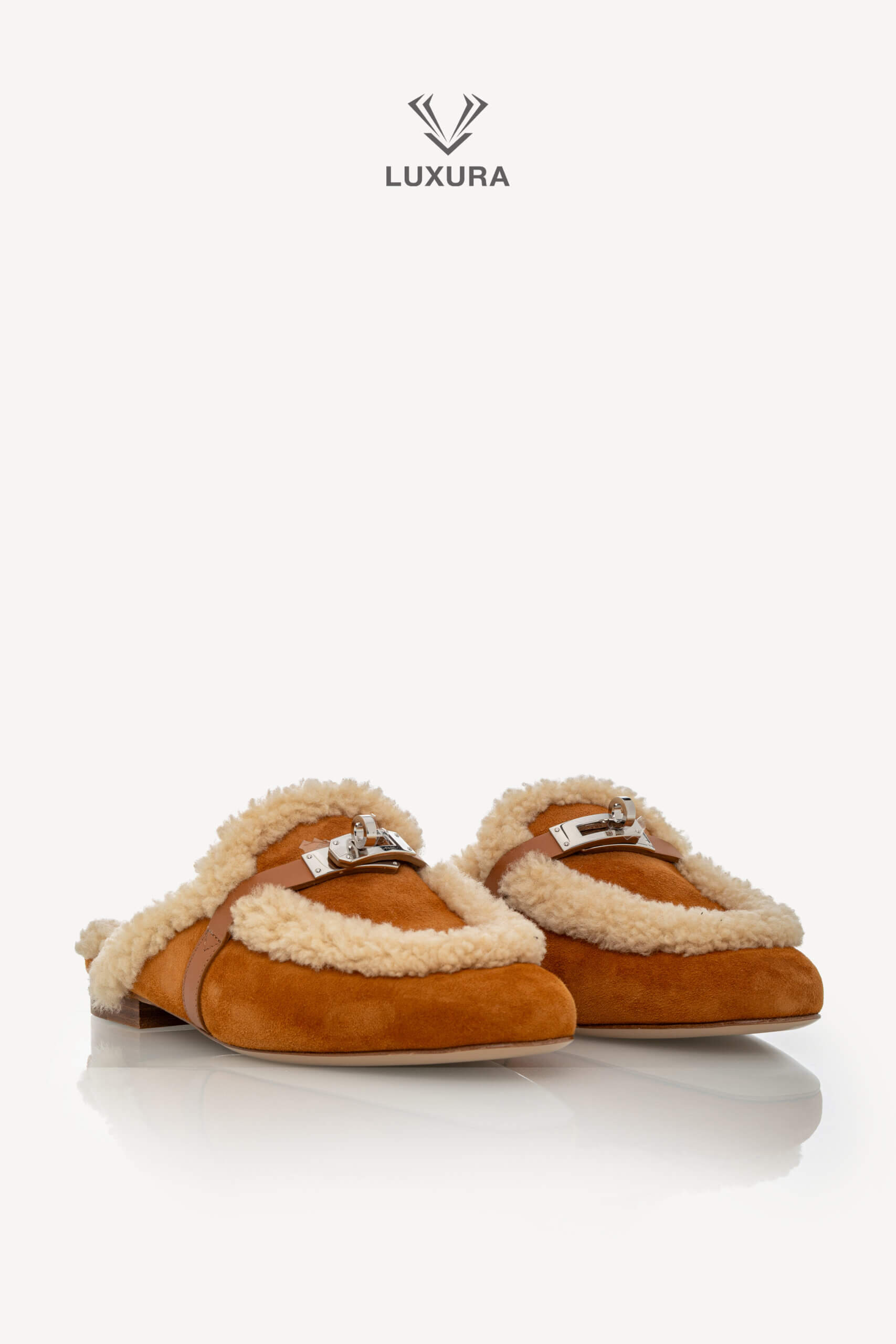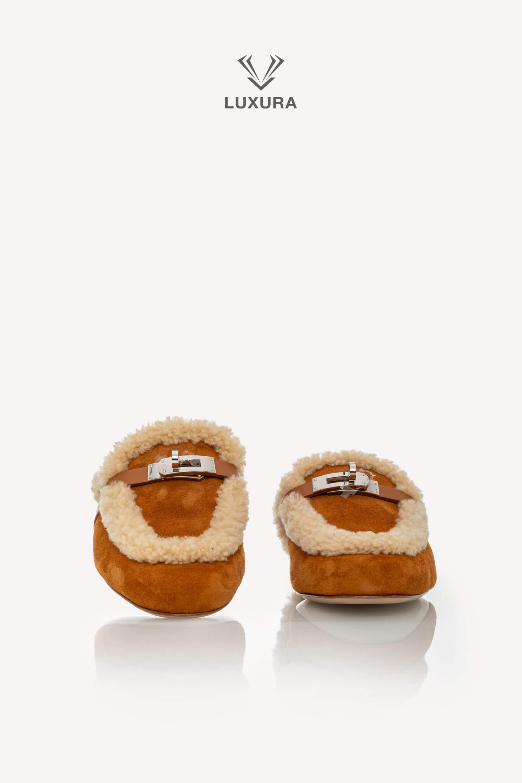 Această pereche pre-owned de mule Hermes Shearling Suede Oz, mărimea 38 (24.47 cm), este confecționată din piele de capră suede și piele de vițel, cu interior din blană shearling pentru confort și căldură. Culoarea naturel accentuează textura naturală a materialelor, iar hardware-ul argintiu adaugă un detaliu discret de rafinament. Produsul este autentic, în stare impecabilă, și este livrat cu cutia originală, dust bag și certificat de conformitate. Luxura Elite este o platformă independentă de resale, fără afiliere cu brandul Hermes.
