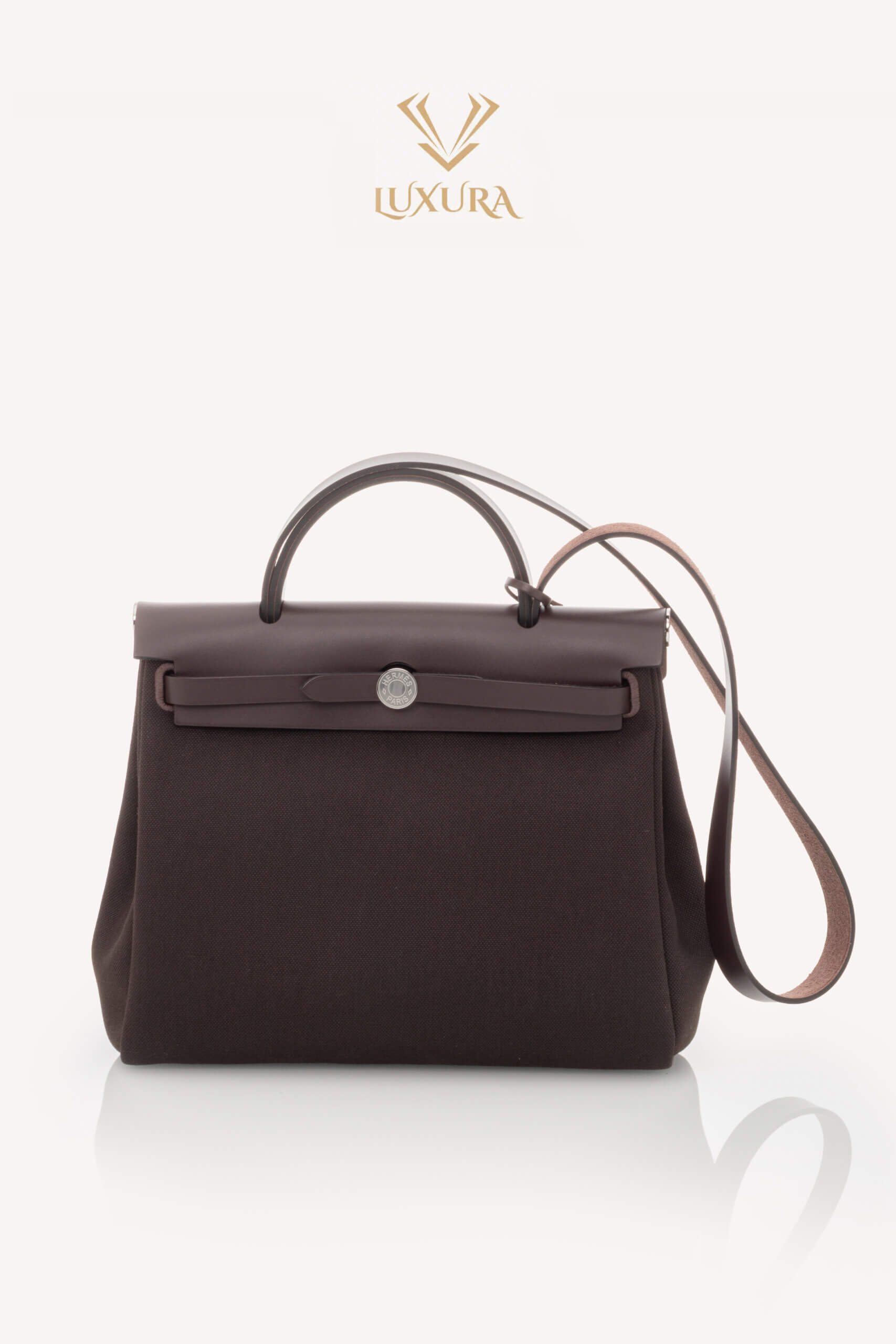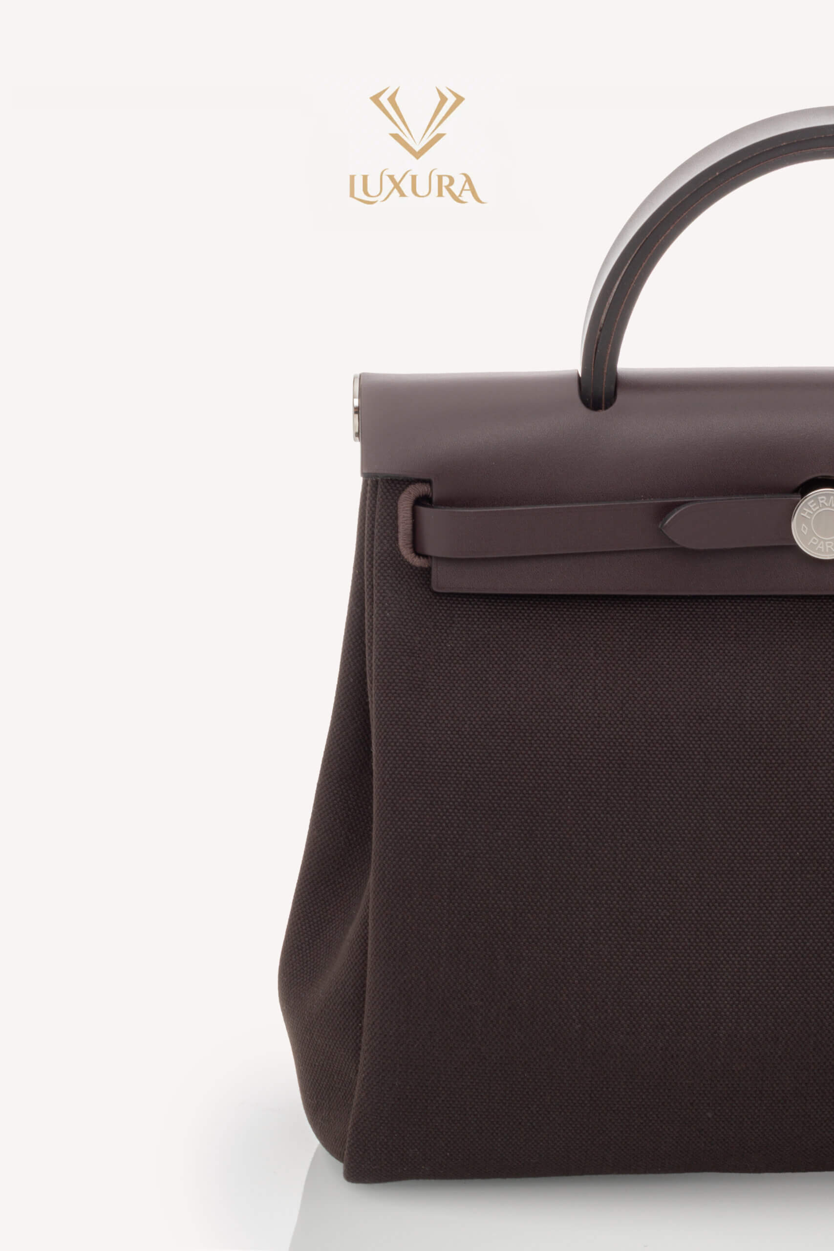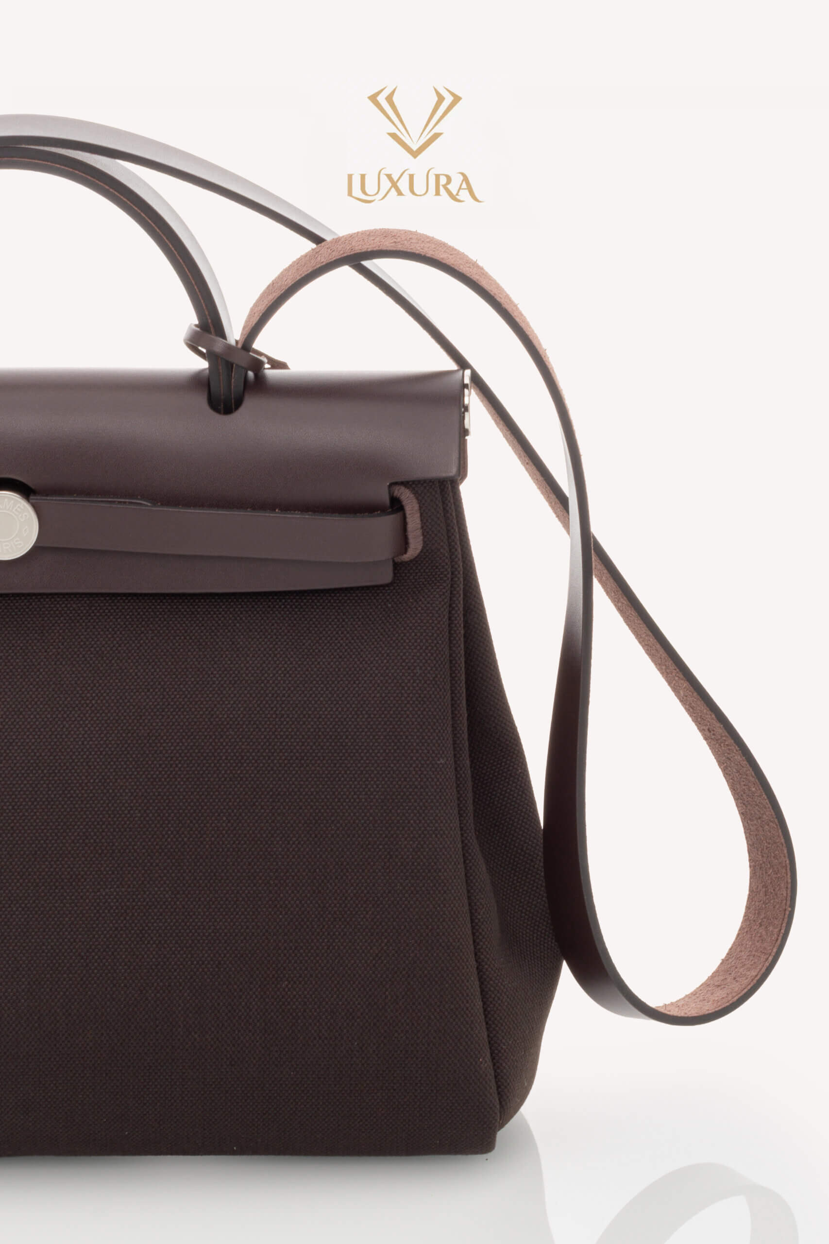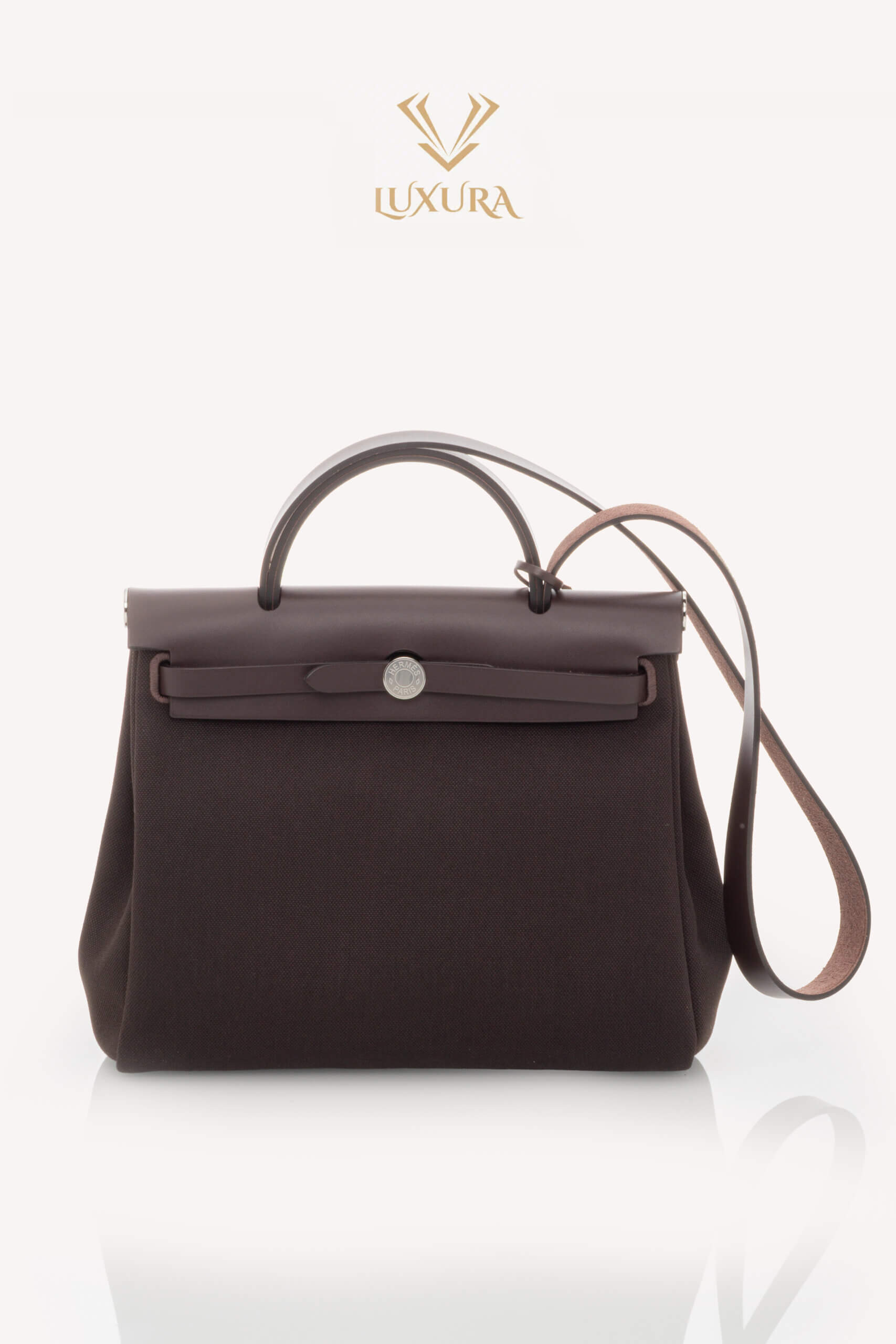 Geanta Hermes Herbag Zip RT 31 în nuanța Dark Bronze este un model de dimensiune medie, parte din colecția Herbag. Produsul este pre-owned, dar se află în stare nouă și a fost autentificat pentru a garanta originalitatea. Această geantă nu include accesorii suplimentare și este oferită prin platforma independentă Luxura Elite, care nu are nicio afiliere cu brandul Hermes. Designul său combina funcționalitatea cu un aspect sofisticat, specific liniei Herbag.