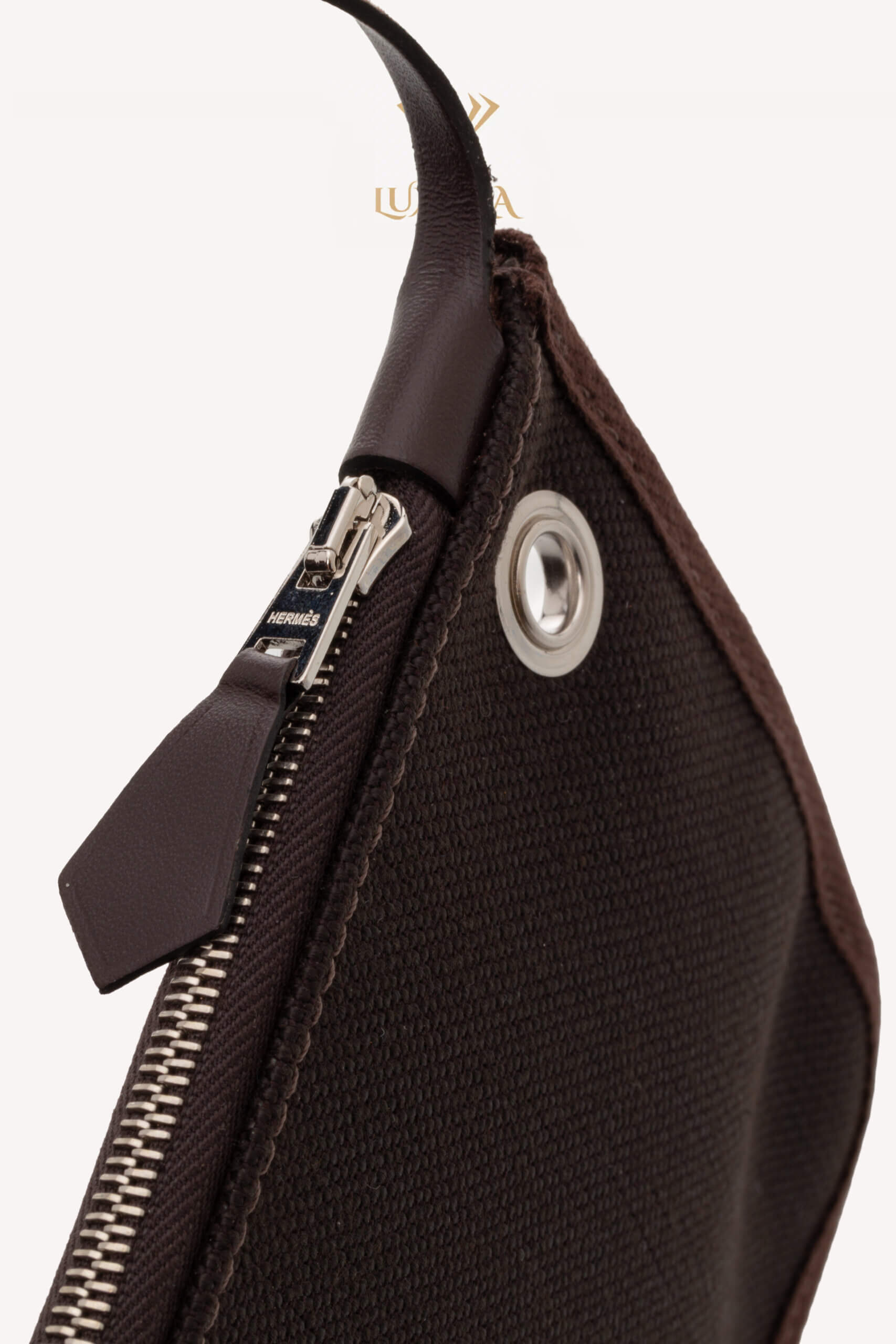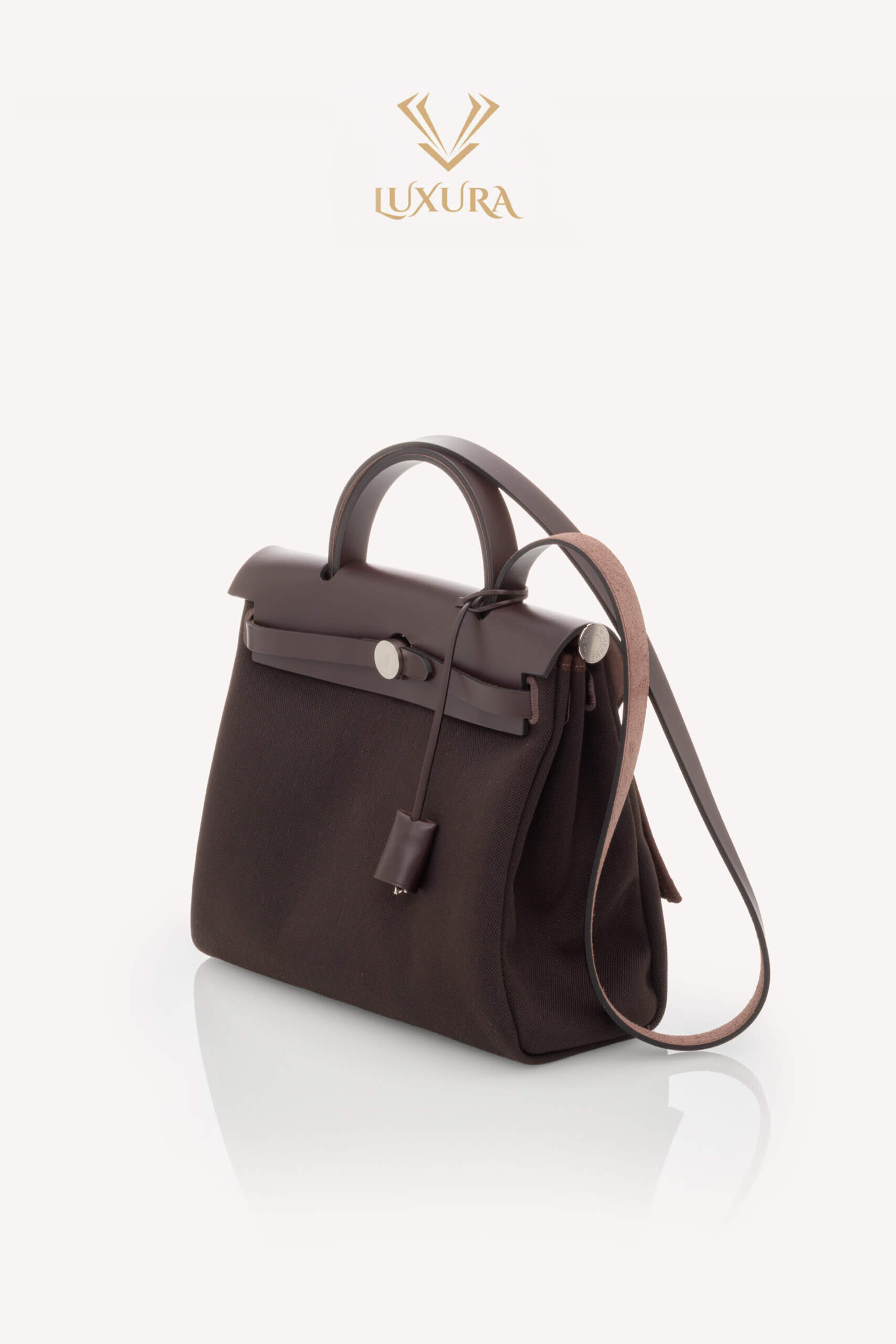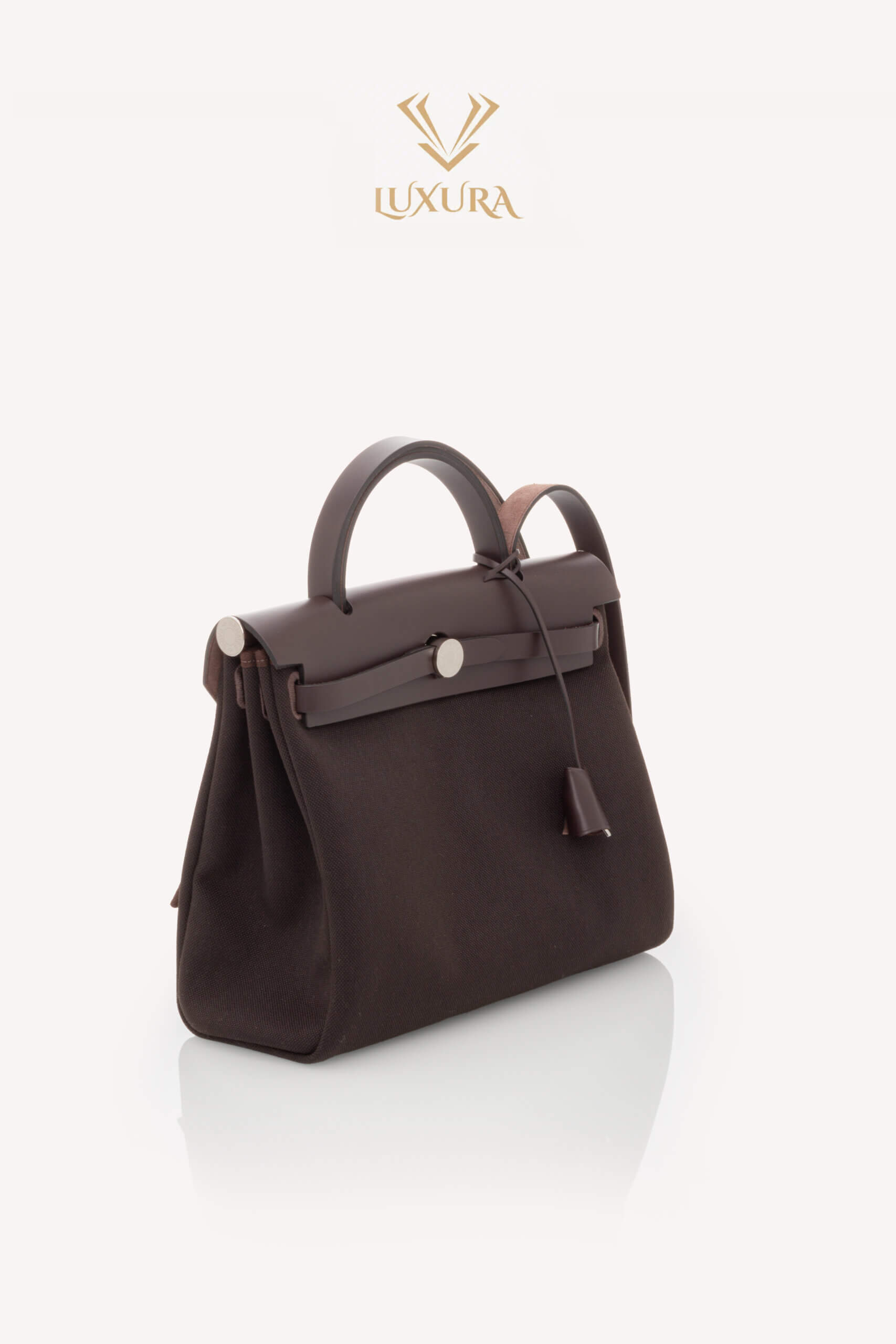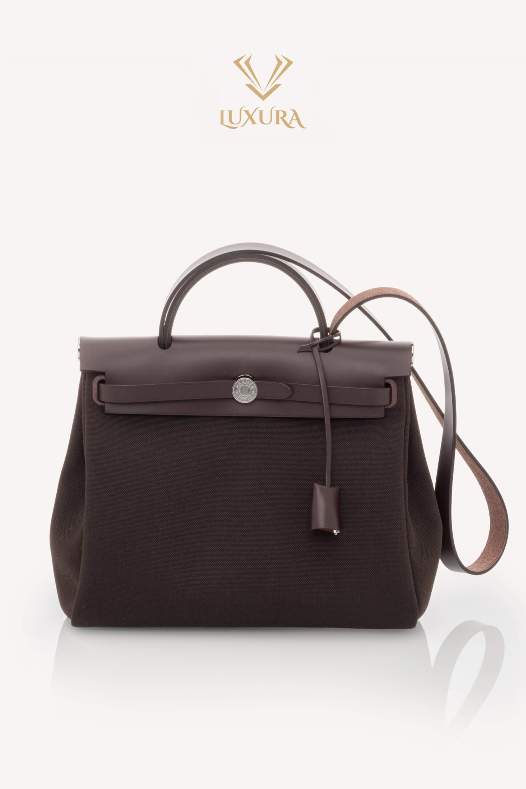 Geanta Hermes Herbag Zip RT 31 în nuanța Dark Bronze este un model de dimensiune medie, parte din colecția Herbag. Produsul este pre-owned, dar se află în stare nouă și a fost autentificat pentru a garanta originalitatea. Această geantă nu include accesorii suplimentare și este oferită prin platforma independentă Luxura Elite, care nu are nicio afiliere cu brandul Hermes. Designul său combina funcționalitatea cu un aspect sofisticat, specific liniei Herbag.