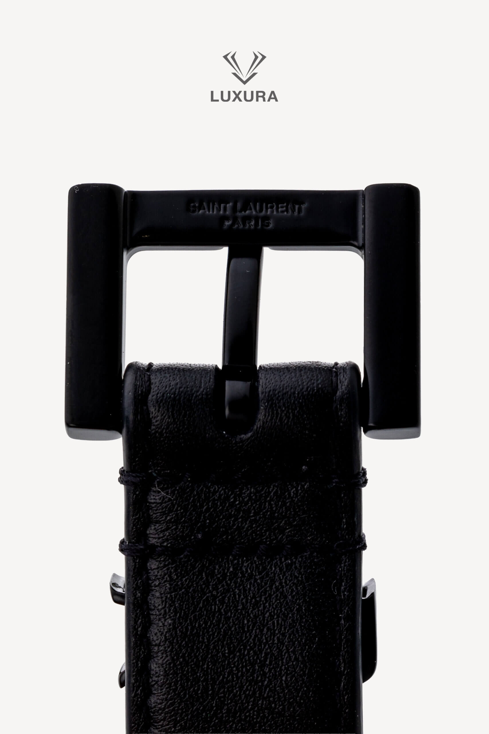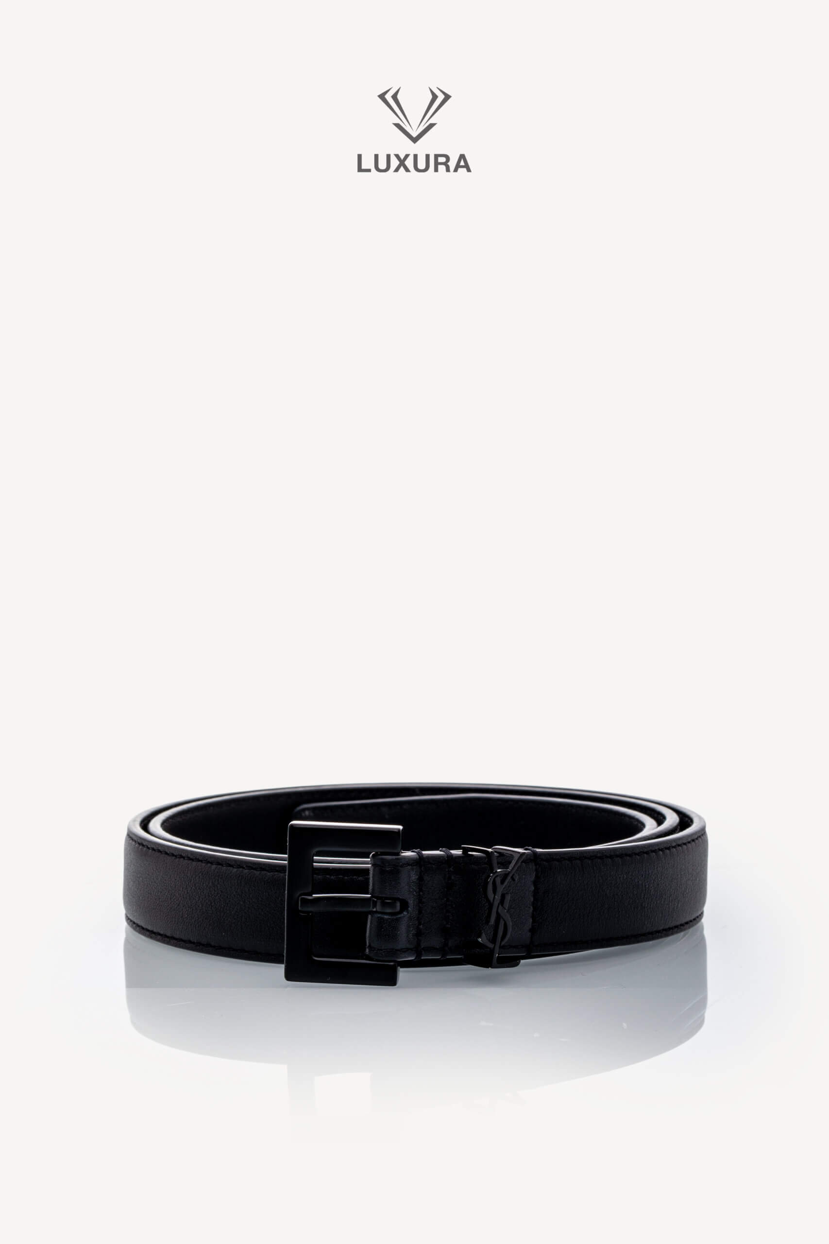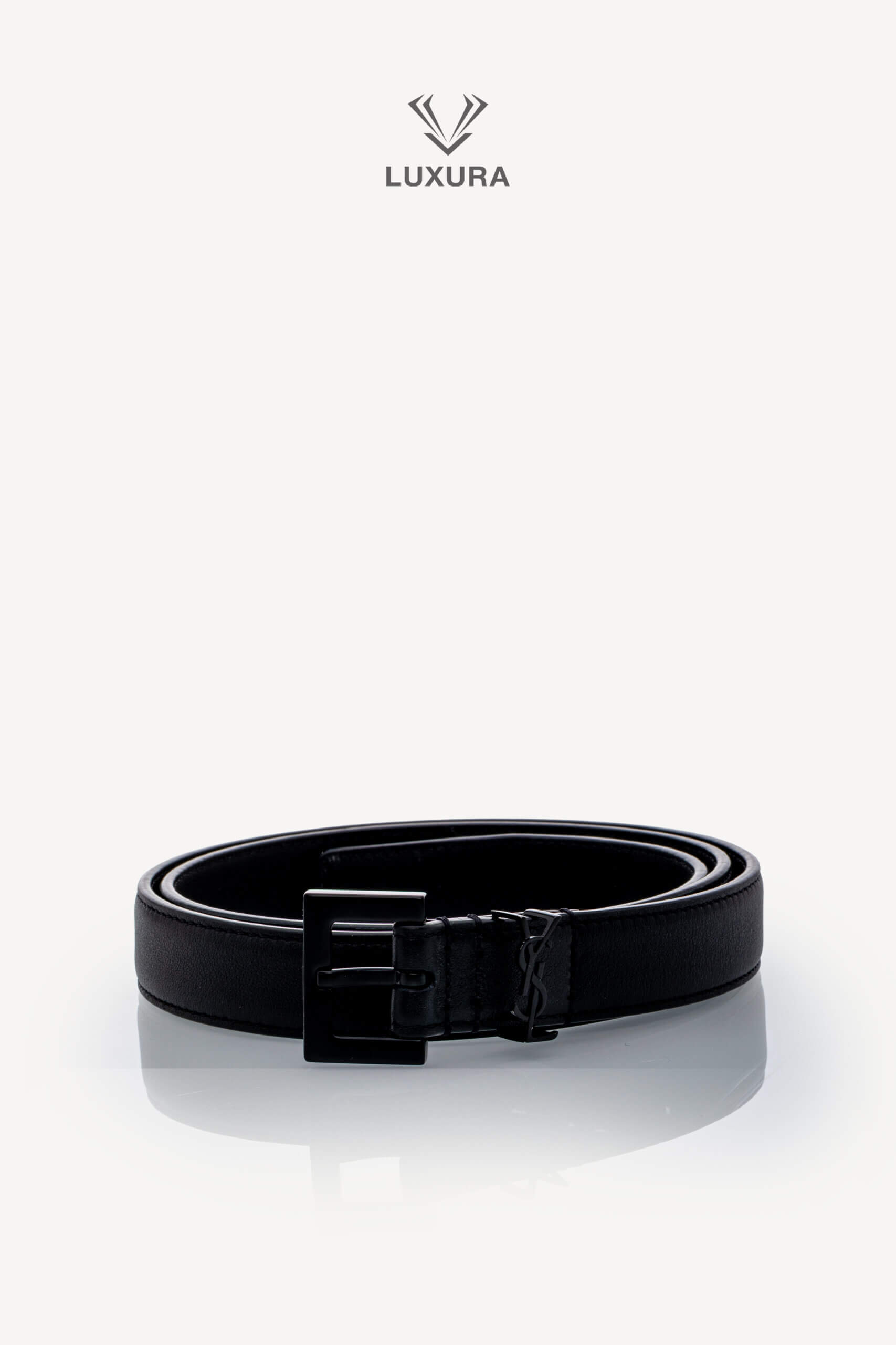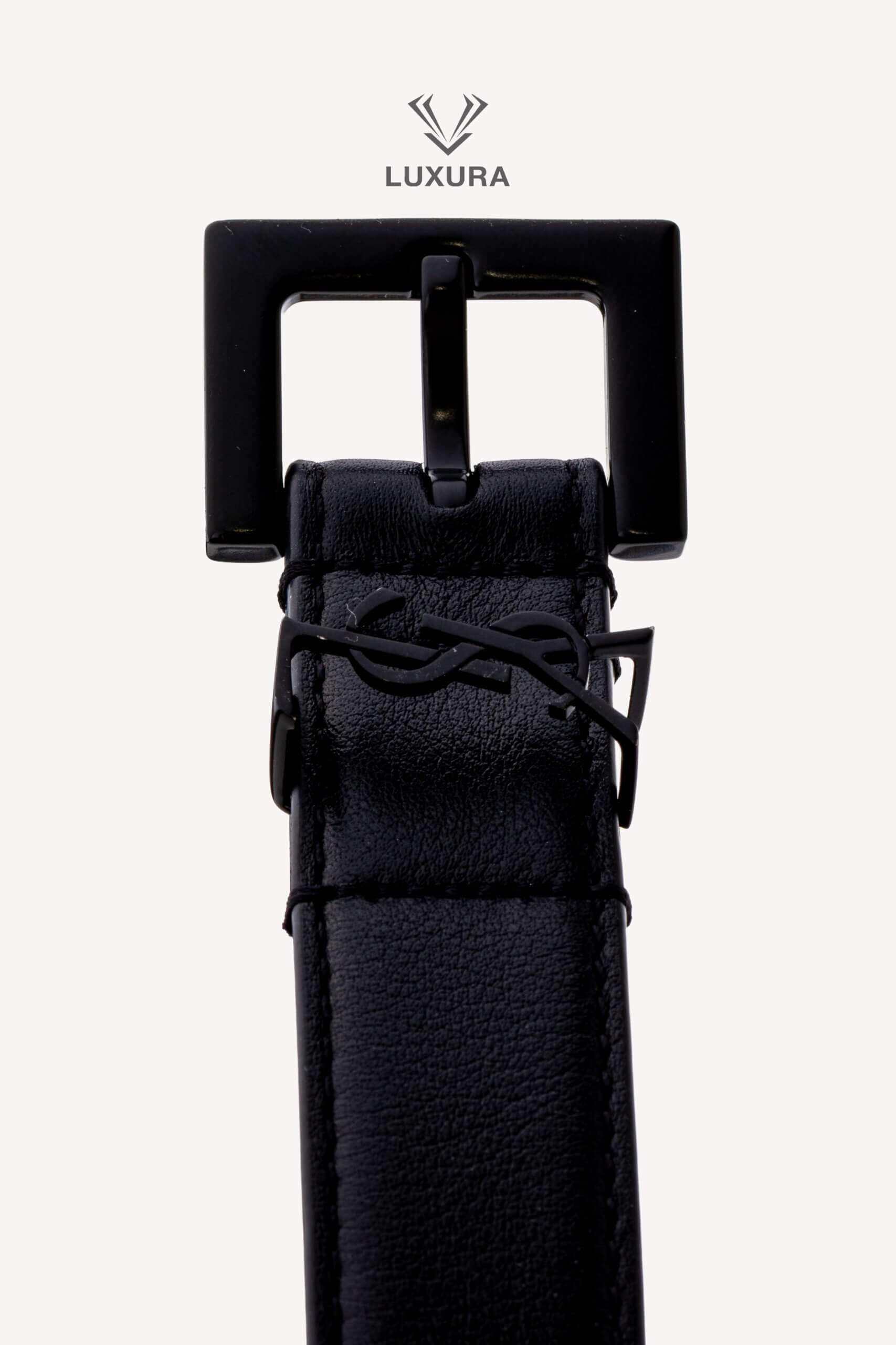 Cureaua Saint Laurent Monogram cu cataramă pătrată este confecționată din piele netedă ultramată, în culoarea negru. Măsoară 75 cm în lungime și 2 cm în lățime, fiind un accesoriu versatil pentru orice garderobă. Produsul este pre-owned, autentificat și livrat cu cutia originală și certificatul de conformitate. Luxura Elite este o platformă independentă de resale și nu este afiliată brandului Saint Laurent.