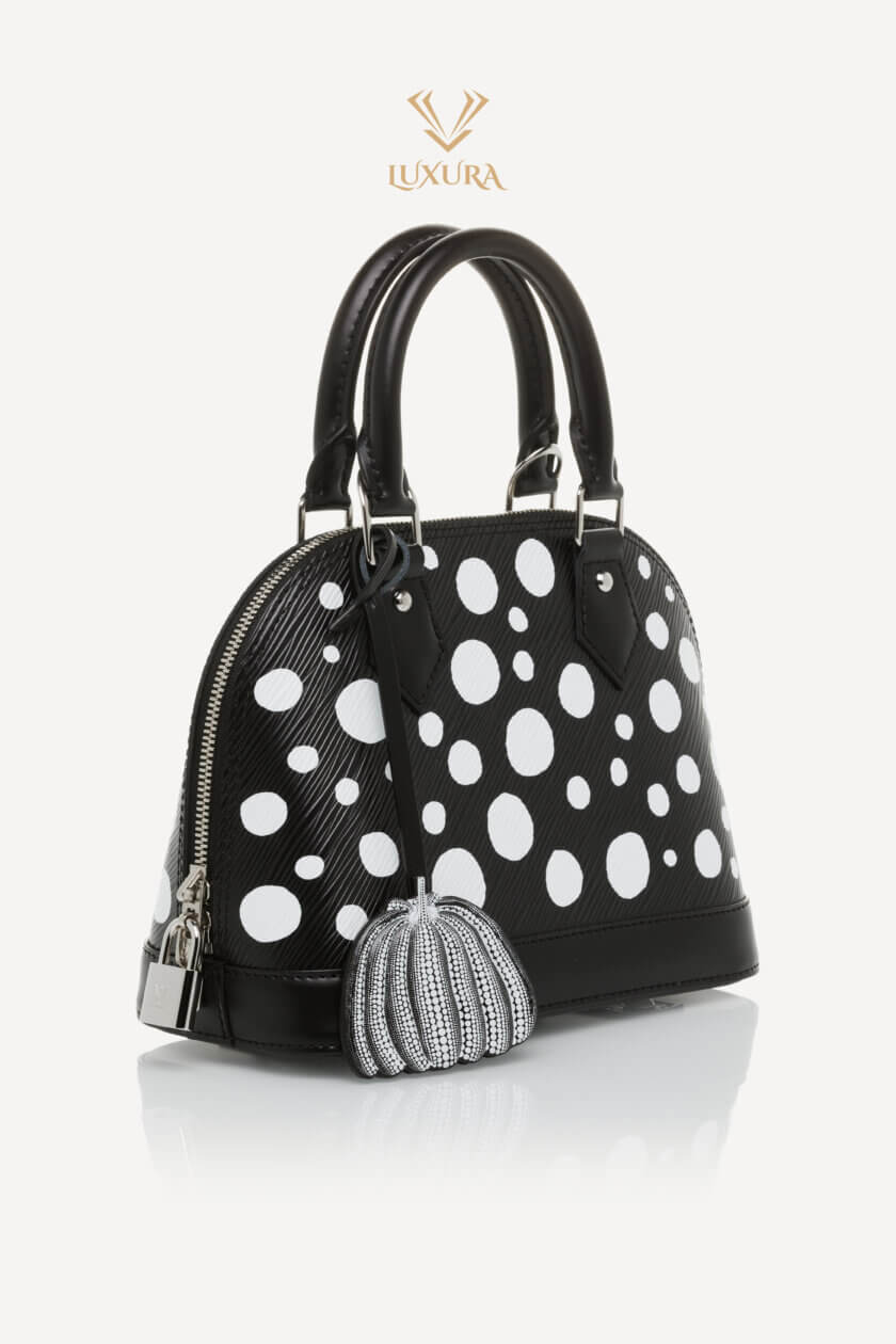 Pentru această geantă prețioasă, puncte albe orbitoare sunt imprimate pe piele de bovină Epi, accentuate cu un charm în formă de dovleac, o altă emblemă a lui Kusama.