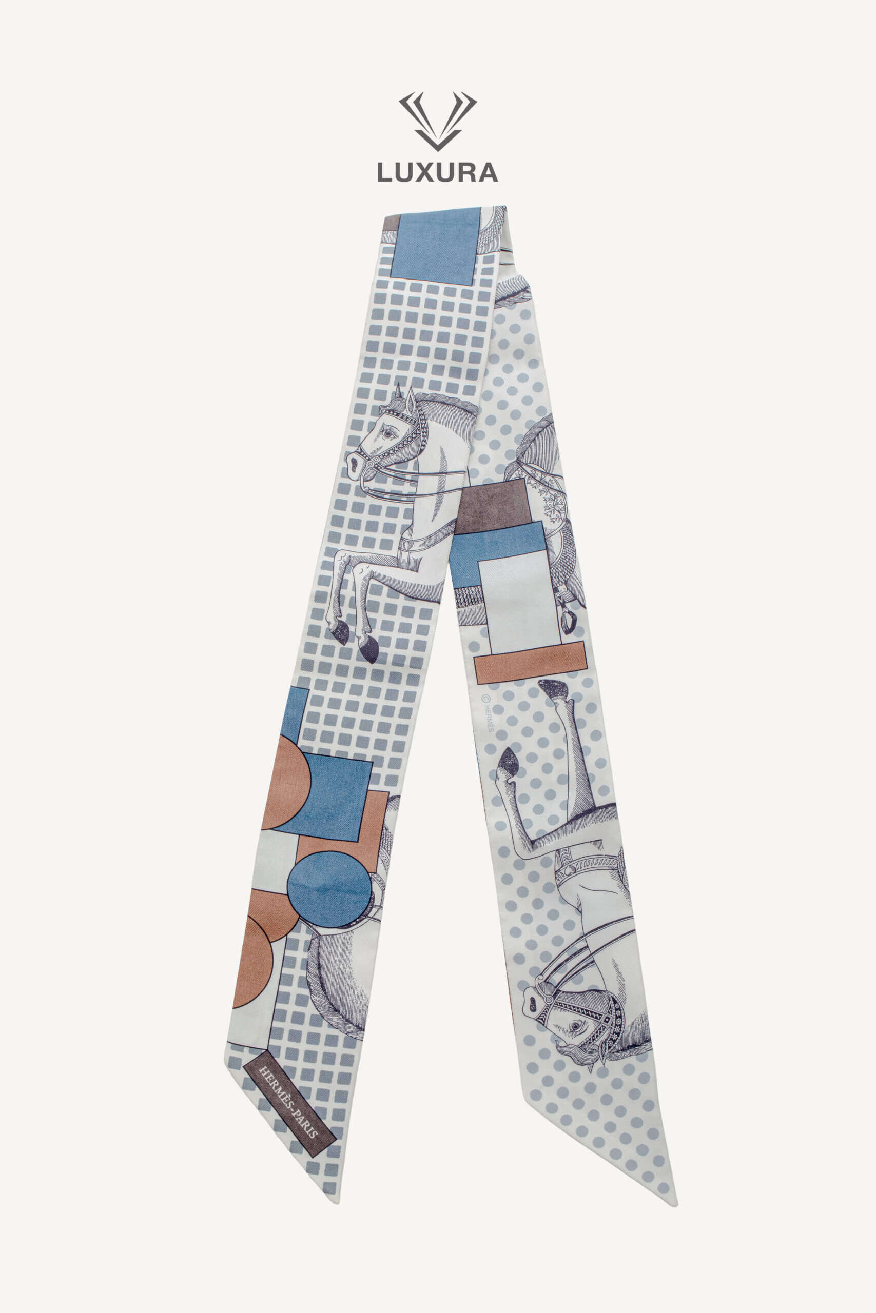 HERMES Silk Cavalier En Formes Twilly Blanc Gris Brun Alb/ Gri / Brun – Accesorii de colecție