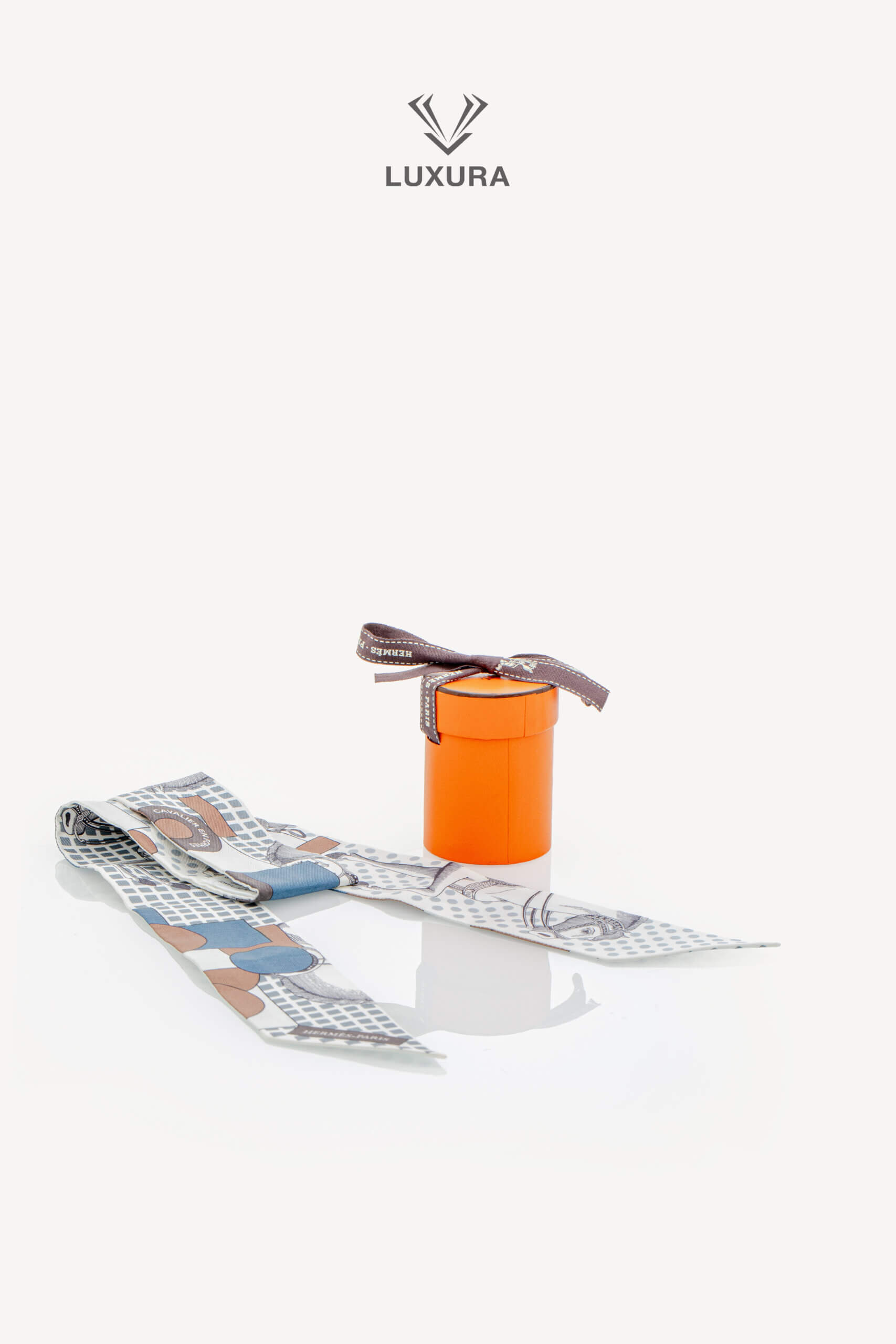 Hermès Silk Cavalier En Formes Twilly Blanc Gris Brun este un accesoriu de mătase cu dimensiunile de 85 cm lungime și 5 cm lățime. Acesta prezintă o combinație elegantă de culori alb, gri și brun, fiind livrat în cutia originală și însoțit de certificat de conformitate. Produsul este pre-owned, autentificat și păstrează starea nouă, disponibil în cadrul Luxura Boutique. Luxura Elite este o platformă independentă de resale, fără afiliere cu brandul Hermès.