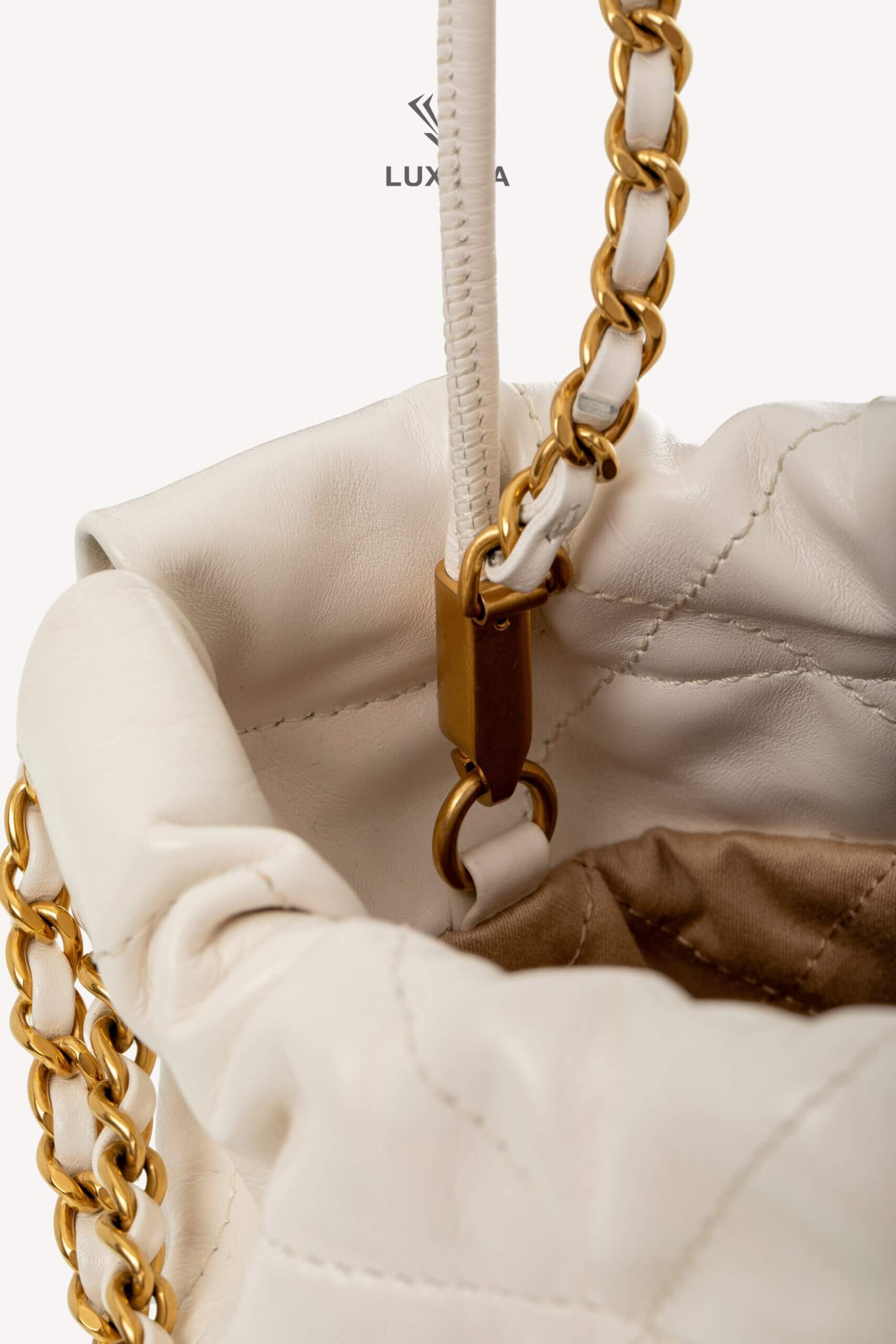 Geanta Mini Chanel 22 Shinny Calfskin Quilted este confecționată din piele albă și material textil bej la interior, având dimensiunile 19 cm lățime, 20 cm lungime și 6 cm adâncime. Accesoriile din metal auriu completează designul elegant, iar produsul este livrat cu cutia originală, dust bag-ul, factura și certificatul de conformitate. Acest model pre-owned se află într-o stare impecabilă, fără defecte, și a fost autentificat pentru a garanta calitatea. Luxura Elite este o platformă independentă de resale și nu este afiliată brandului CHANEL.