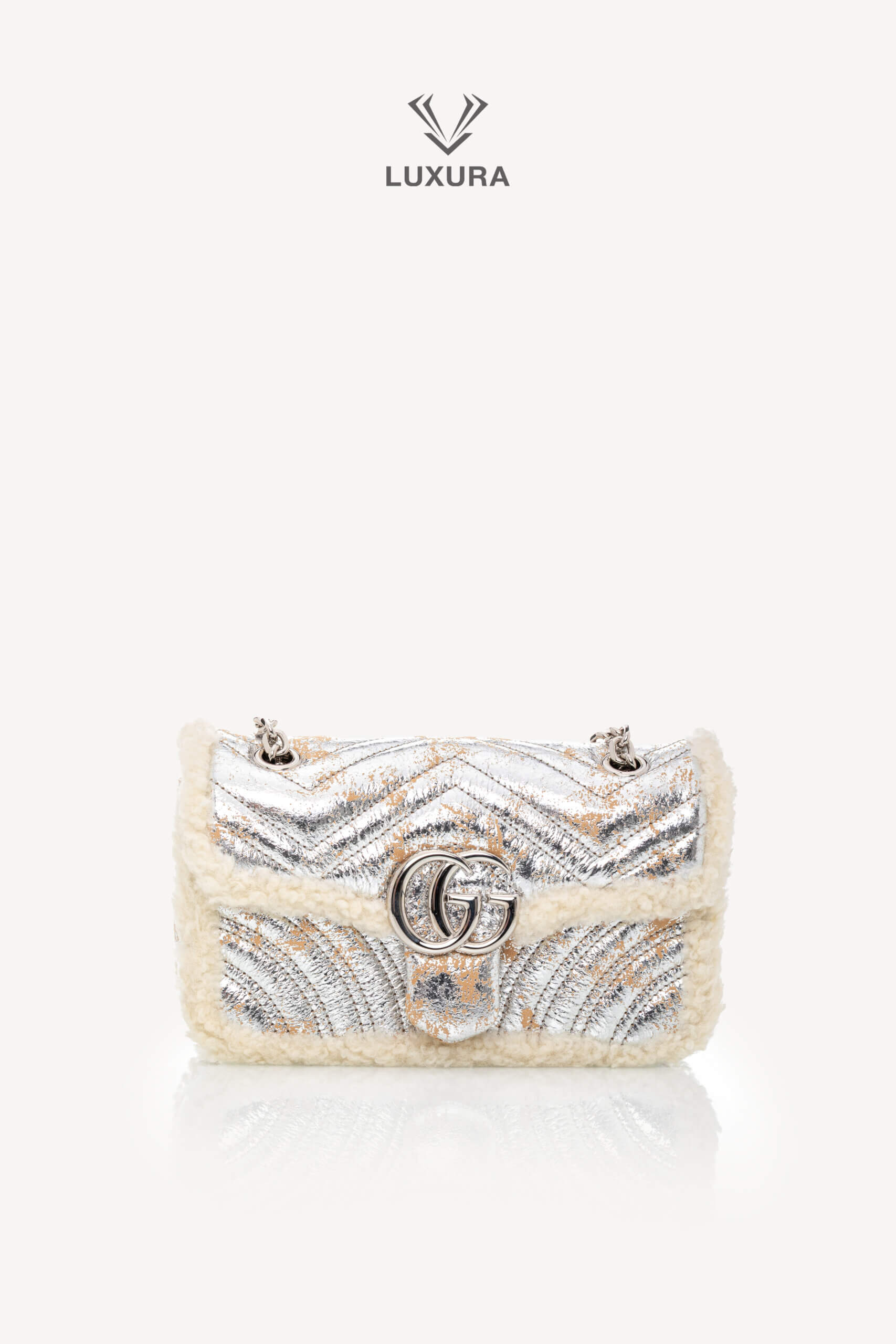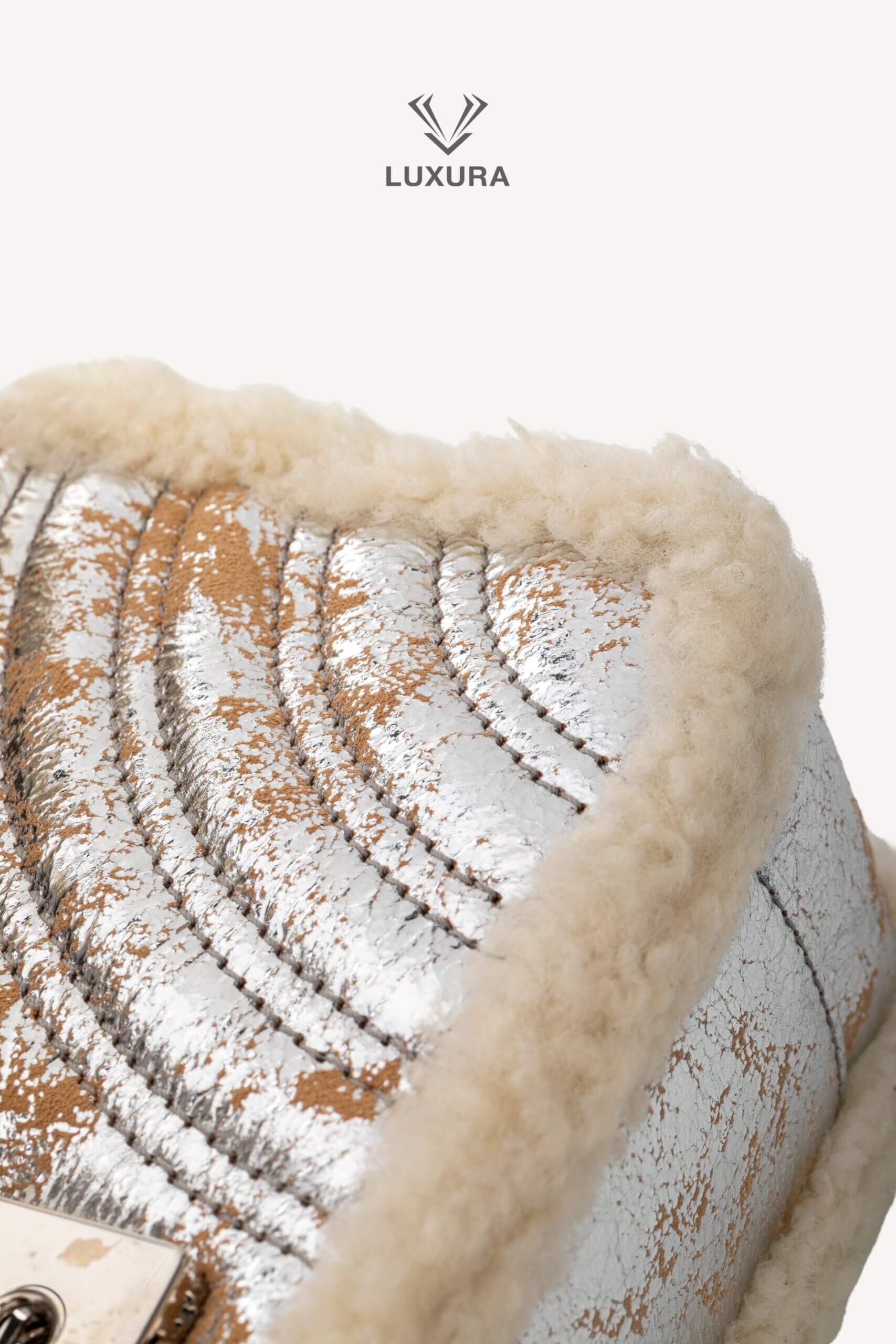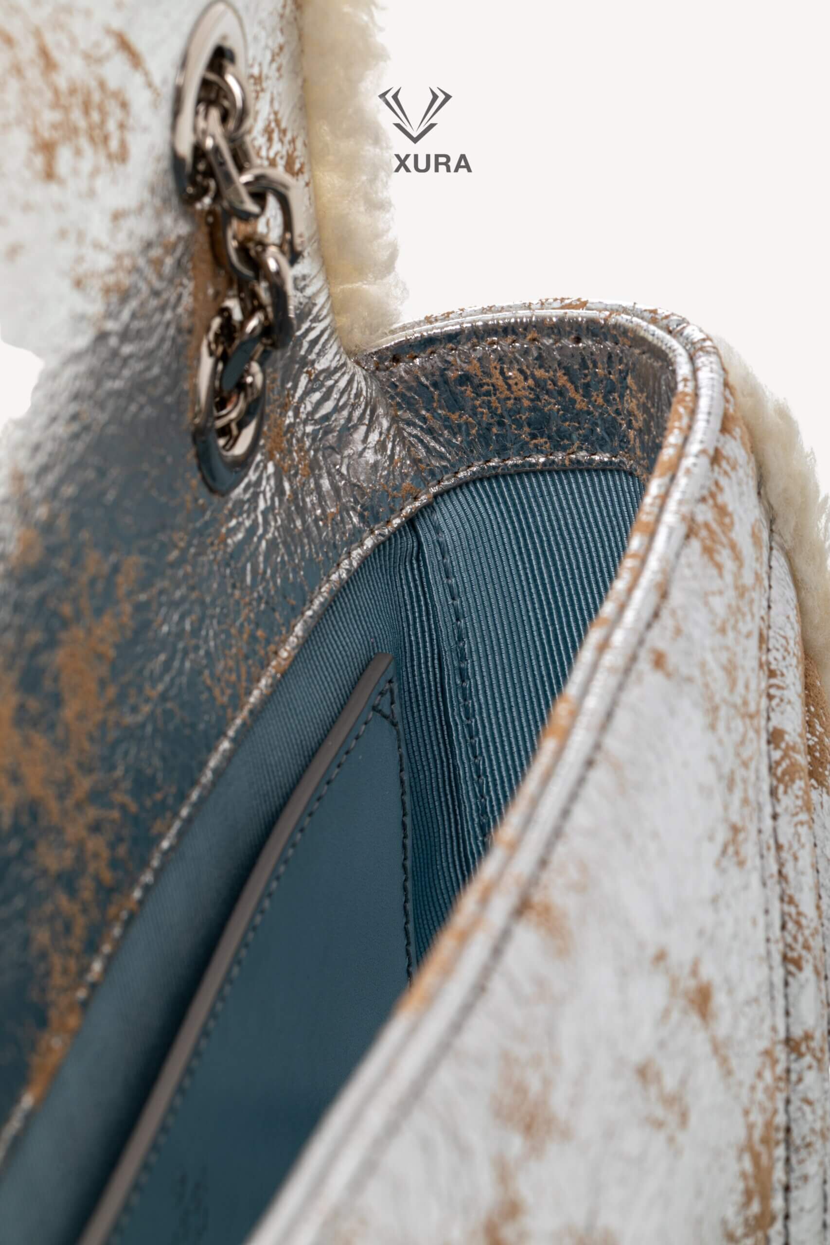 Geanta GUCCI GG Marmont Medium Metallic Leather Shoulder Bag este confecționată din piele de miel argintie și material textil albastru la interior. Dimensiunile sale medii sunt 21 cm lungime, 13 cm înălțime și 6 cm adâncime, fiind echipată cu hardware argintiu. Produsul este pre-owned, autentificat și vine însoțit de cutia Luxura, dust bag, factură și certificat de conformitate. Starea este impecabilă, iar modelul face parte din colecția actuală GUCCI, disponibil prin Luxura Boutique, o platformă independentă de resale, neafiliată brandului GUCCI.